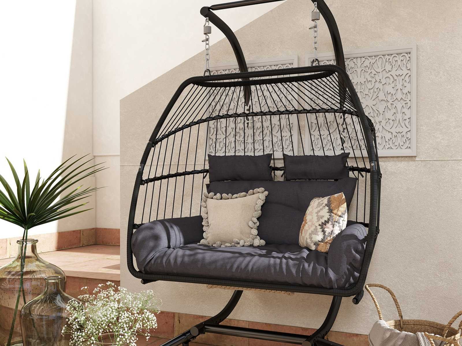 Specificatie: • Kleur: Donkergrijs • Materialen: Staal, PE-rotan, polyester, PP-katoen • Totale afmetingen: 66,9"B x 39,4"D x 72,8"H (170 x 100 x 185 cm) • Mandafmetingen: 50,4"B x 26,8"D x 41,7"H (128 x 68 x 106 cm) • Mandhoogte tot vloer: 52 cm (20,5") • Opgevouwen mand Afmetingen: 50,4"B x 5,5"D x 44,1"H (128 x 14 x 112 cm) • Zitafmetingen: 106 x 60 cm (41,7" breed x 23,6" • Achterafmetingen: 93 x 85 cm (36,6"B x 33,5"H) • Metalen kettinglengte: 12 cm (4,7") • Kussenafmetingen: 47,2"B x 59,1"B x 3,9"D (120 x 150 x 10 cm) • Hoofdsteunafmetingen: 11,8" breed x 7,9" H x 4,7"D (30" x 20 x 12 cm) • Laadcapaciteit: 260 kg (573 lbs) Non