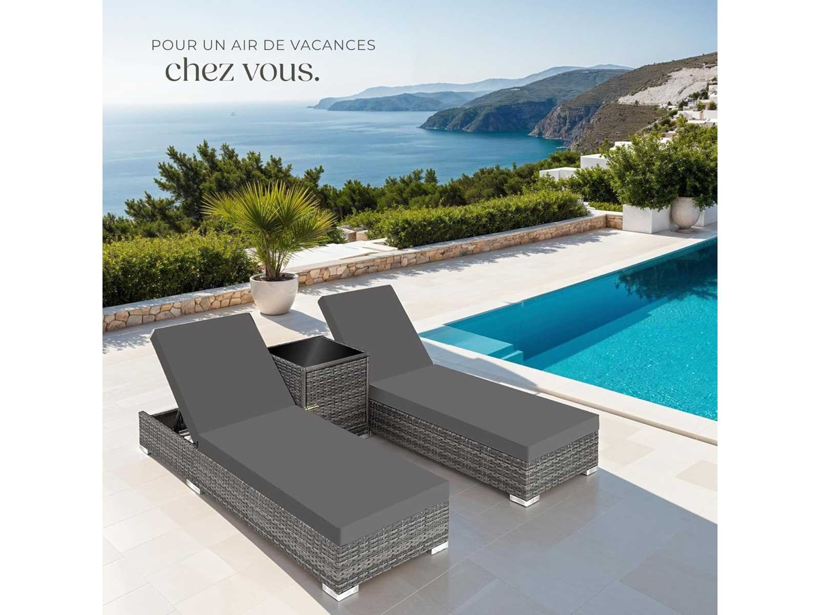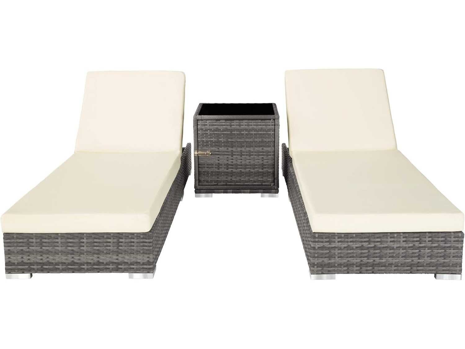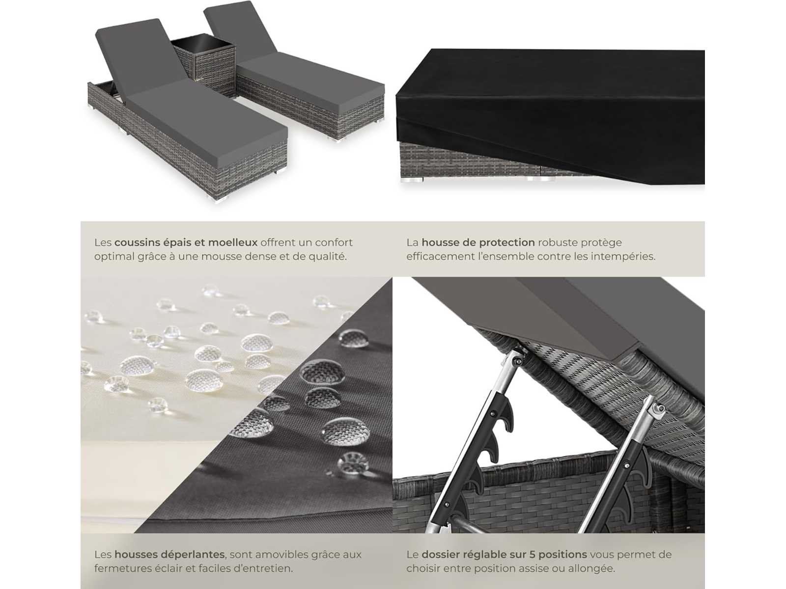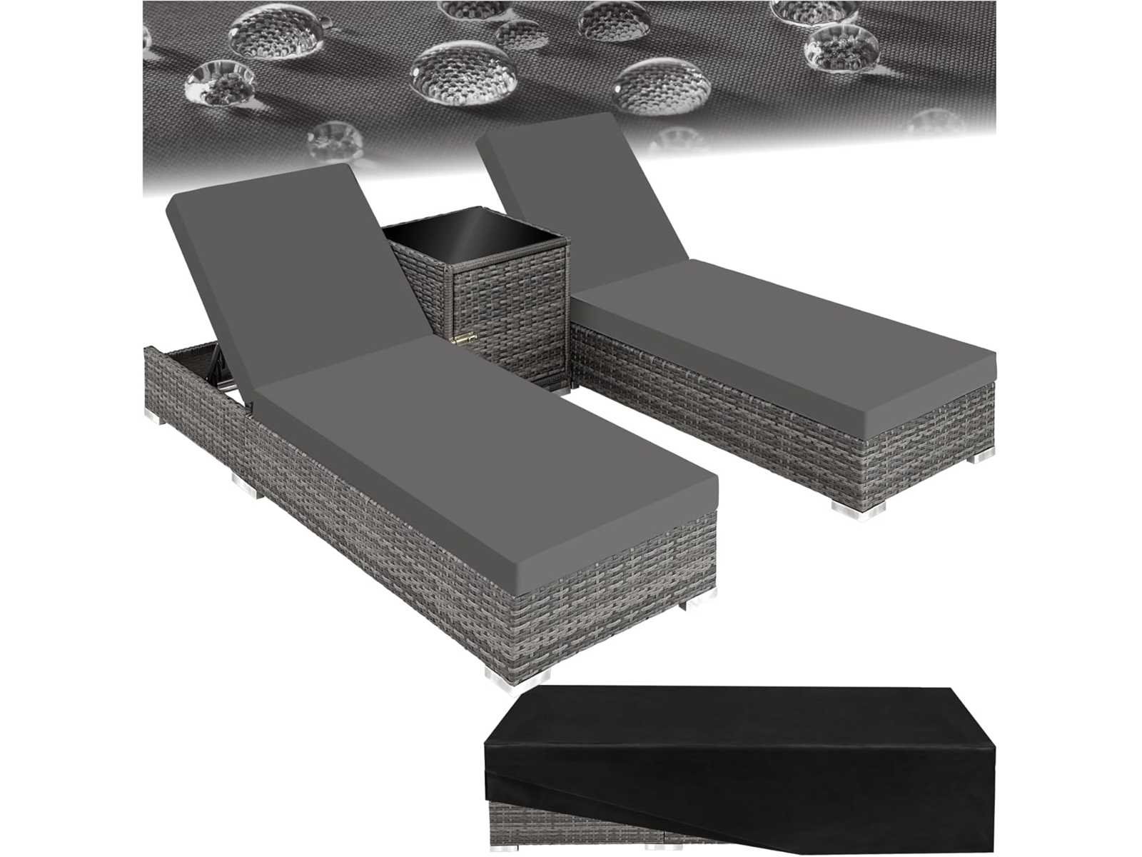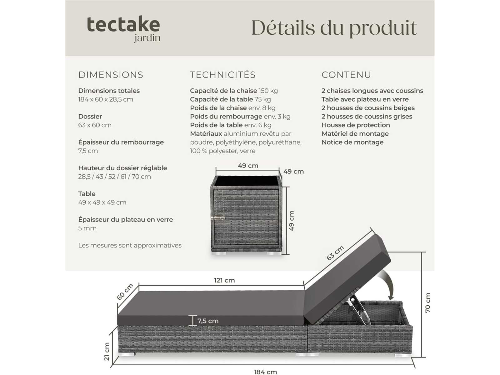 Technische gegevens Gewicht van de zonnebank: ca. 7,8 kg Gewicht van de vulling: ca. 3,0 kg Laadvermogen voor zonnebedden: 150 kg Tafel draagvermogen: 75 kg Materialen: aluminium, polyethyleen, polyurethaan, polyester, glas Grootte Totale afmetingen van de ligstoel (LxWxH): ca. 184 x 60 x 21 cm Dikte van de vulling: ca. 7,5 cm Rugleuning (breedtebolle): ca. 60 x 63 cm Totale afmetingen van de tafel (LxWxH): ca. 49 x 49 x 49 cm Glasplaatdikte: ongeveer 0,5 cm Verstelbare rugsteunhoogtes: ca. 28,5 cm / ca. 43 cm / ca. 52 cm / ca. 61 cm / ca. 70 cm. Reikwijdte van levering 2 hars-ligstoelen met matrassen 2 beige covers 2 grijze covers 1 tafel met glazen oppervlak 1 beschermhoes voor ligstoelen (stapelen) 1 beschermkap voor de tafel 1 Montage-instructies Non