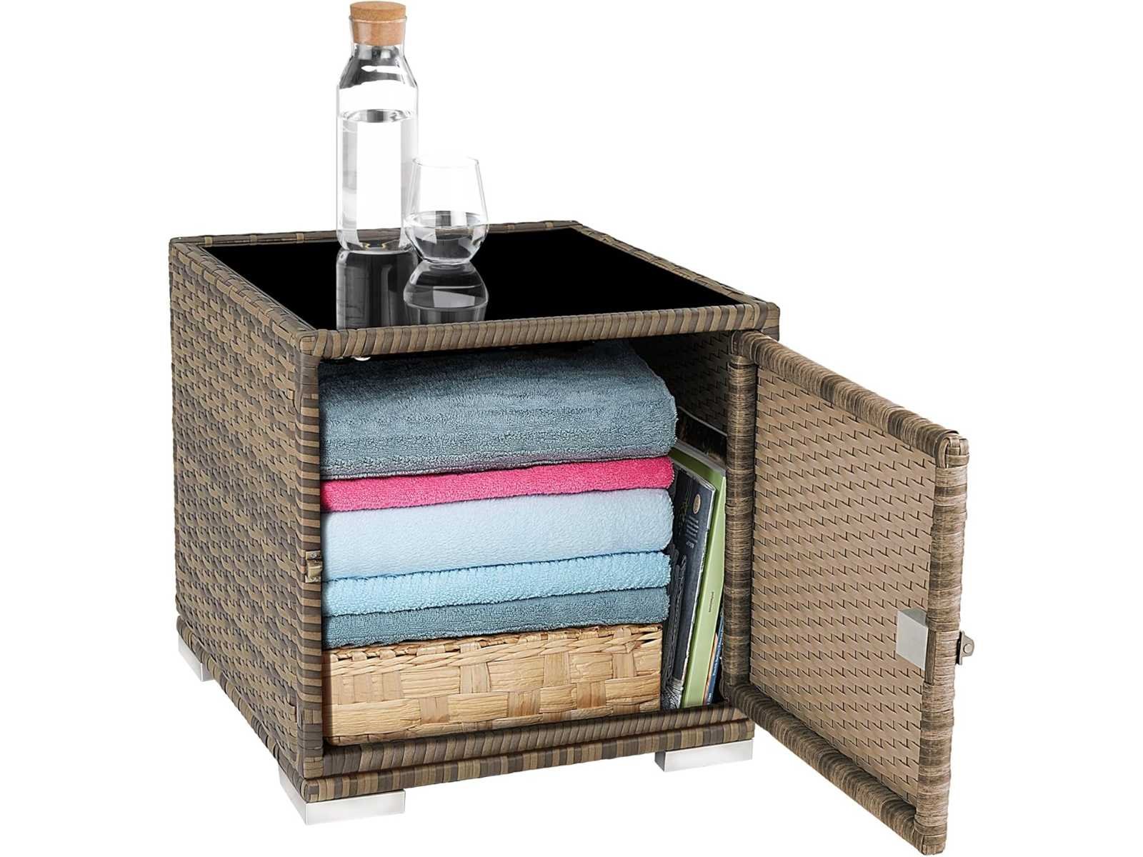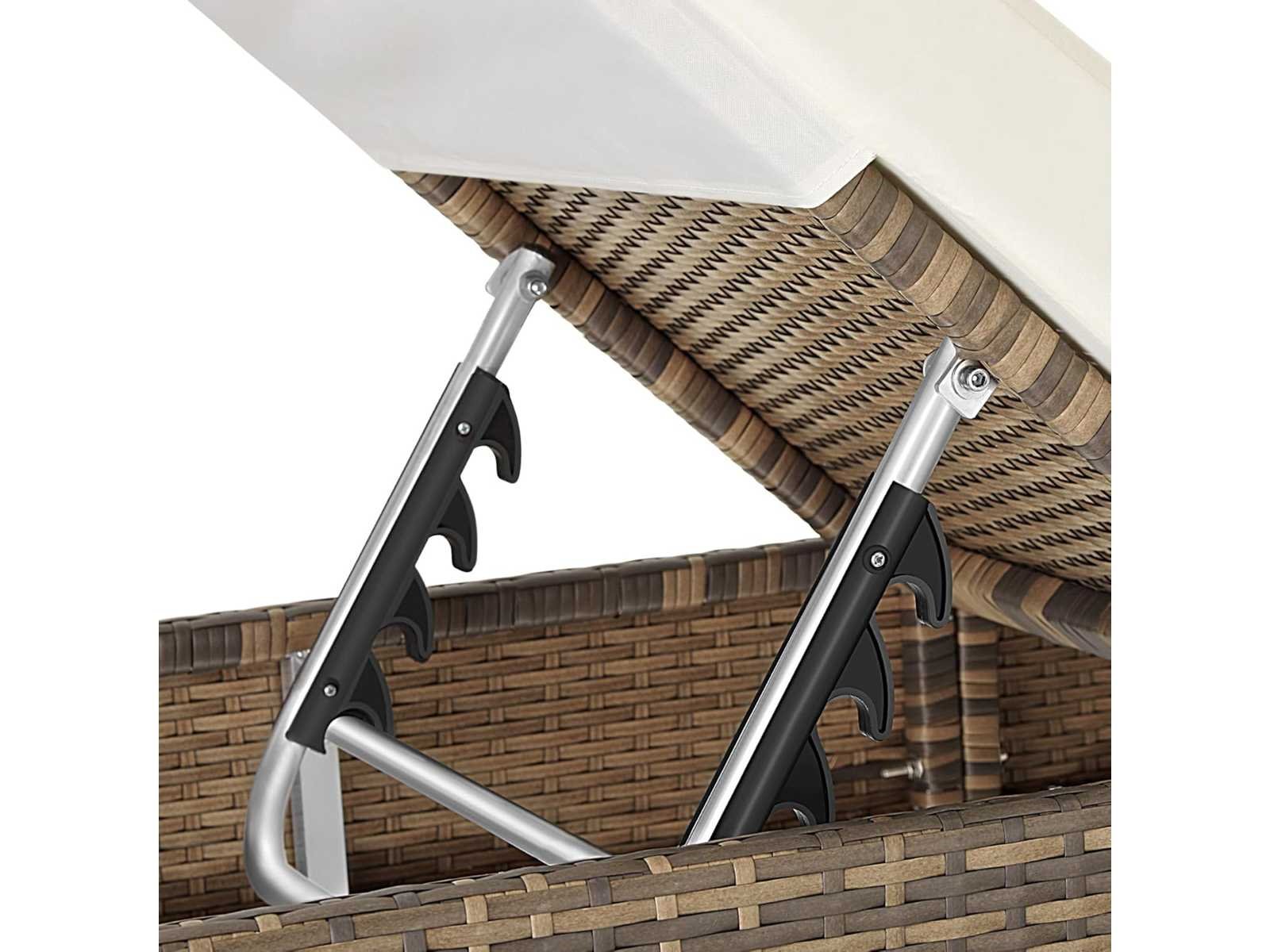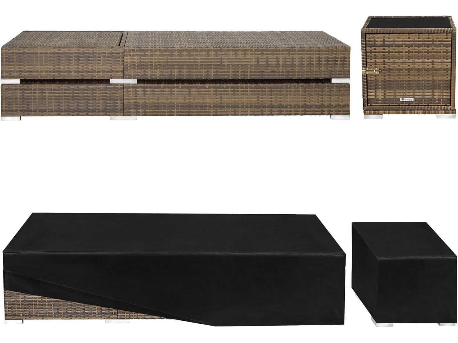 Technische details: Chaise longue (L x W x H): ca. 184 x 60 x 21 cm - Rugleuning (L x W): ca. 63 x 60 cm. Bekledingsdikte: 7,5 cm - Gewicht / ligstoel: ca. 7,8 kg - Gewicht / bekleding: ca. 3 kg - Materiaal: aluminium frame, poly rattan vlecht, 100% polyester vulling, maximale belasting: ca. 150 kg - Tafel (L x B x H): ca. 49 x 49 x 49 cm - Materiaal: aluminium ondergrond, poly geweven rotan. Glasplaat: ongeveer 5 mm. Verstelbare rugleuning. Niveau 1 (horizontaal met vulling): Hoogte: ca. 28,5 cm - Niveau 2: Hoogte: ca. 43 cm. Niveau 3: Hoogte: ca. 52 cm - Niveau 4: Hoogte: ca. 61 cm - Niveau 5: Hoogte: ca. 70 cm. Tevreden: 2 aluminium rotan loungestoelen met bekleding - 2 beige hoezen - 2 grijze kussens - 1 tafel met glazen oppervlak - 1 hoes voor 2 ligstoelen - 1 tafelhoes - 1 montage-instructie Non