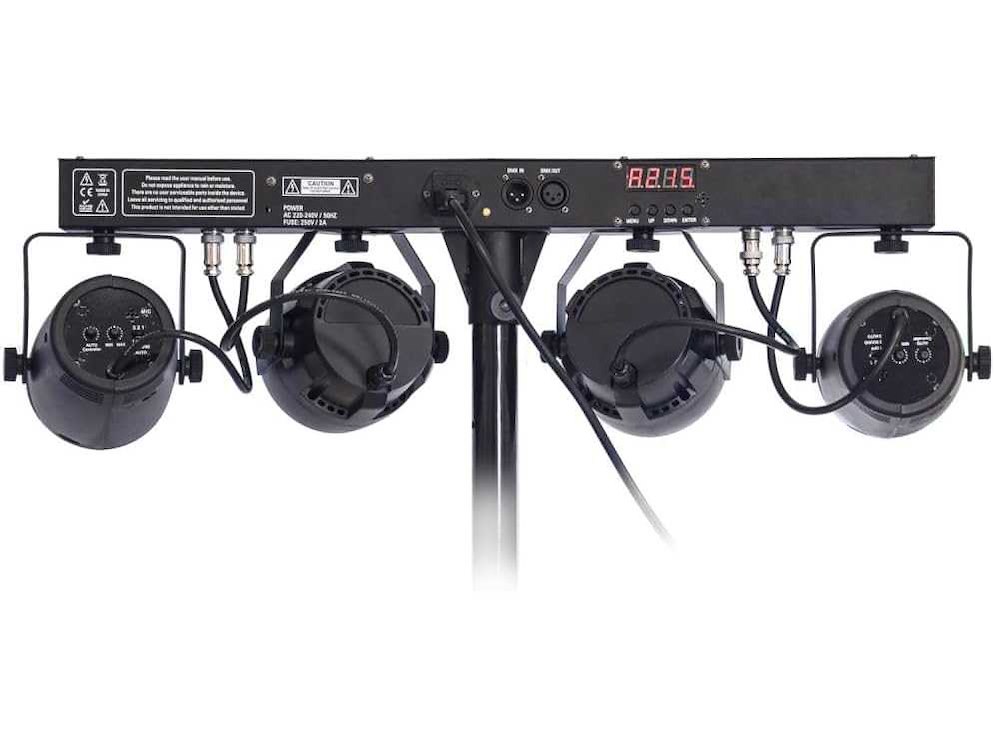 Het pakket bestaat uit de volgende elementen: 2 PAR-projectoren, elk met 12 1W RGBW LED's 2 Maanbloem RGBWA LED De kruisbalk die de apparaten van stroom voorziet Besturing: DMX (9/19 kanalen), master slave, automatische en afstandsbediening Afstandsbediening Zwarte standaard met antislipvoeten 4 meter aan stroomkabel DMX-signaalkabel vooraf geïnstalleerd op alle 4 de projectoren Non