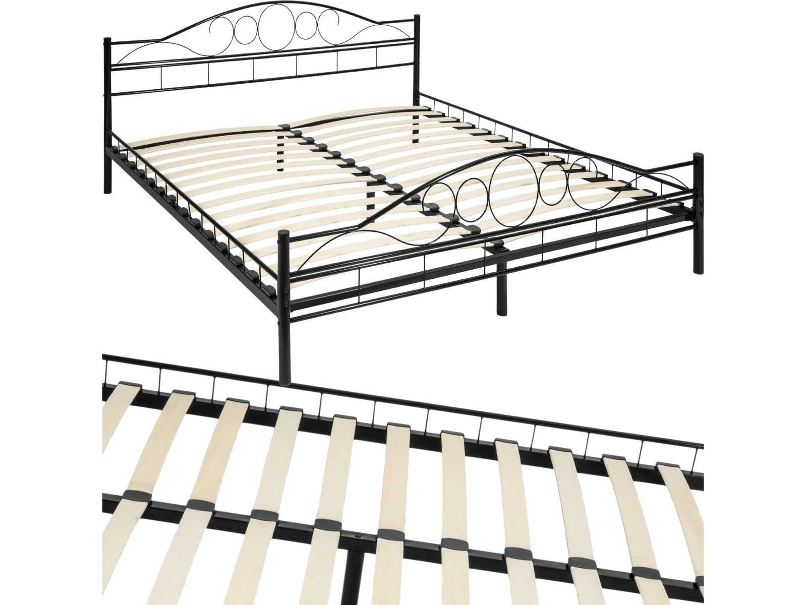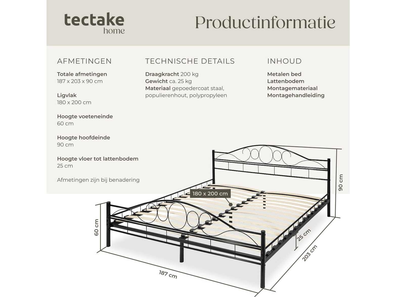 Technische details: Totale afmetingen (BxDxH) ca. 187 x 203 x 90 cm Ligoppervlak (BxD): ca. 180 x 200 cm Hoofdbordhoogte: ca. 90 cm Voetsteunhoogte: ca. 60 cm Hoogte van de lattenbasis boven de vloer: ca. 23 cm Breedte en dikte van de bedlatten: ca. 5,6 0 0,9 cm Afstand tussen de latten van het bed: ongeveer 9,5 cm Laadvermogen: 250 kg Gewicht ca. 25 kg Materiaal: poedergecoat staal, kunststof, populierhout Non