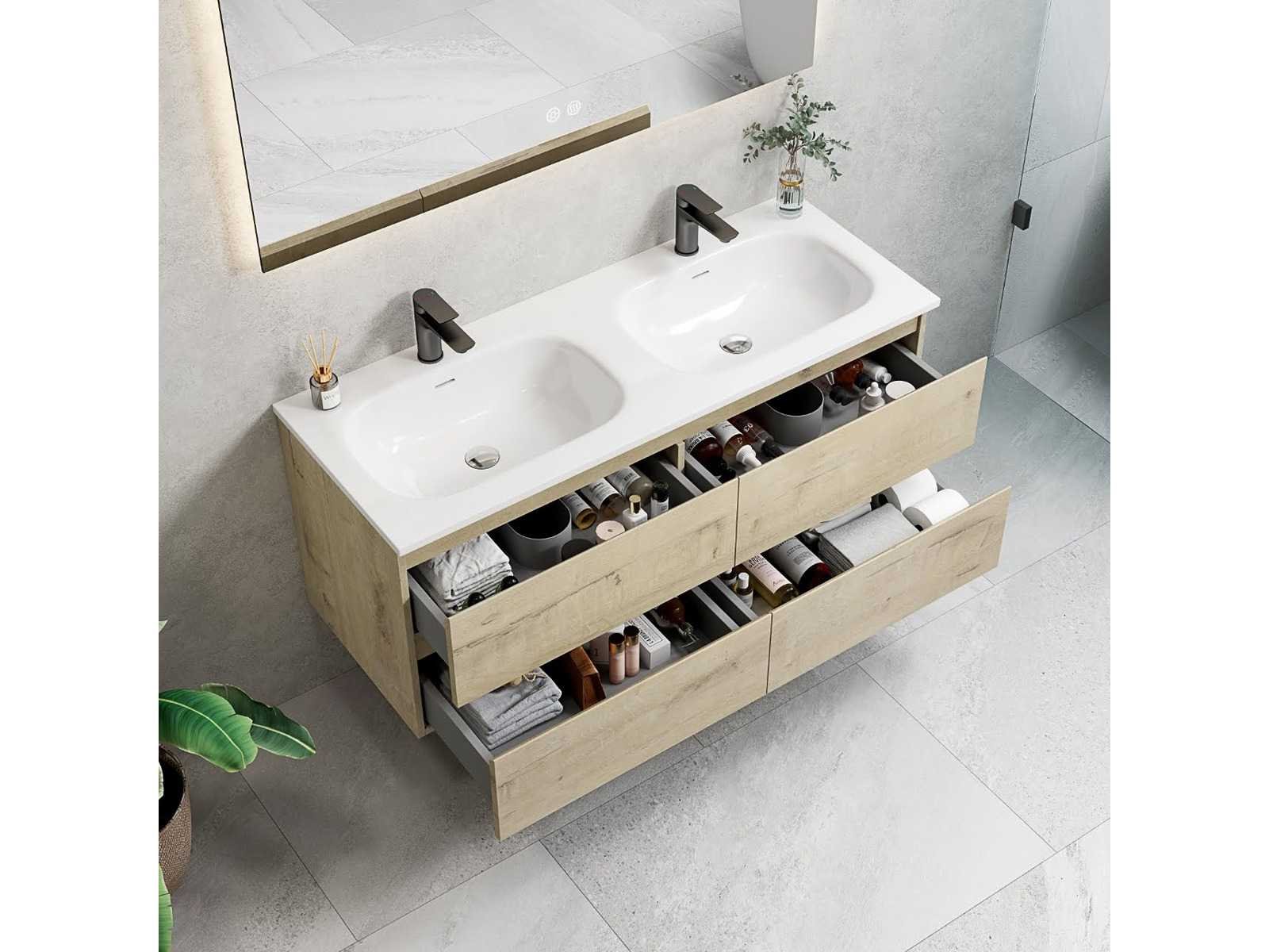 De onderbouwkast van het badkamermeubel bevat 4 laden en is uitgevoerd met een soft close systeem - kraan, krepin, sifon en kolomkast niet inbegrepen Nee Merk: Lavinno Model: Roma 120-07 Hoogte: 50cm Lengte: 120cm Breedte: 46cm Materiaal: Mdf Kleur: Licht Eik Wastafel: Ceramic Spiegel: 80X70 Softclose: true