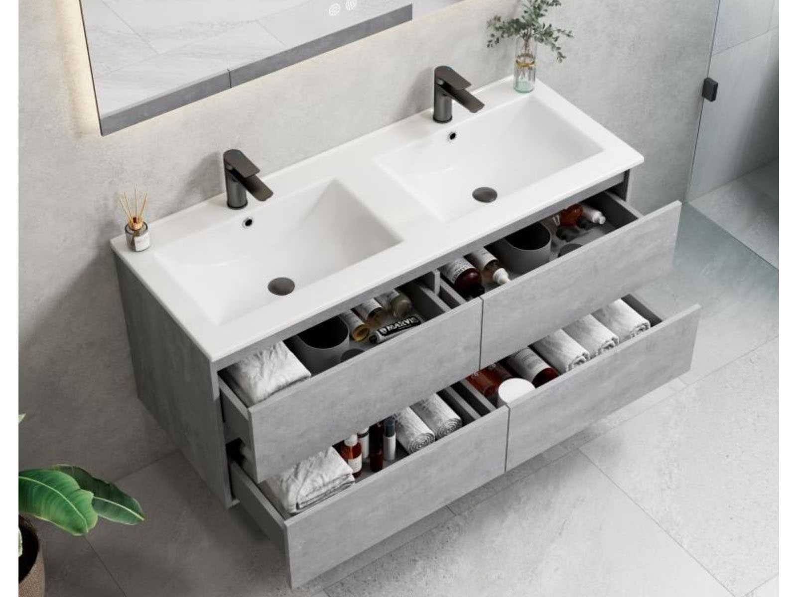 Kraan, krepin, sifon en kolomkast niet inbegrepen Nee Merk: Lavinno Model: Roma 120-05 Hoogte: 50cm Lengte: 120cm Breedte: 46cm Materiaal: Melamine Kleur: Beton Grijs Wastafel: Mineraalmarmer Spiegel met verlichting: 120x70cm Verlichting: 3000K Warm-wit, 4000K Neutraal-wit, 6500K Koud-wit Softclose: true