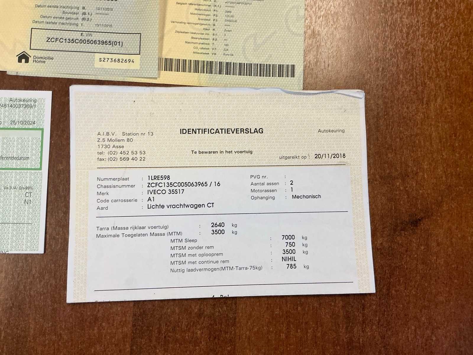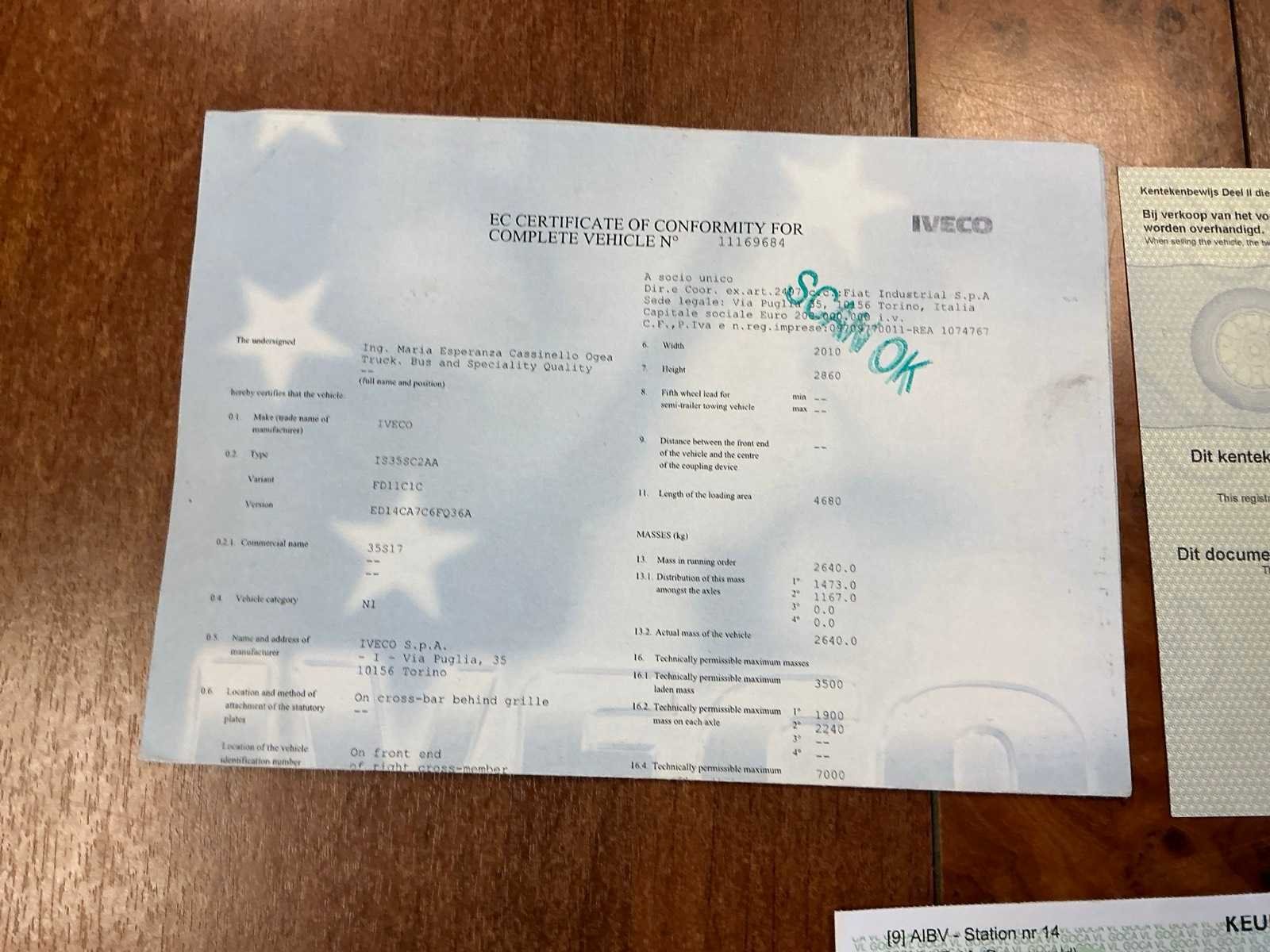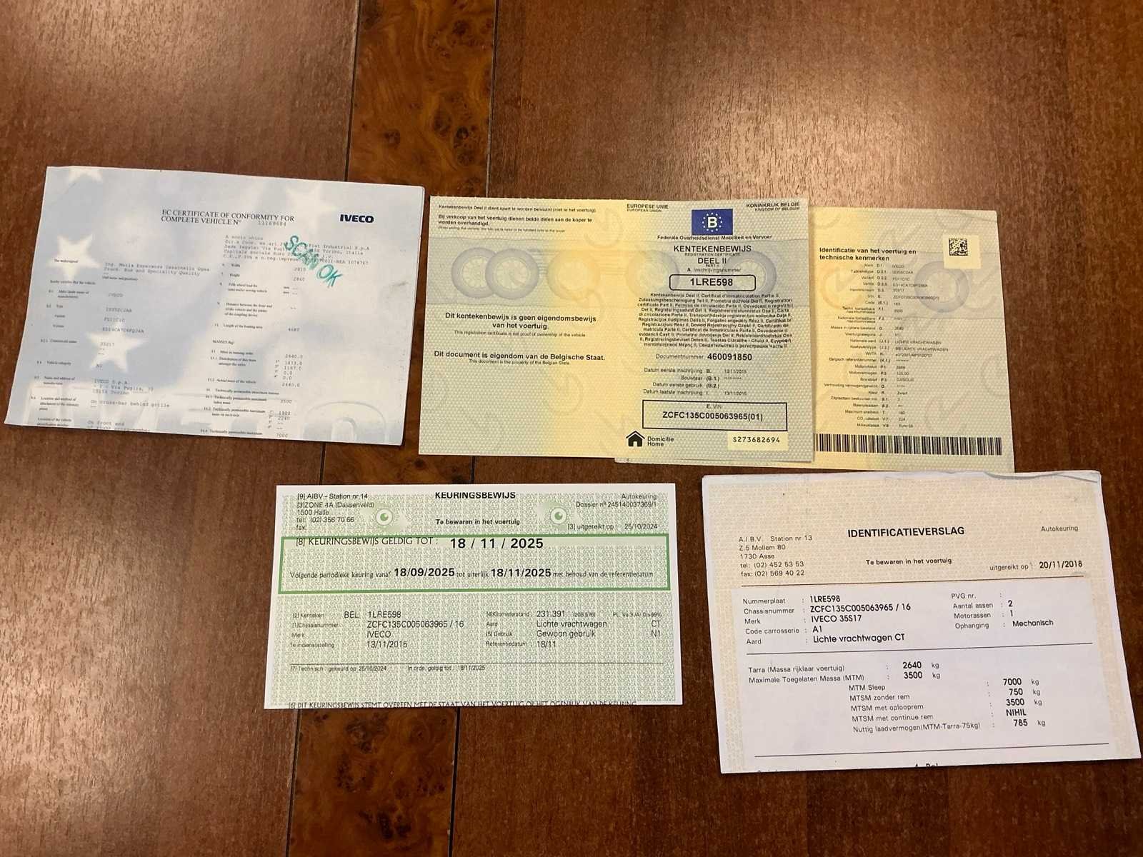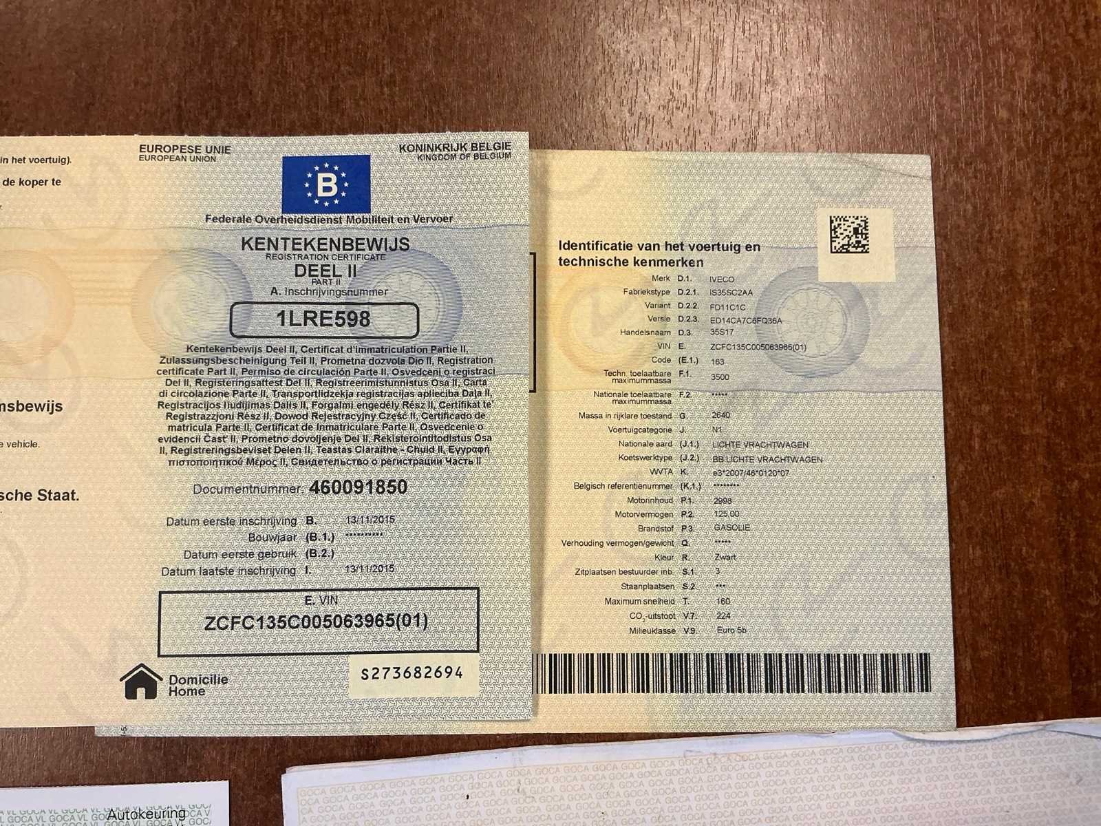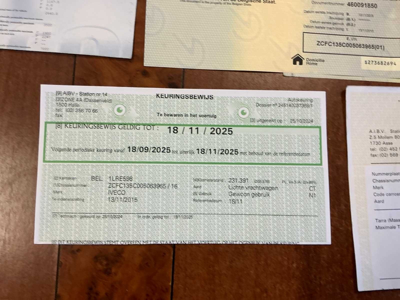 Nee Model: 35S17 Bouwjaar: 2015 Afgelezen kilometerstand: 265532km Cilinderinhoud: 2998cc Vermogen (kW): 125kW Brandstof: diesel Chassisnummer: ZCFC135C005063965 Datum eerste toelating: 13/11/2015 Emissieklasse: Euro 5b Aantal sleutels: 1 Nationaliteit documenten: BELGIË Gelijkvormigheidsattest aanwezig: true Start en rijdt: Ja Keuringsrapport geldig tot: 18/11/2025 Andere boorddocumenten: ID verslag Vavato voert geen technische keuring uit.: true Inschrijvingsbewijs - deel 1 : Aanwezig Inschrijvingsbewijs - deel 2: Aanwezig