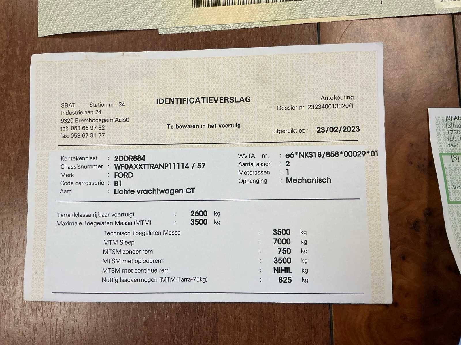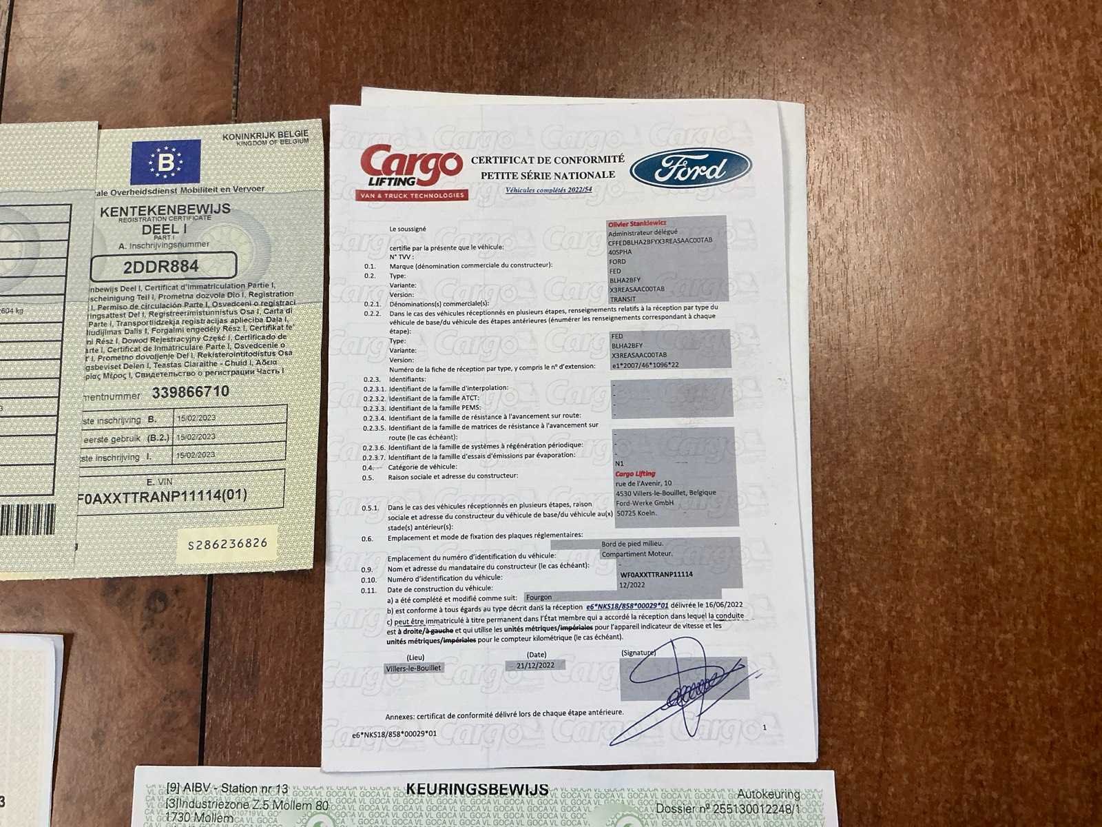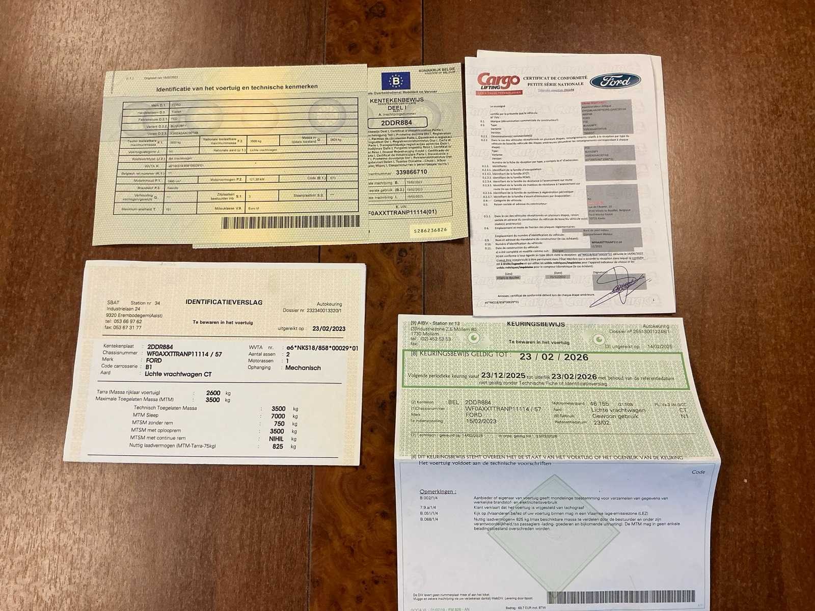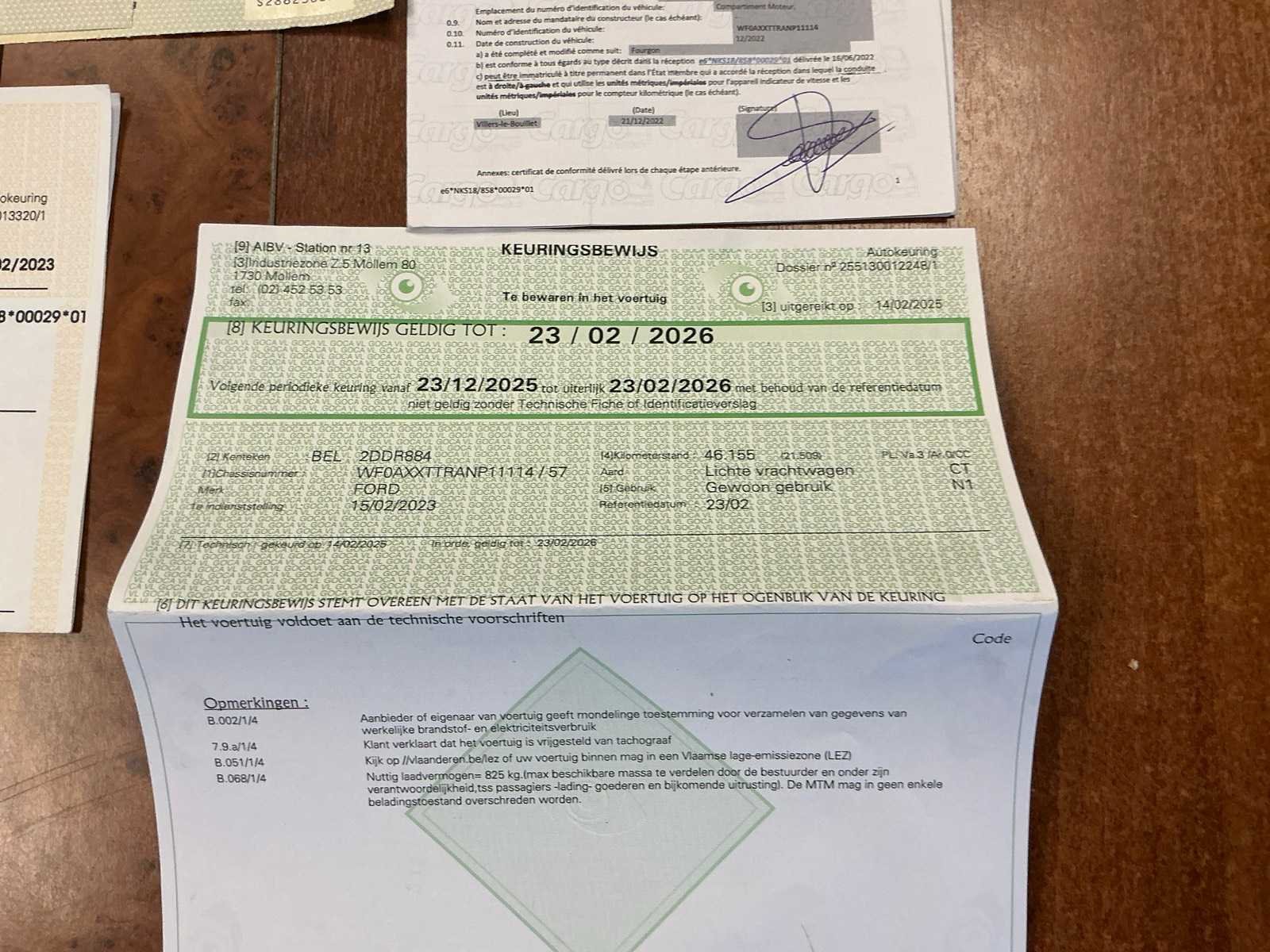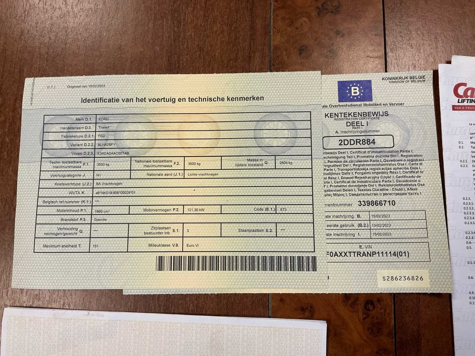 Aanwezige documenten: kentekenbewijs deel 1 en deel 2, identificatieverslag, conformiteitsattest, keuringsbewijs. Nee Merk: Ford Model: Transit Bouwjaar: 2023 Afgelezen kilometerstand: 60637km Cilinderinhoud: 1995cc Vermogen (kW): 121.3kW Chassisnummer: WF0AXXTTRANP11114 Laadvermogen: 3500kg Datum eerste toelating: 15/02/2023 Emissieklasse: Euro VI Nationaliteit documenten: België Start en rijdt: Ja Keuringsrapport geldig tot: 23/02/2026 Vavato voert geen technische keuring uit.: true Inschrijvingsbewijs - deel 1 : Aanwezig Inschrijvingsbewijs - deel 2: Aanwezig
