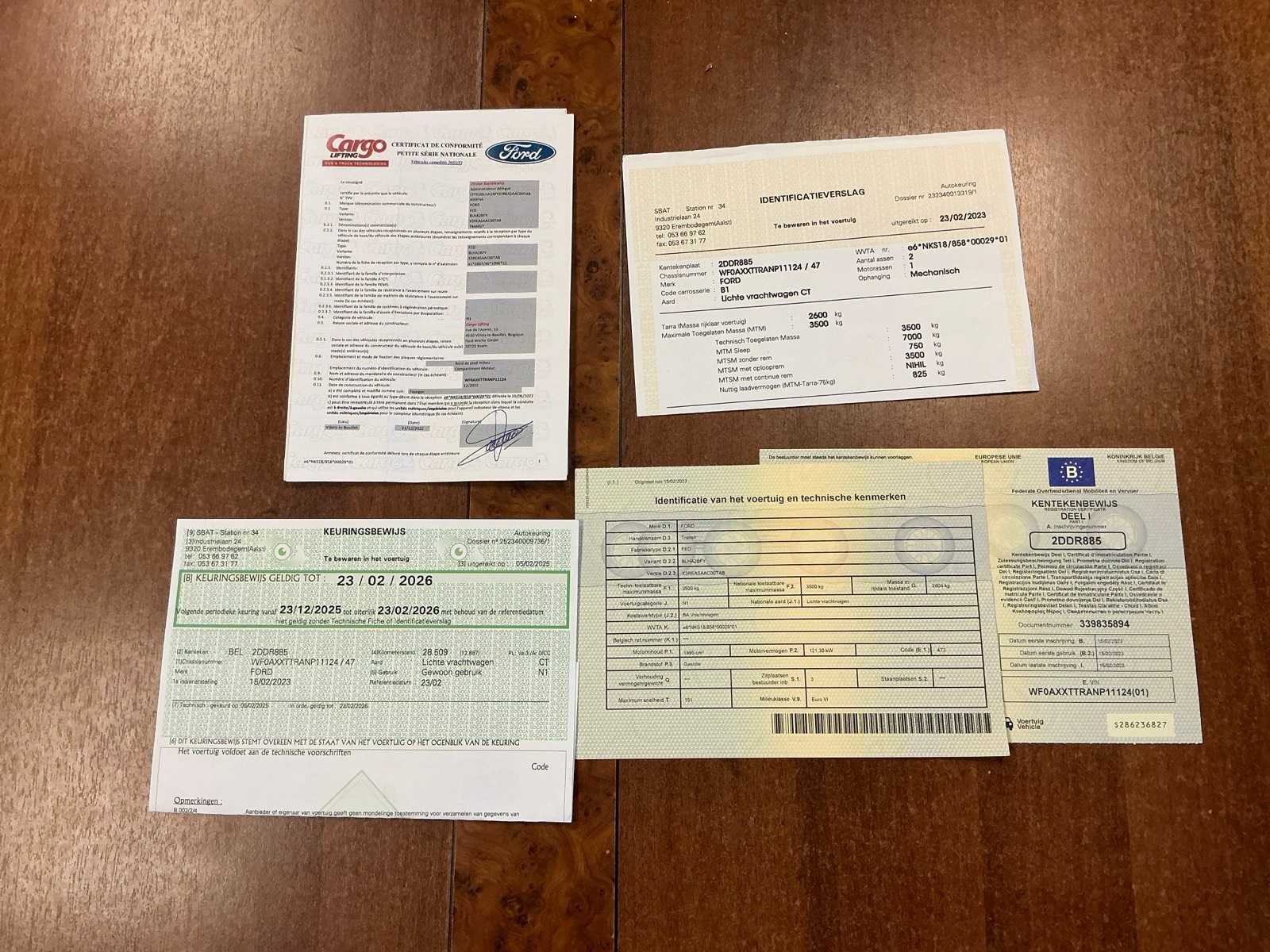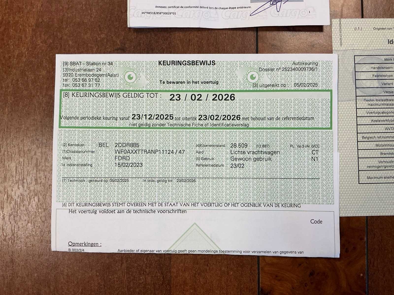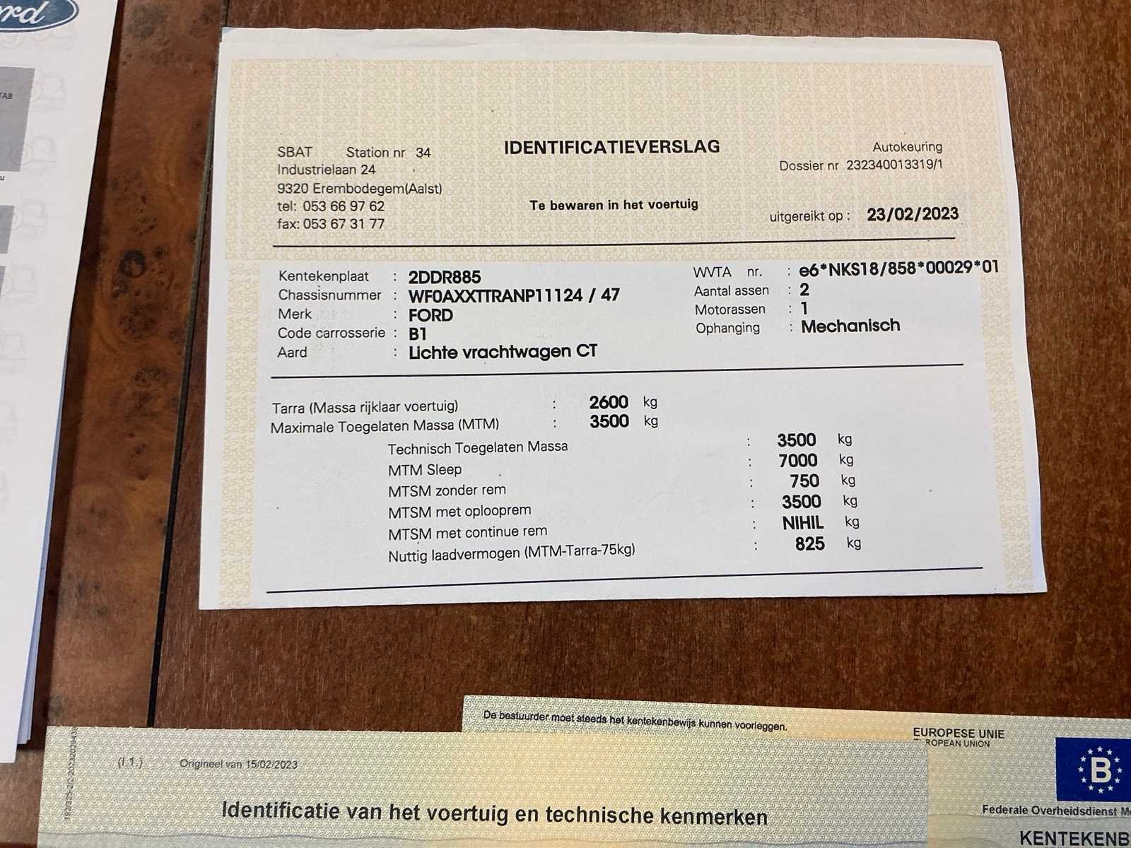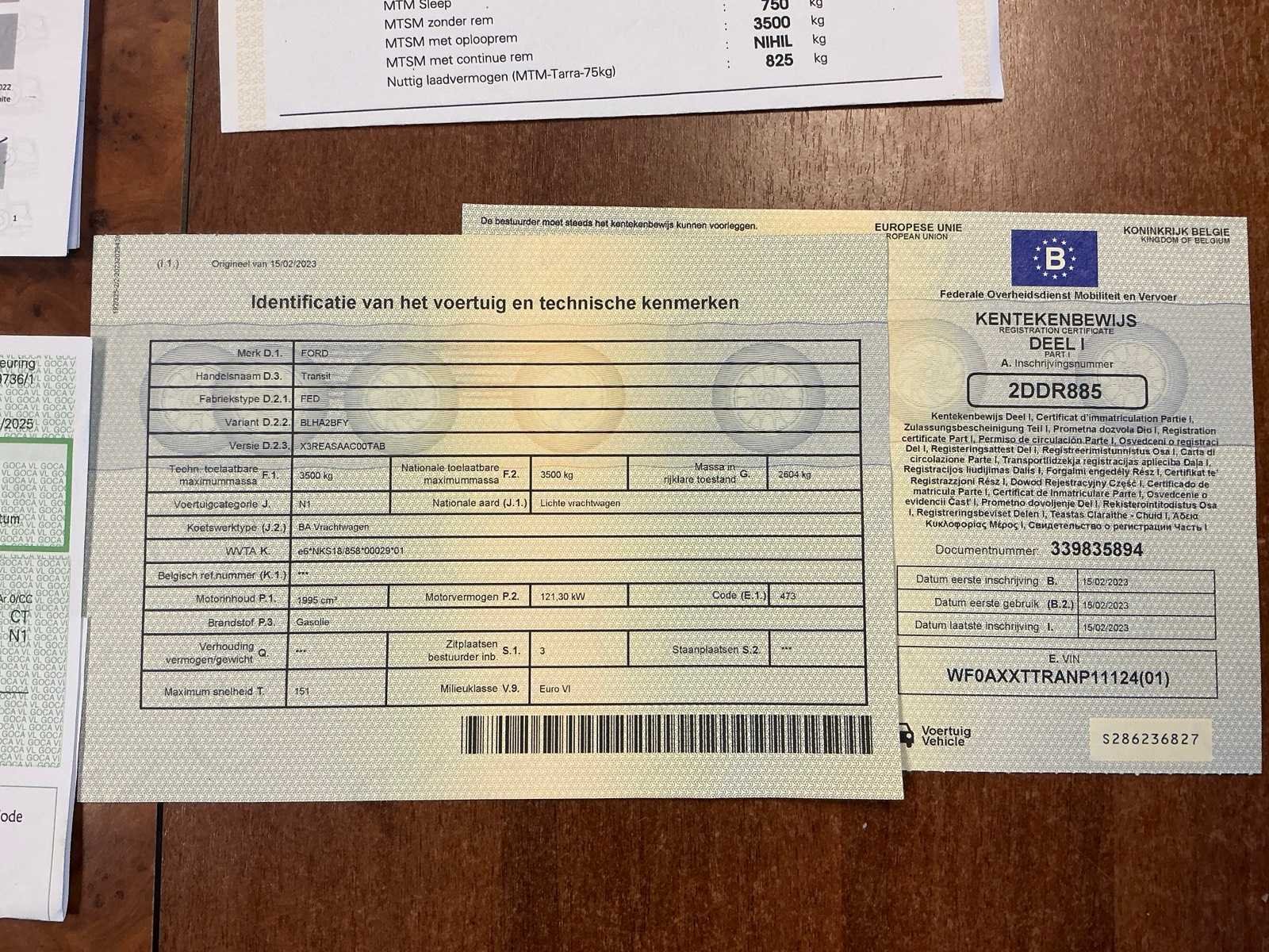 Aanwezige documenten: kentekenbewijs deel 1 en deel 2, conformiteitsattest, keuringsbewijs. Nee Merk: Ford Model: Transit Bouwjaar: 2023 Afgelezen kilometerstand: 42436km Cilinderinhoud: 1995cc Vermogen (kW): 121.3kW Brandstof: diesel Chassisnummer: WF0AXXTTRANP11124 Laadvermogen: 3500kg Datum eerste toelating: 15/02/2023 Transmissie: Automaat Emissieklasse: Euro VI Aantal sleutels: 1 Nationaliteit documenten: België Start en rijdt: Ja Keuringsrapport geldig tot: 23/02/2026 Vavato voert geen technische keuring uit.: true Inschrijvingsbewijs - deel 1 : Aanwezig Inschrijvingsbewijs - deel 2: Aanwezig