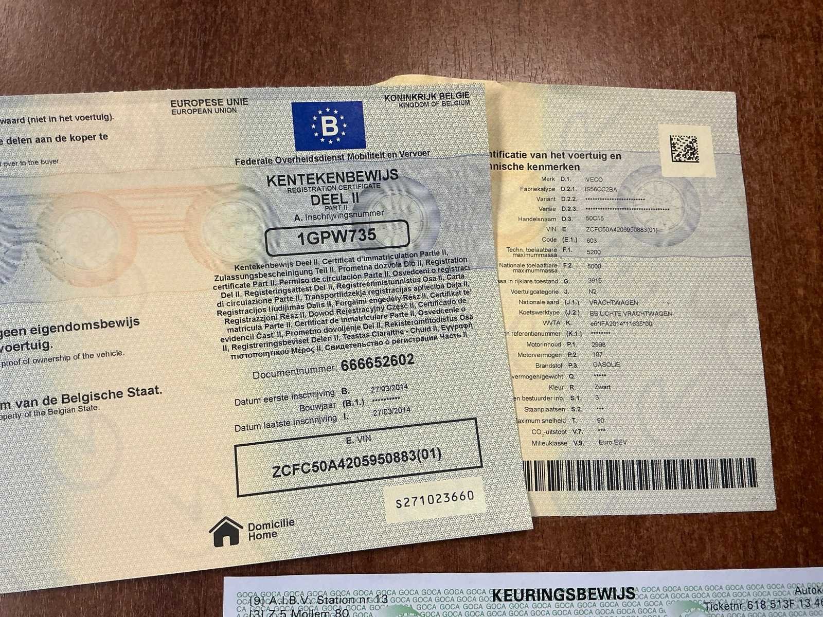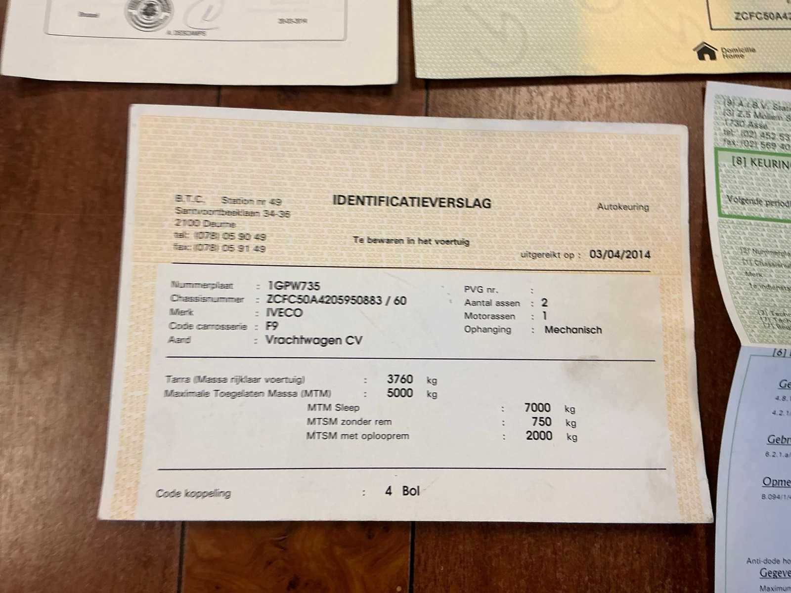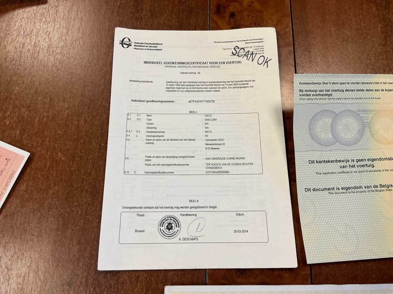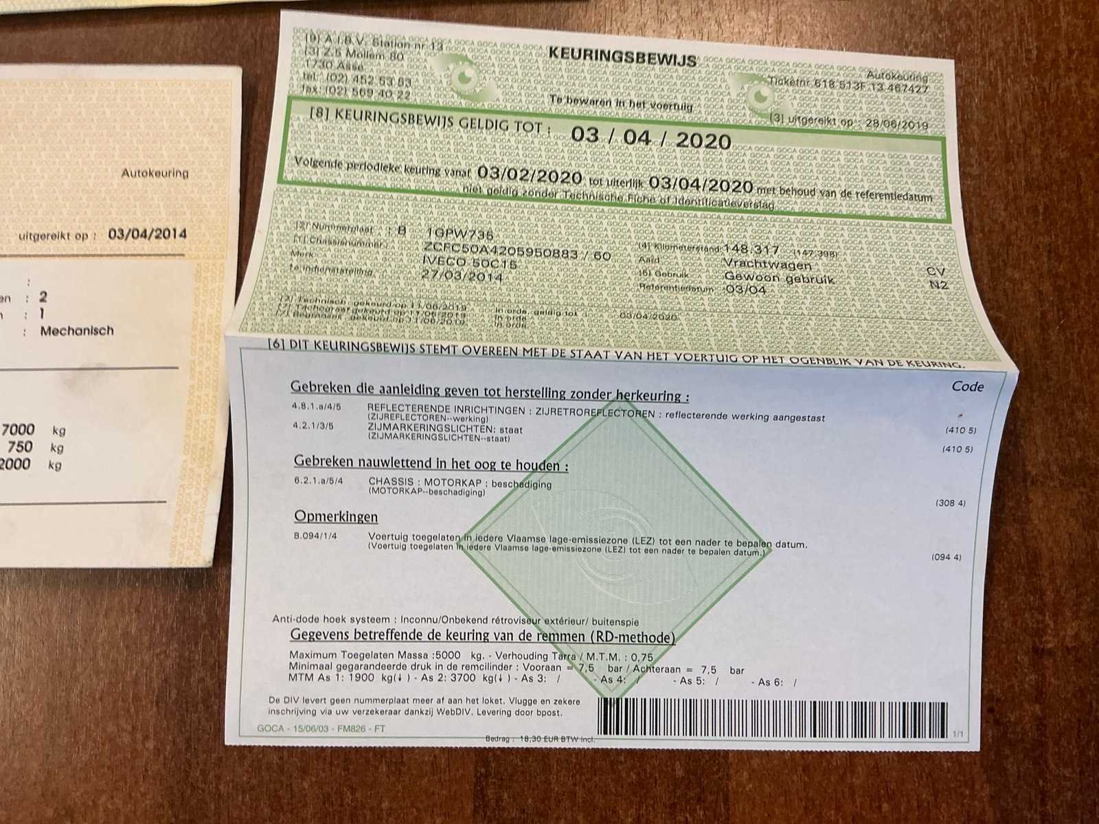 Voorzien van telescoophoogtewerker GSR 140 TJV, urenstand: 1624h, werkhoogte: 14m Nee Merk: Iveco Model: 50C15 Bouwjaar: 2014 Afgelezen kilometerstand: 154658km Cilinderinhoud: 2998cc Vermogen (kW): 107kW Brandstof: diesel Chassisnummer: ZCFC50A4205950883 Datum eerste toelating: 27/03/2014 Transmissie: Handgeschakeld Emissieklasse: Euro EEV Aantal sleutels: 1 Nationaliteit documenten: BELGIË Gelijkvormigheidsattest aanwezig: true Start en rijdt: Ja, mits starten wagen met startkabels Keuringsrapport geldig tot: 03/04/2020 Andere boorddocumenten: ID verslag Vavato voert geen technische keuring uit.: true Inschrijvingsbewijs - deel 1 : Aanwezig Inschrijvingsbewijs - deel 2: Aanwezig