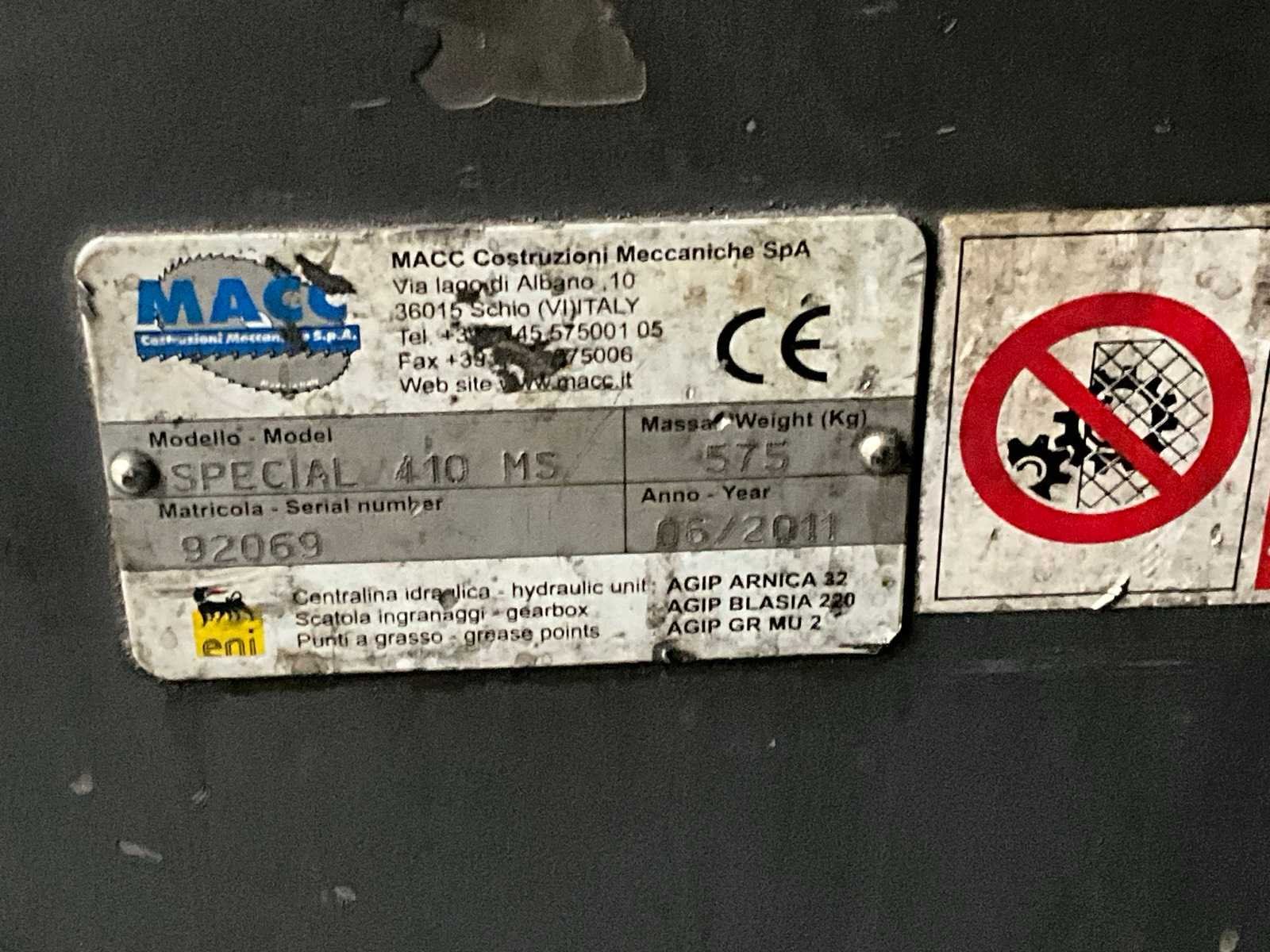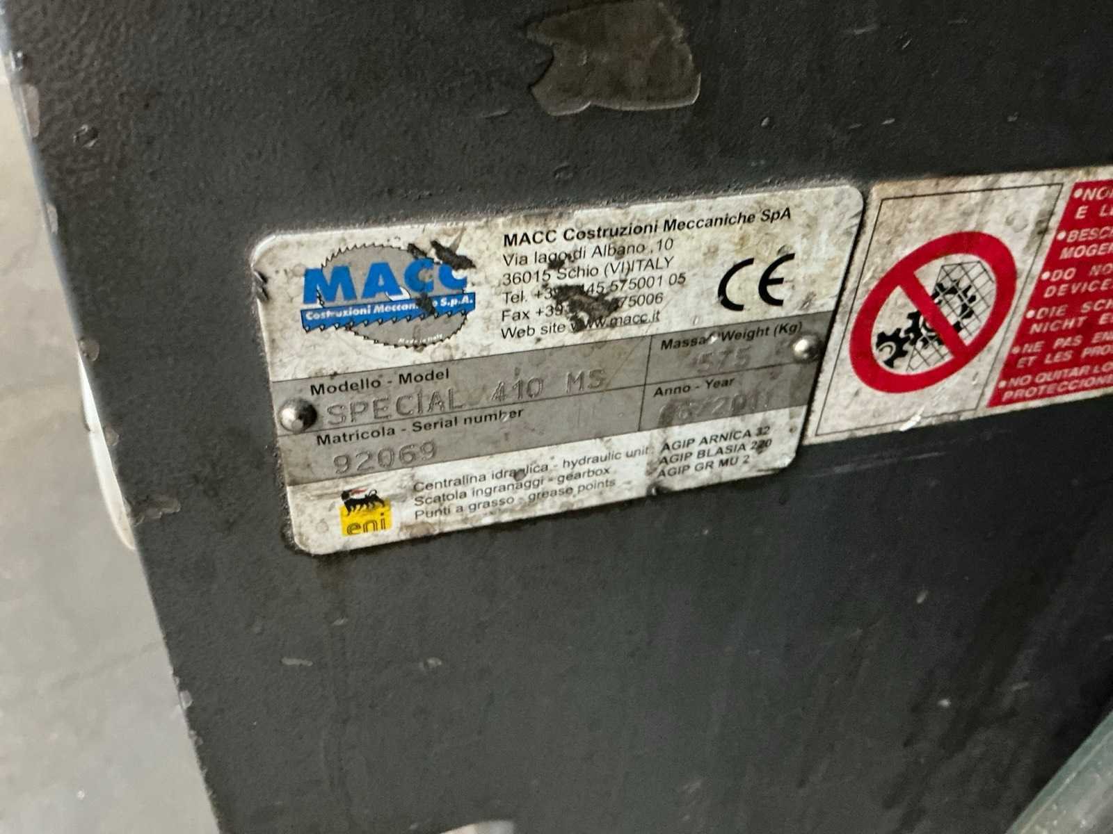 Compleet met circa 8,2m metalen aan– & afvoer roltafel Nee Merk: Macc Type: Special 420 M/S Bouwjaar: 2011 Serienummer: 92069 Aansluiting: 400V