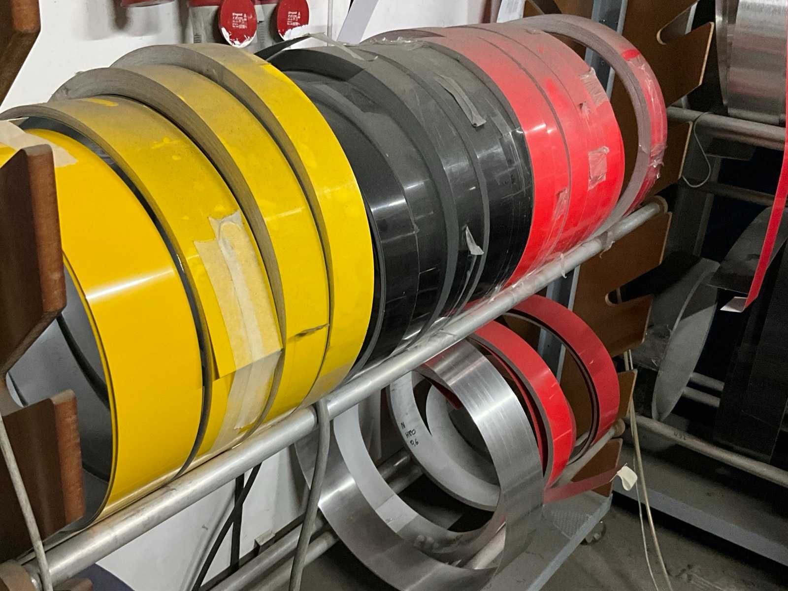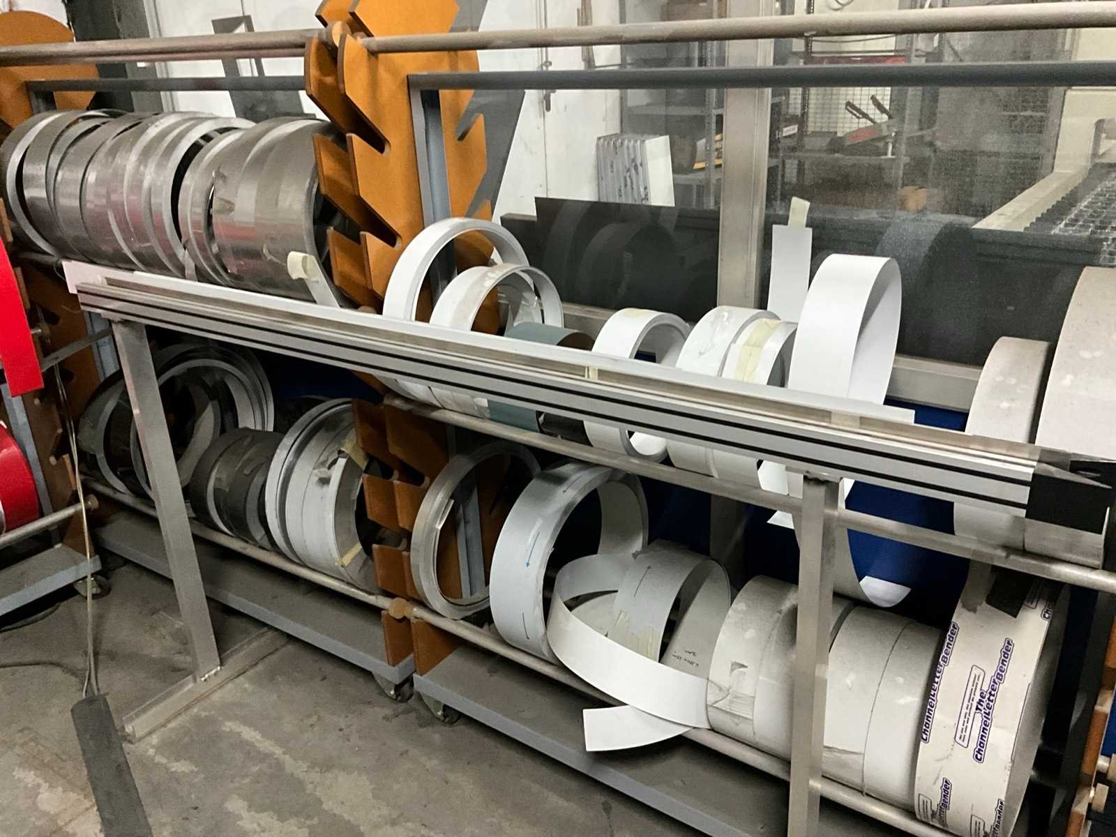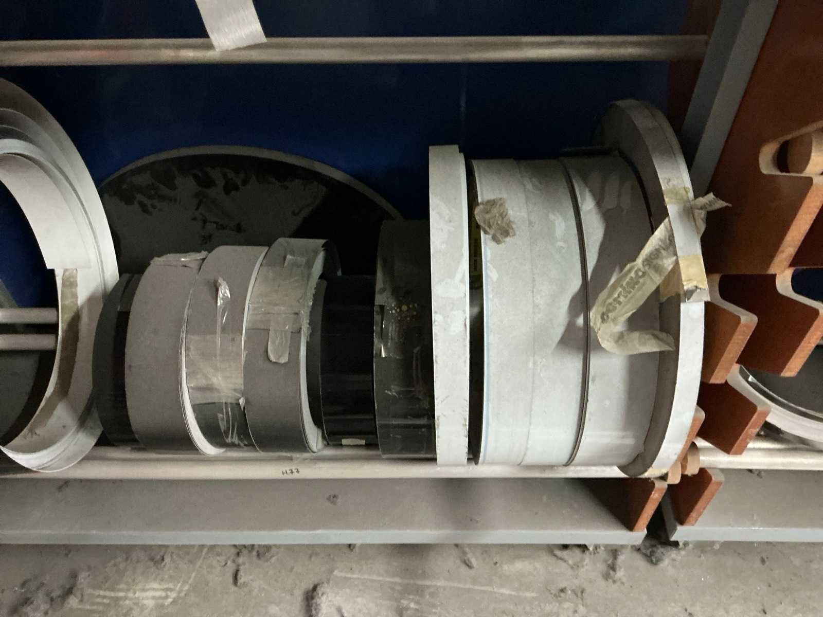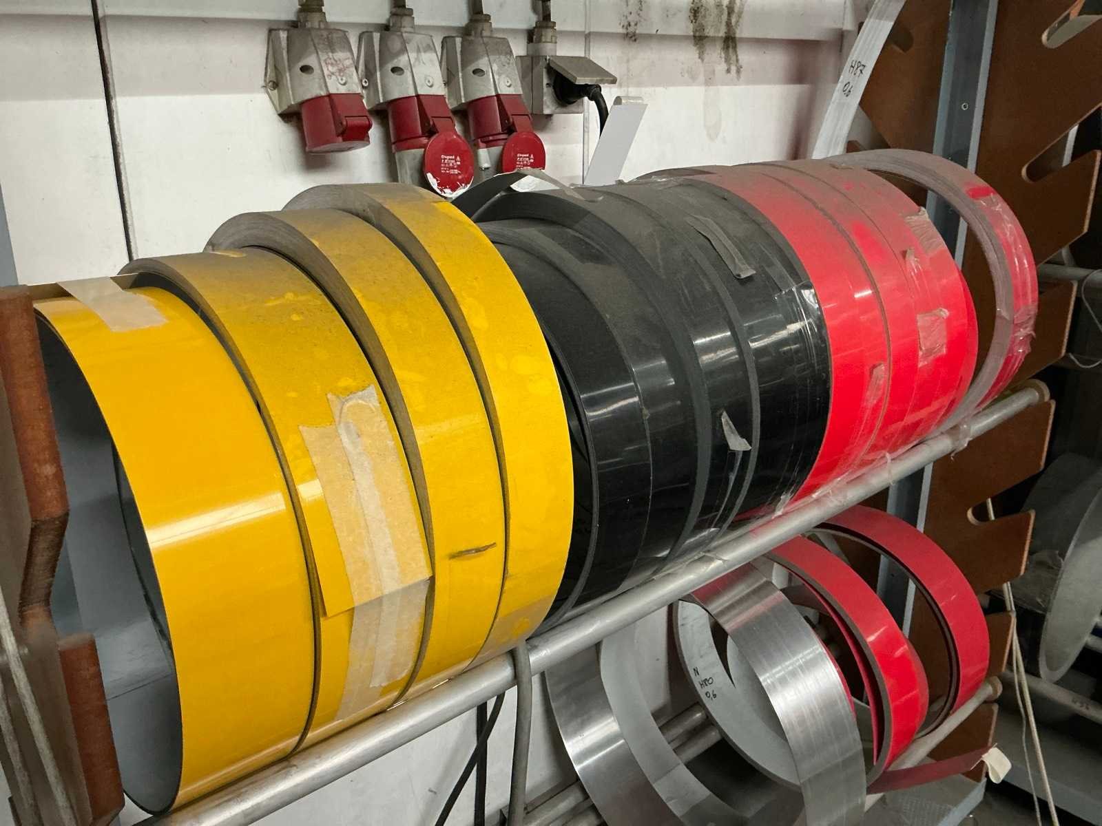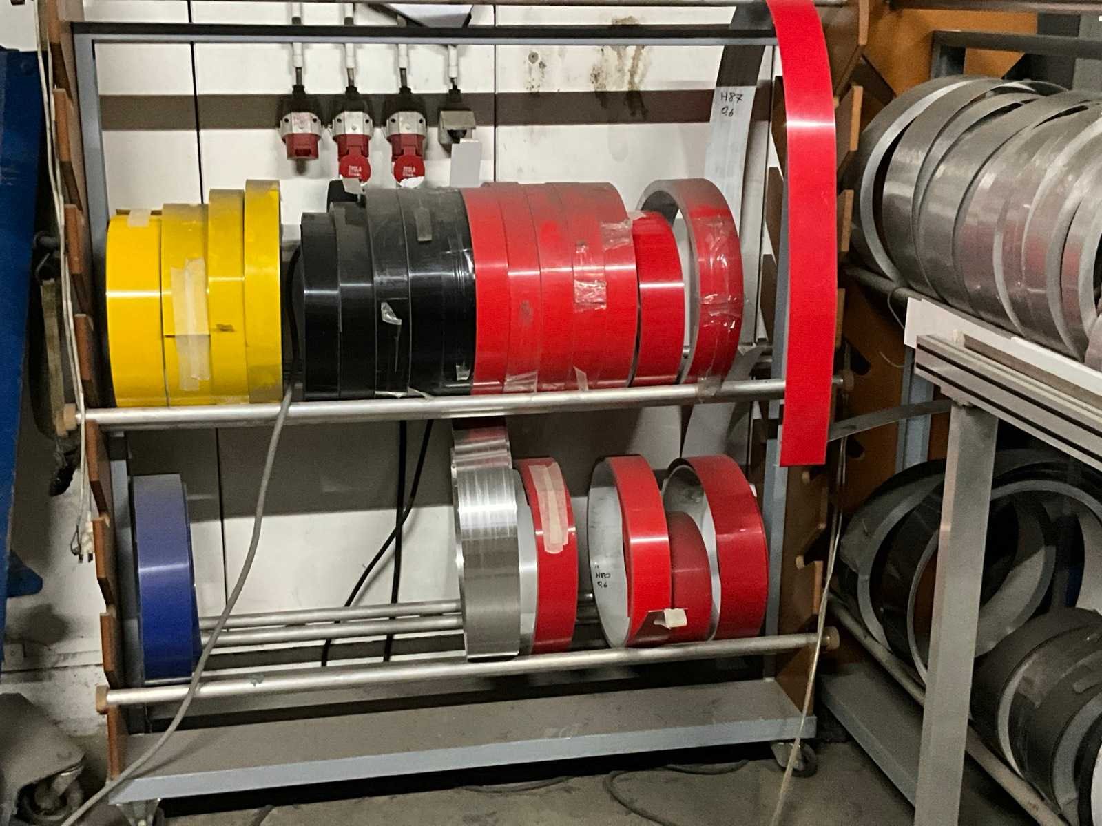 Aluminium band in diverse maten en uitvoeringen waaronder breedte band: 4,6,8 en 10cm en diktes van 0,6 tot 1,2mm, allen reeds aangebroken, compleet met 3 verrijdbare metalen karren voorzien van 8 niveau’s en 6 leggers, afmeting kar: 140x40x170cm Nee