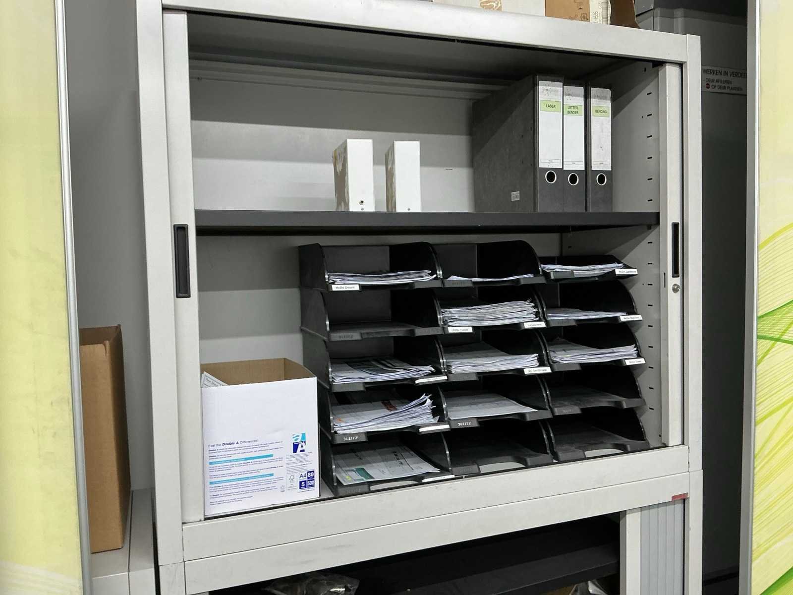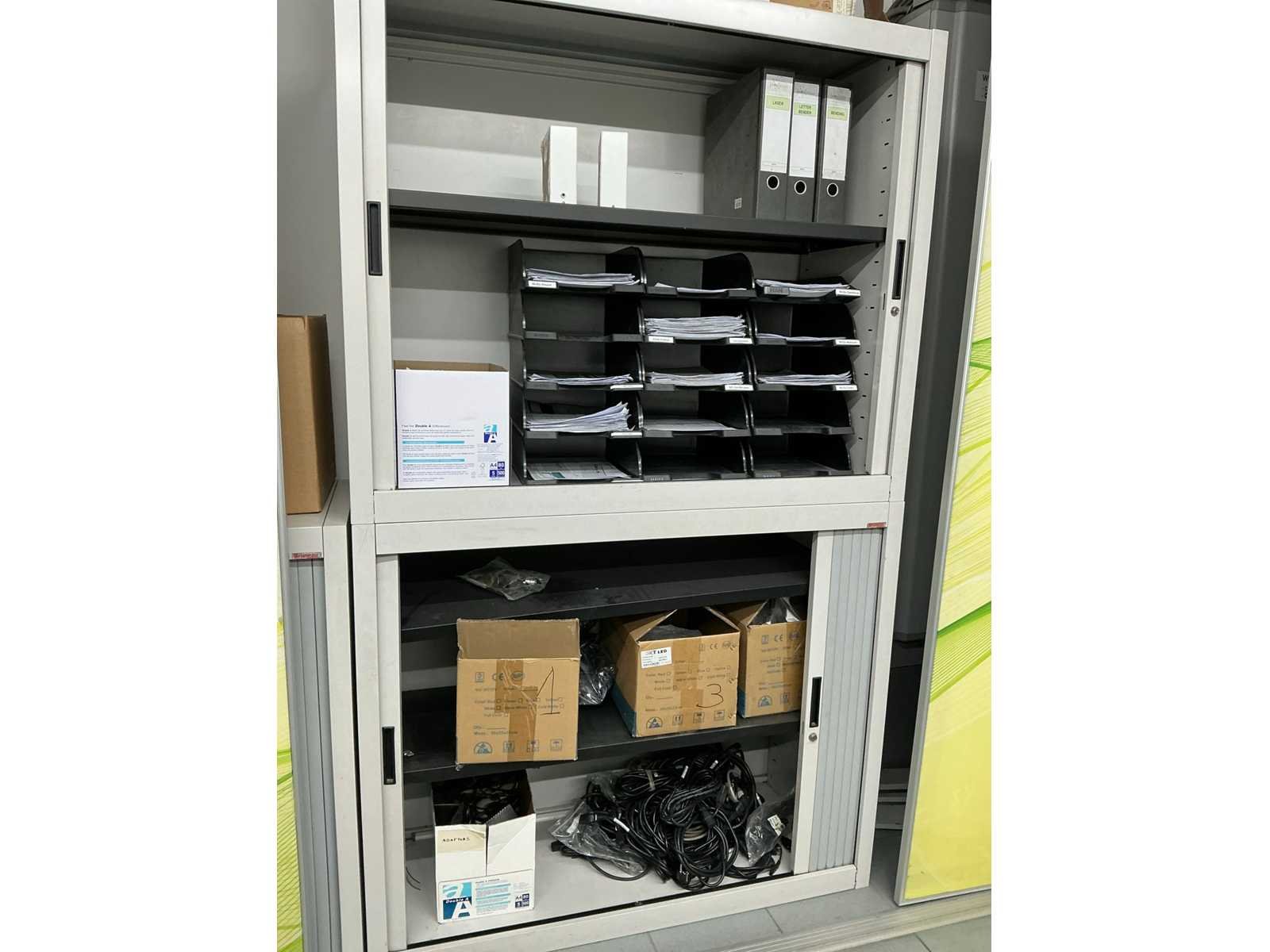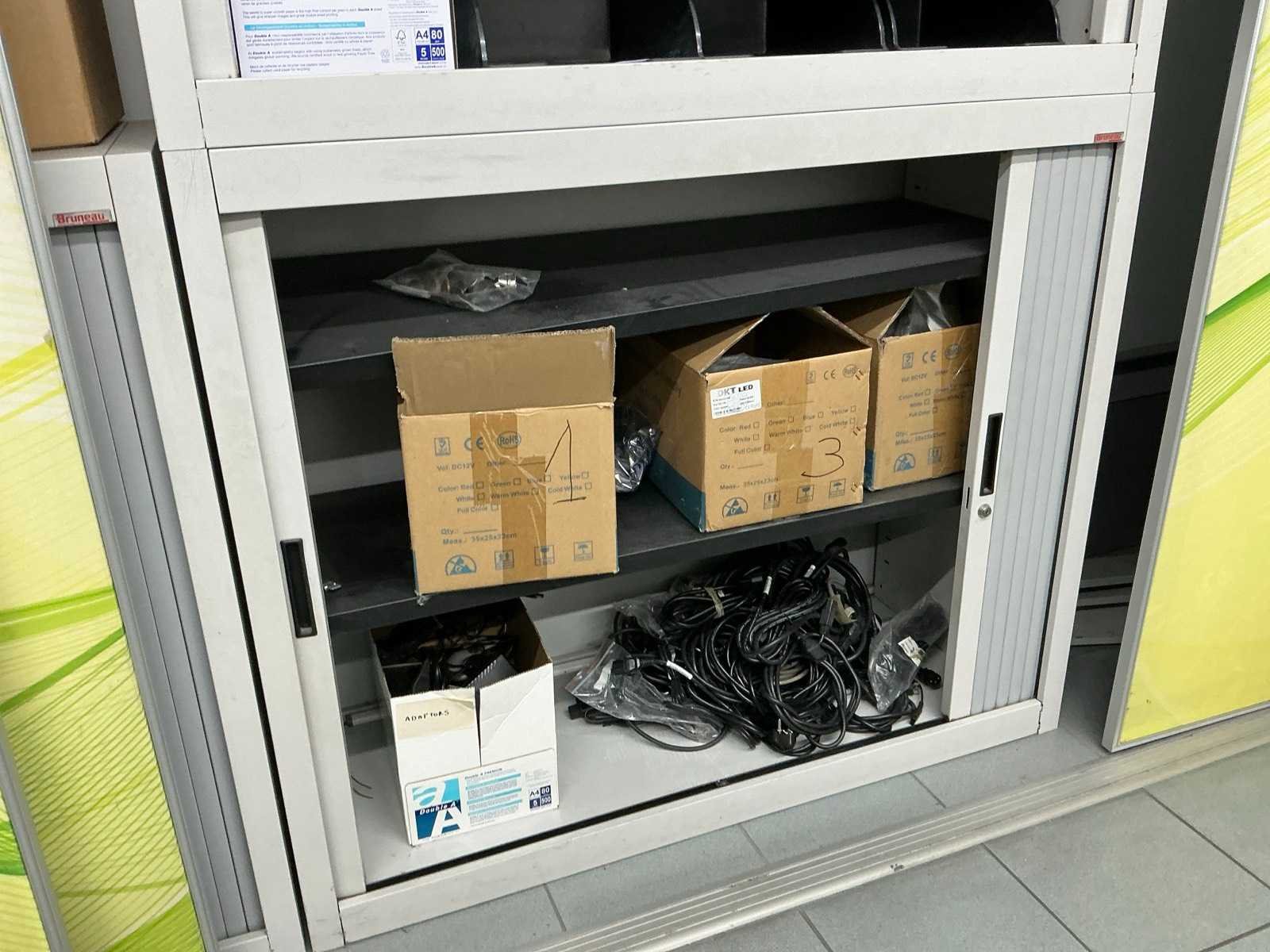 Voorzien van 2 rolluikdeuren en diverse leggers, compleet met inhoud zijnde partij diverse stroomkabels, enig ledstrips, enig pvc legbakjes LEITZ, uitgezonderd boekhouding en administratie Nee Merk: BRUNEAU