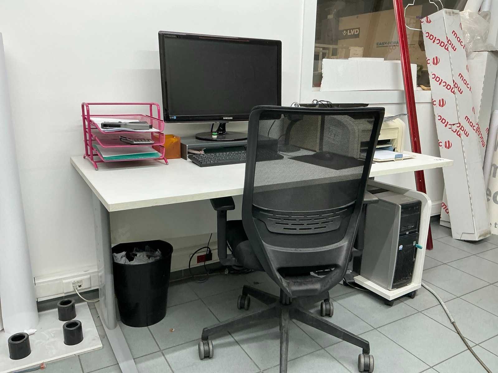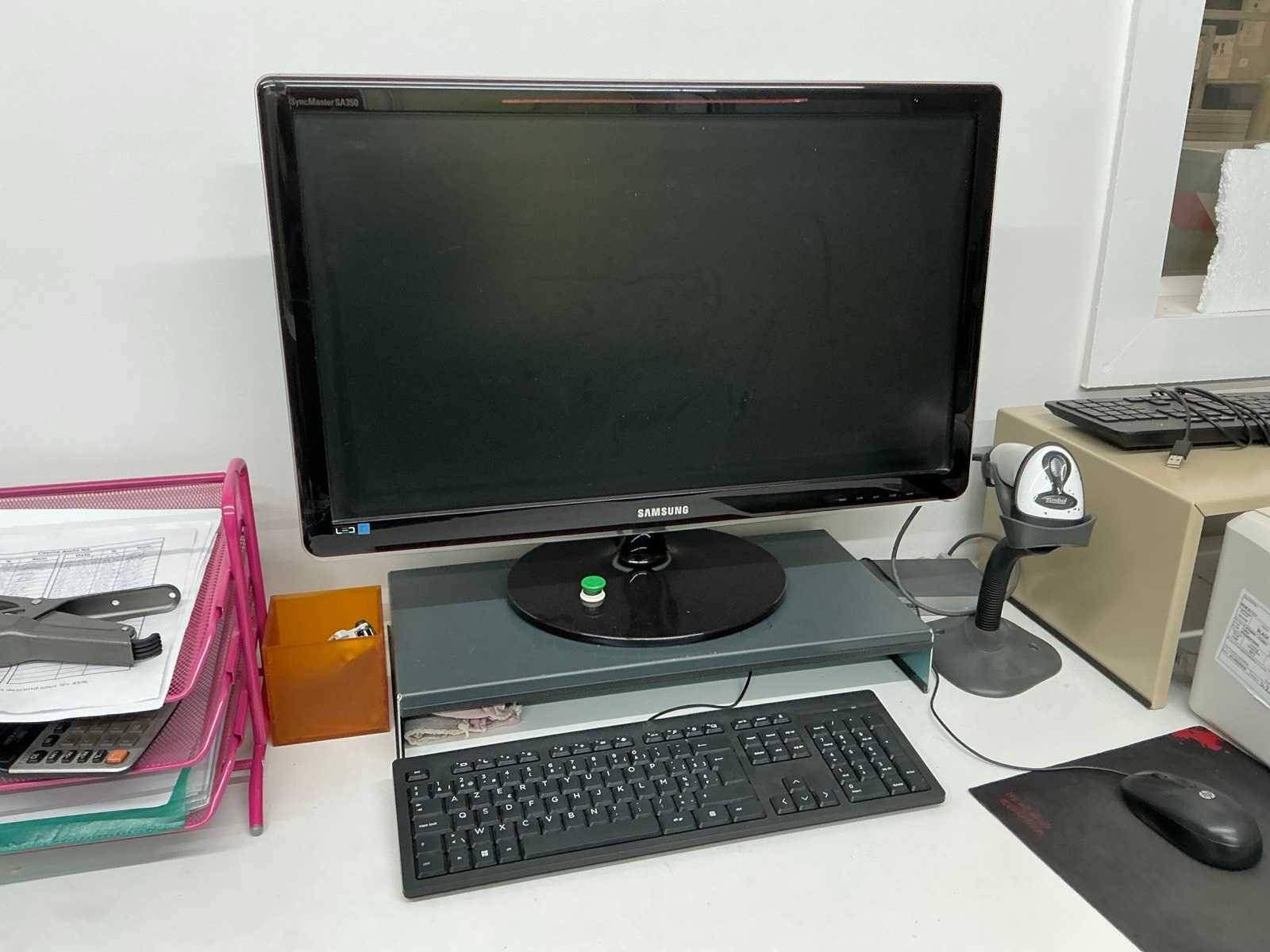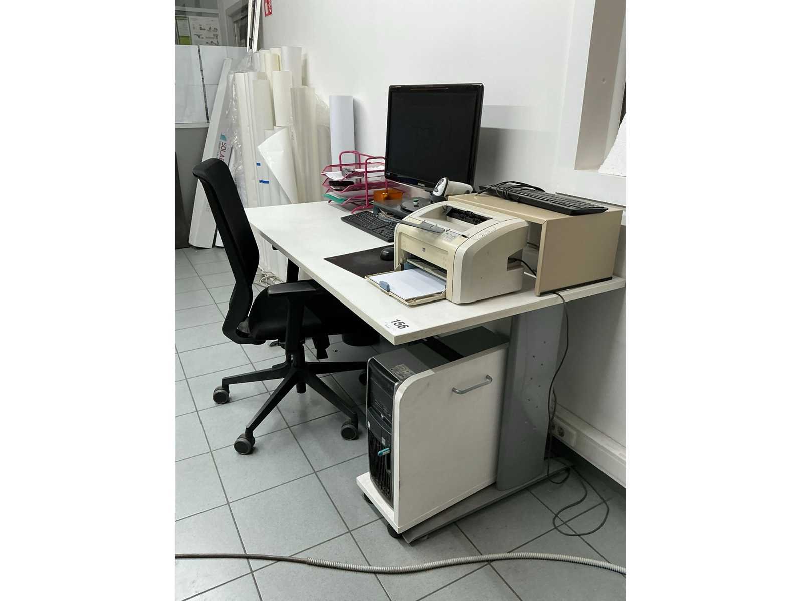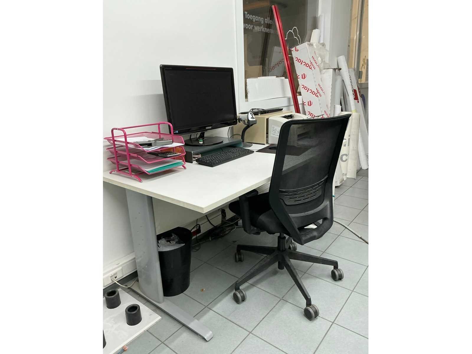 Bestaande uit metalen bureautafel voorzien van houten bovenblad, afmeting circa 160 x 80 x 73 cm, monitor SAMSUNG, 2 toetsenborden HP en muis, barcodescanner SYMBOL, printer HP LASERJET 1118, switch HP, bureaustoel voorzien van stoffen bekleding, uitgezonderd desktop HP Nee