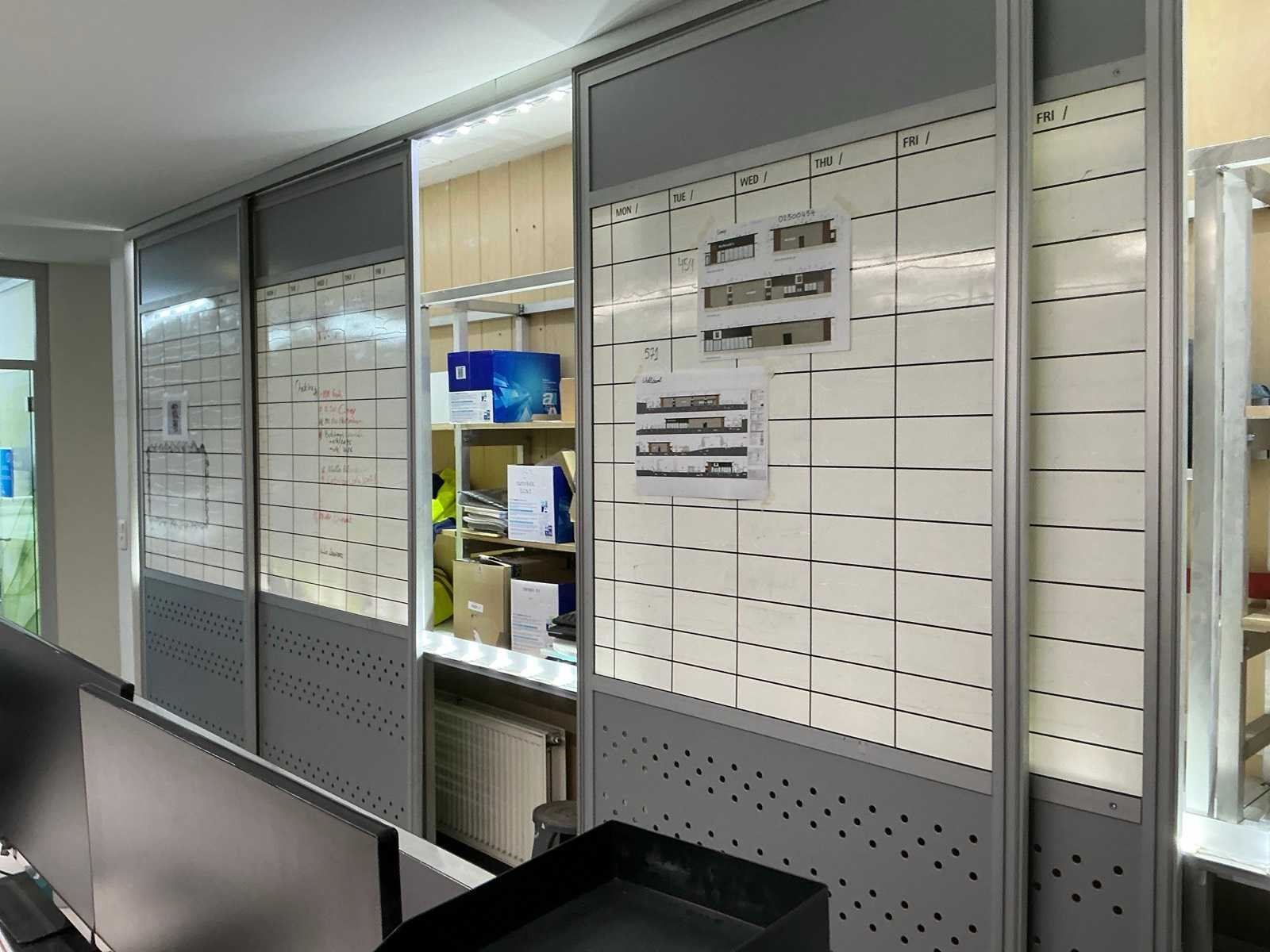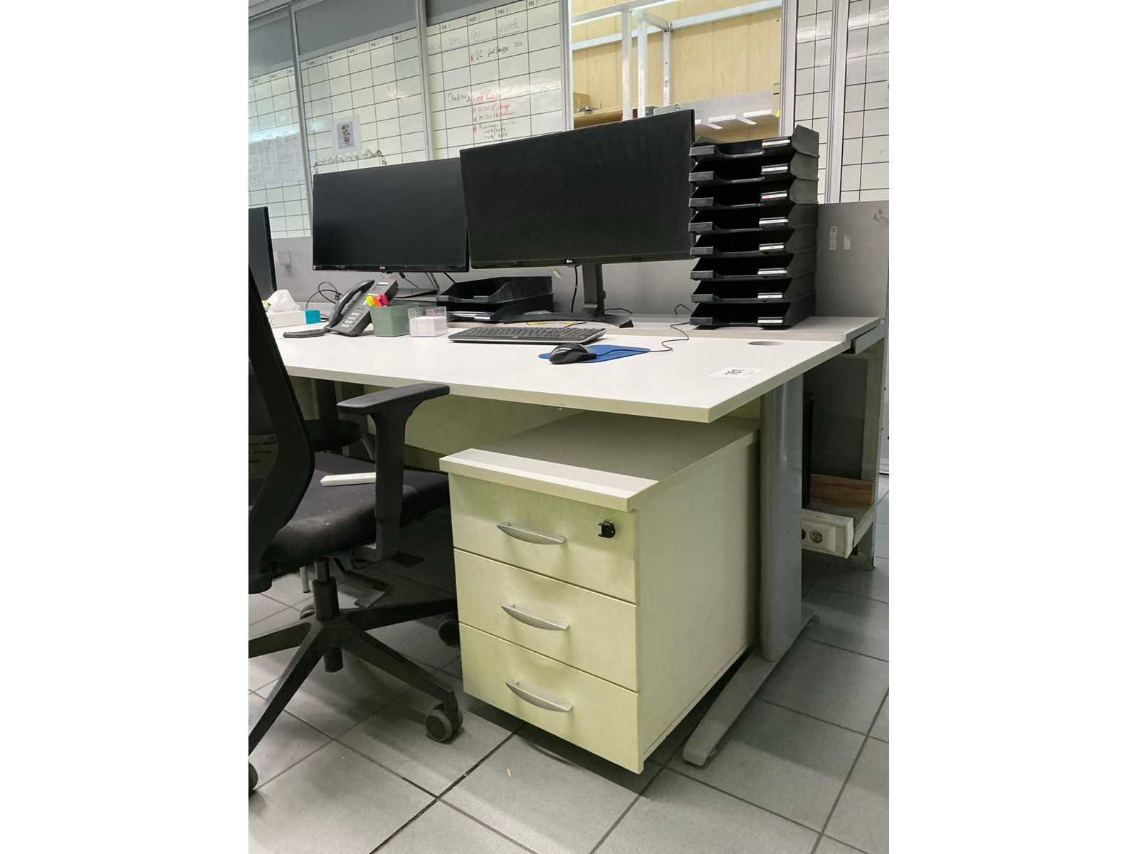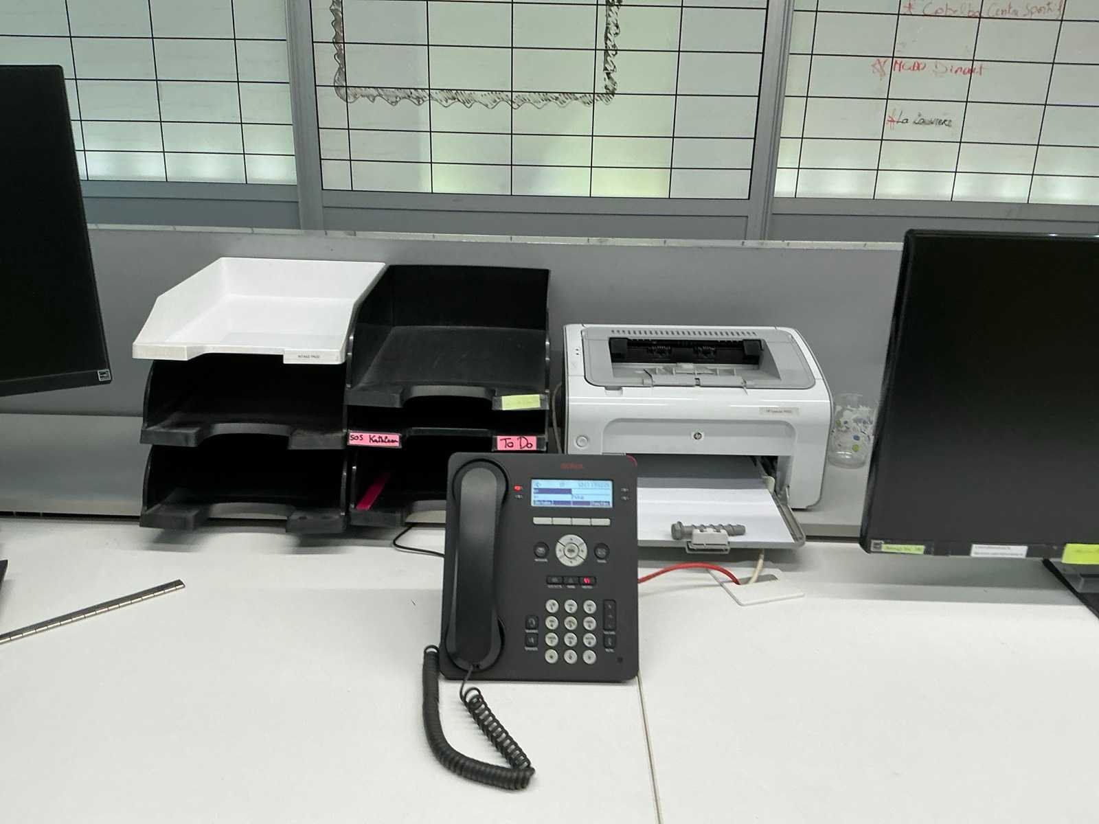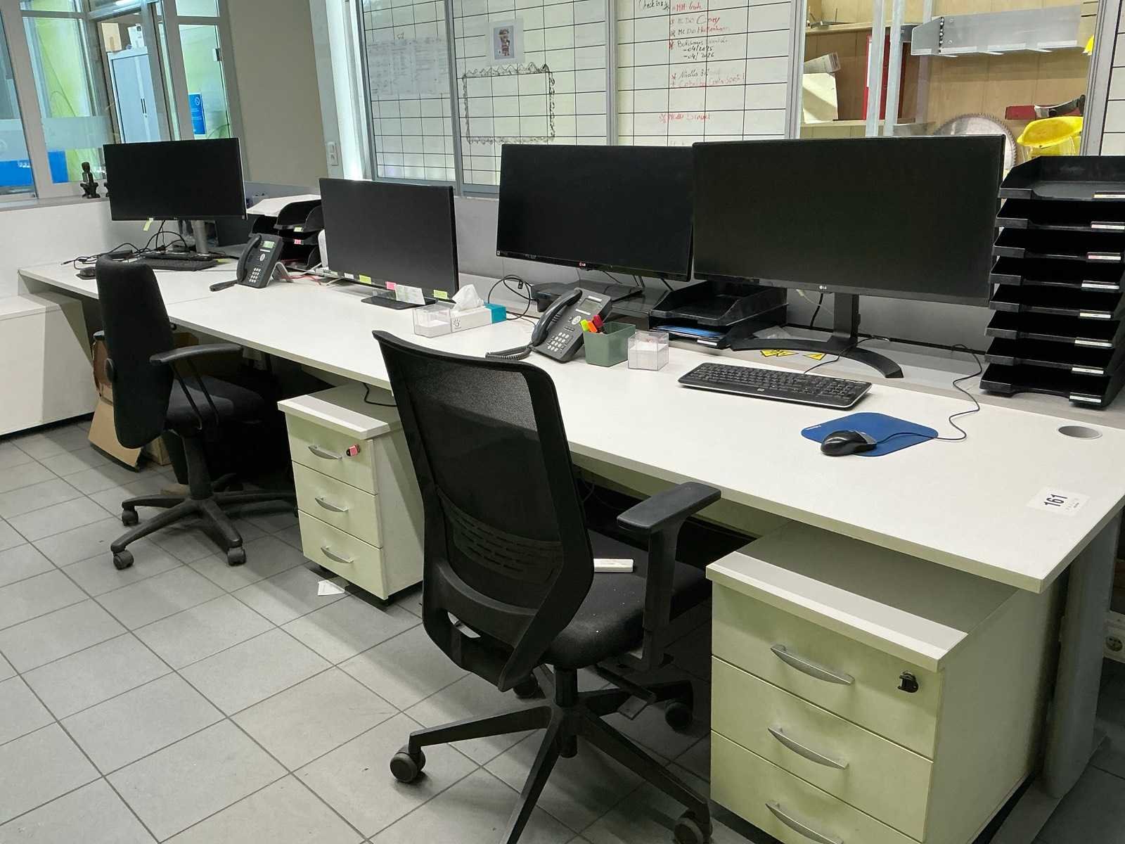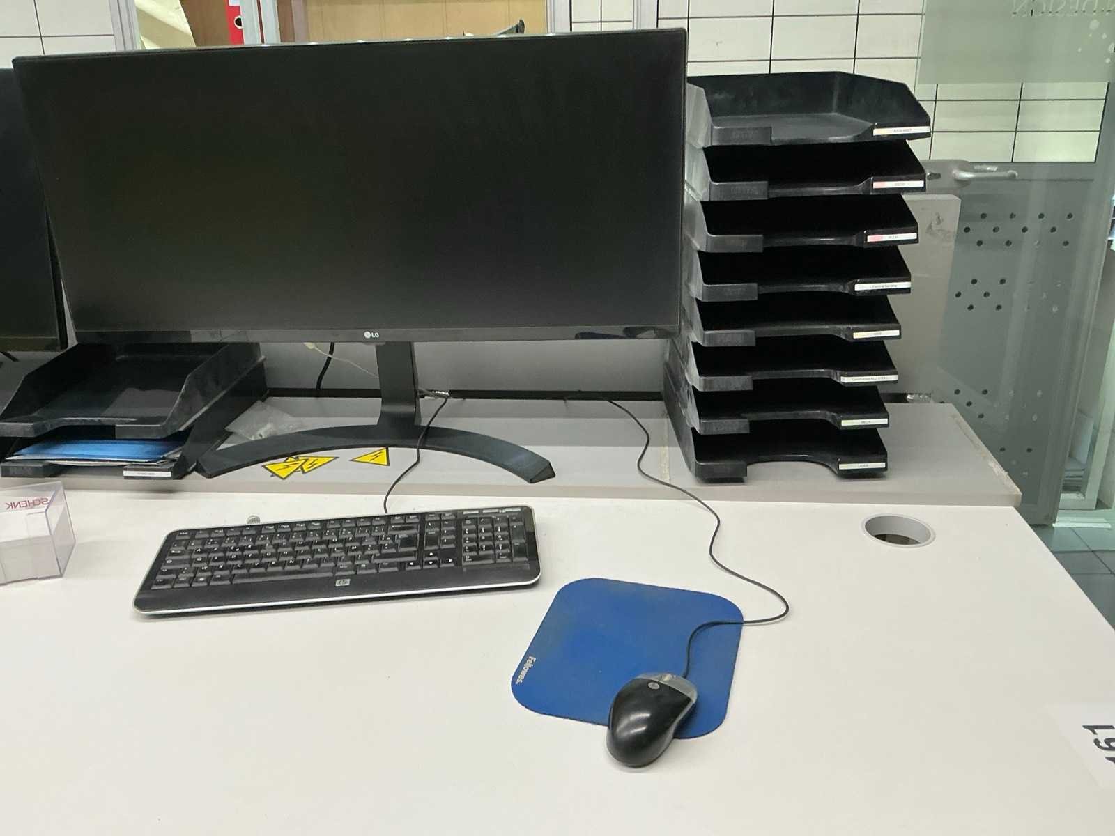 Bestaande uit 3 bureautafels elk van circa 160 x 80 x 74 cm, 4 diverse monitors LG, 3 toetsenborden, 2 computermuizen, printer HP LASERJET P1102, 3 ladenblokken waaronder 1 voorzien van 4 laden en 2 voorzien van 3 laden, 2 bureaustoelen voorzien van stoffen bekleding, enige kantoorartikelen, enzovoort compleet met inhoud wandkast, uitgezonderd desktops HP, boekhouding en administratie Nee