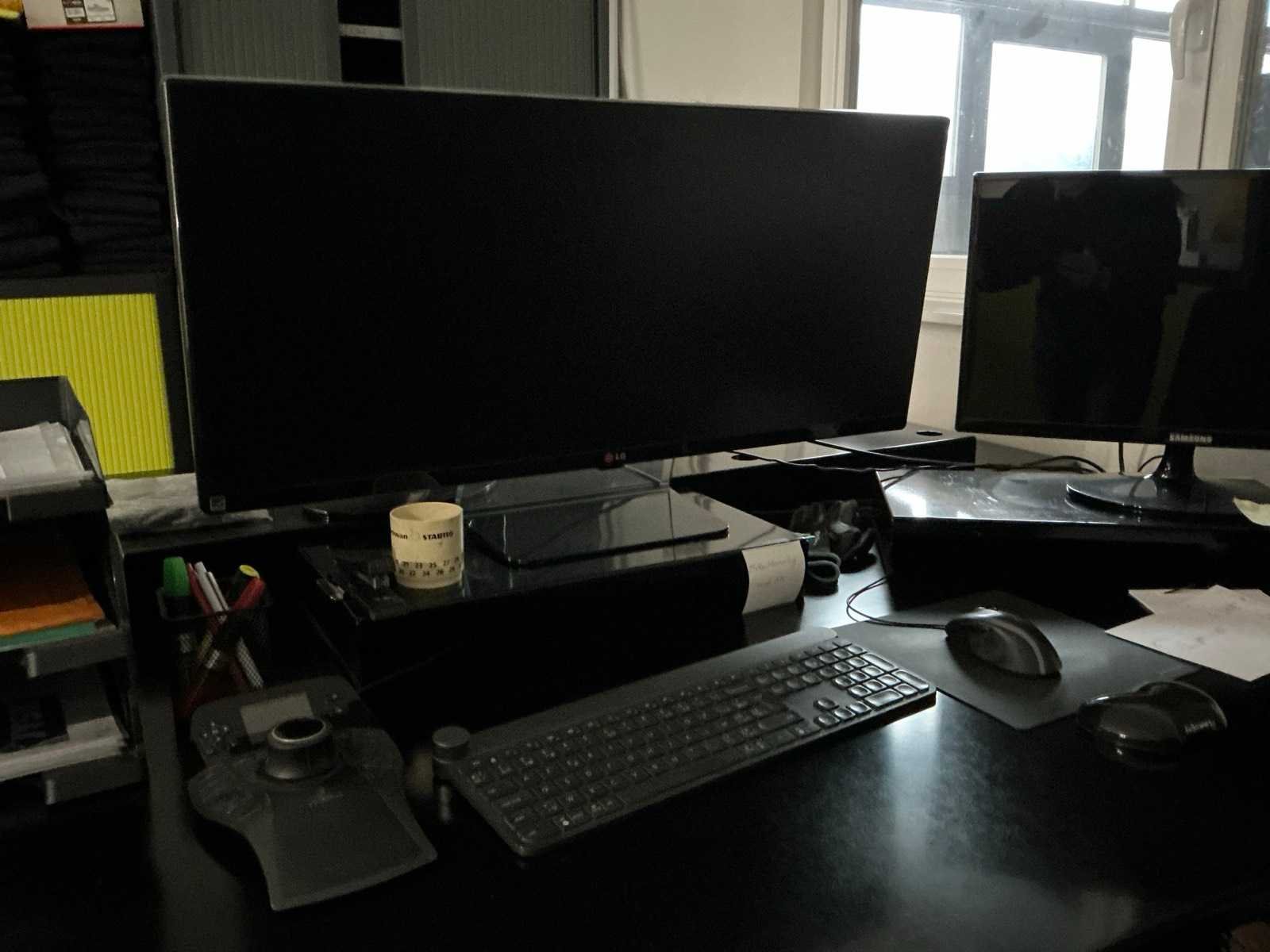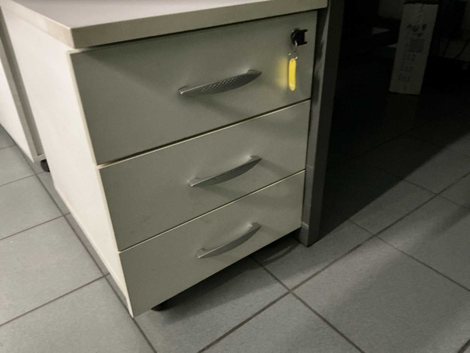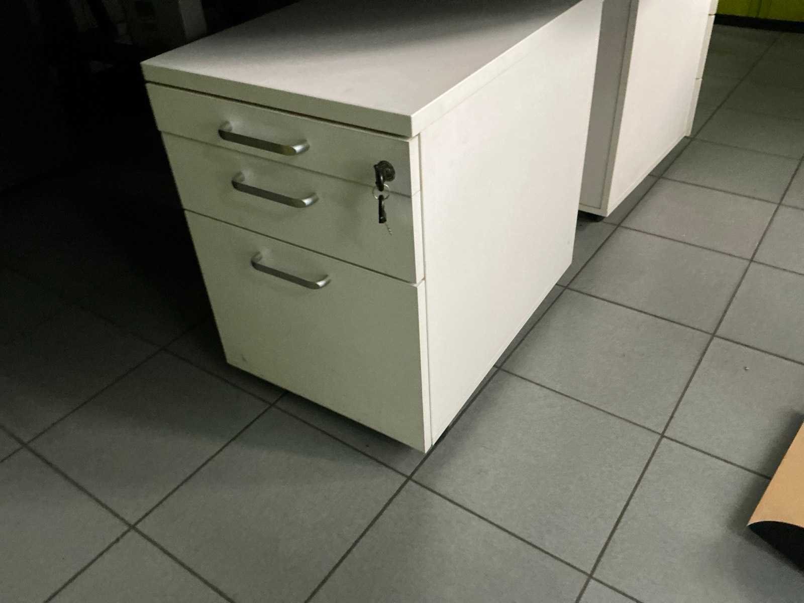 Bestaande uit 2 bureautafels elk afmeting van circa 240 x 130 x 76 cm, 4 diverse dossierkasten voorzien van rolluikdeuren waaronder 2 met afmeting circa 110 x 42 x 105 cm en 2 met afmeting 120 x 43 x 198 cm, 2 diverse bureaustoelen voorzien van stoffen bekleding, ventilator DOMO, 2 verrijdbare ladenblokken elk voorzien van 3 laden, 3 diverse monitors waaronder 2 SAMSUNG P2070 en 1 LG 34UM65-P, spacepilot 3DCONNECTION, toetsenbord en muis, enzovoort, uitgezonderd genummerde kavels Nee