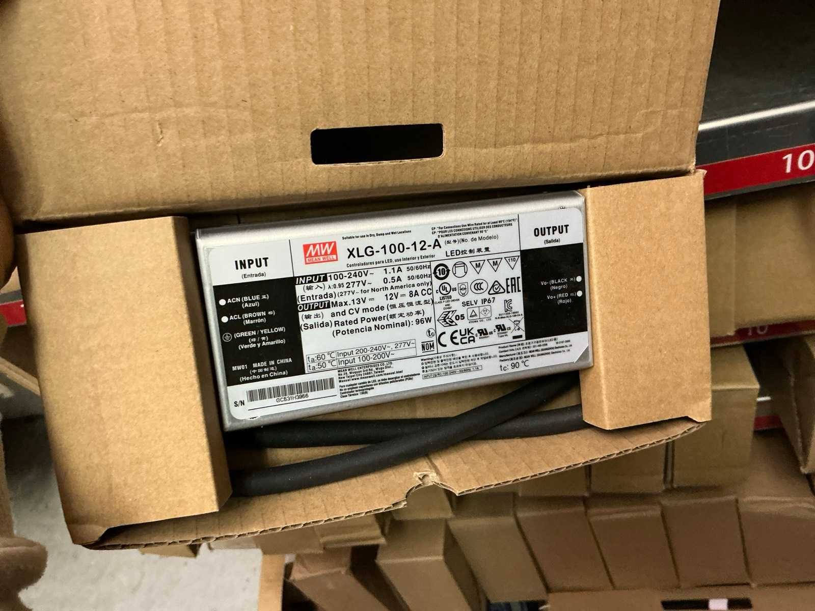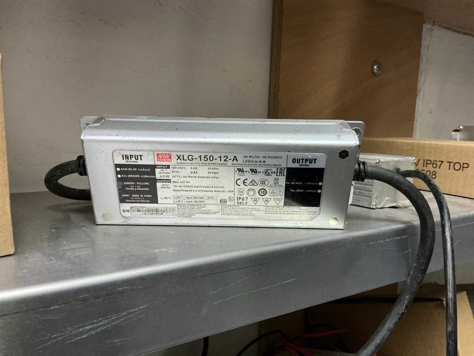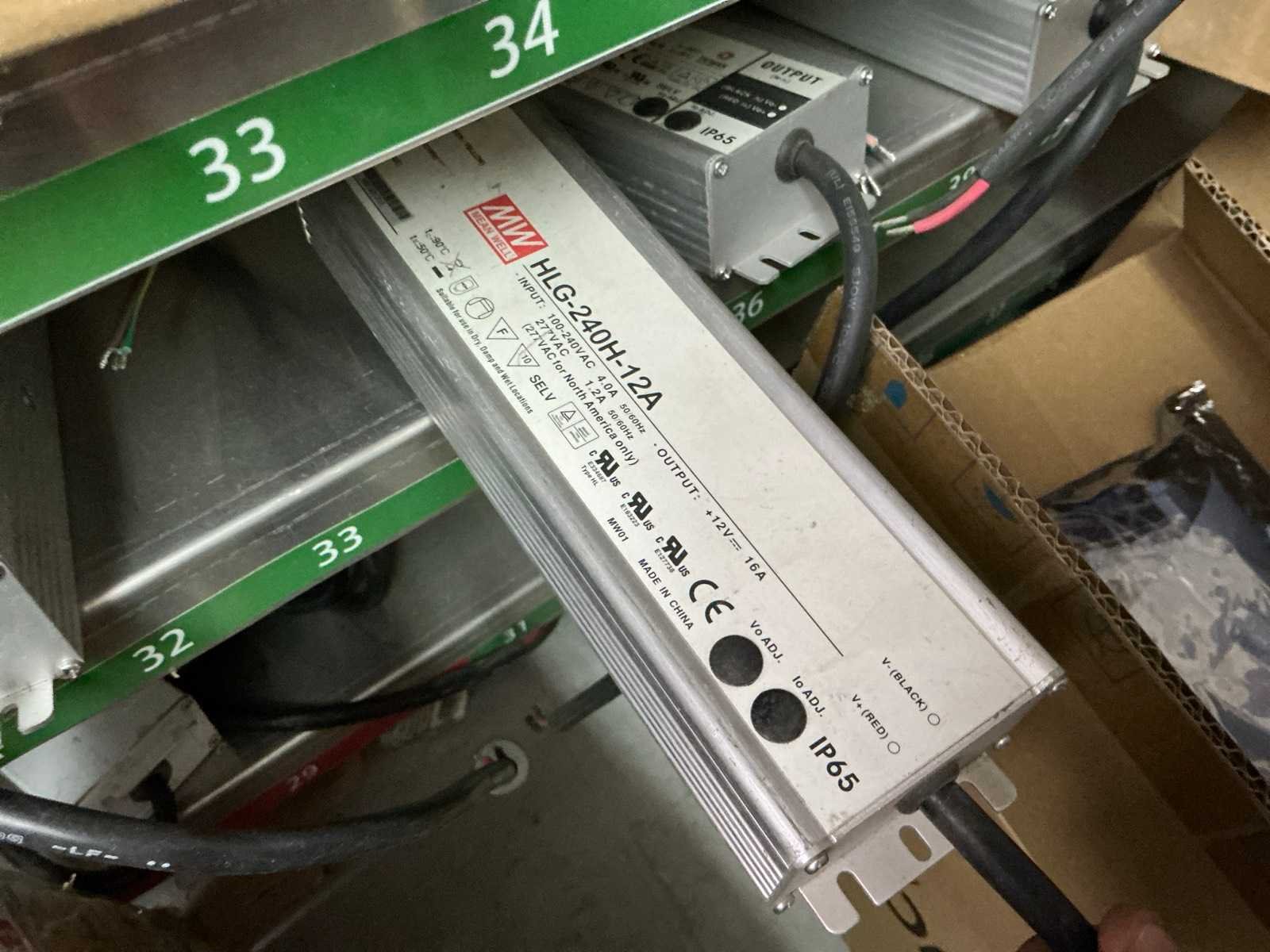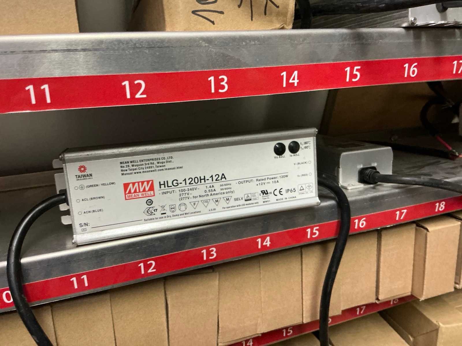 In diverse,types waaronder XLG-150-12-A, XLG-100-12-A, XLG-75-12-A, LPF-25-12, HLG-185H, HLG-320H, HLG-120H, HLG-240H, LPF-40-12, LPV-150-12, compleet met partij diverse Wagoklemmen en connectors 3M, inclusief rek Nee Merk: MW