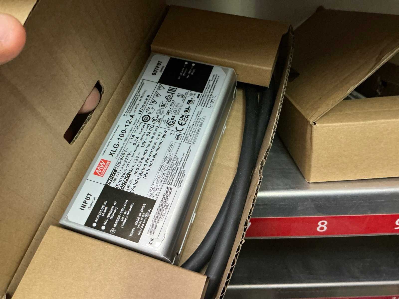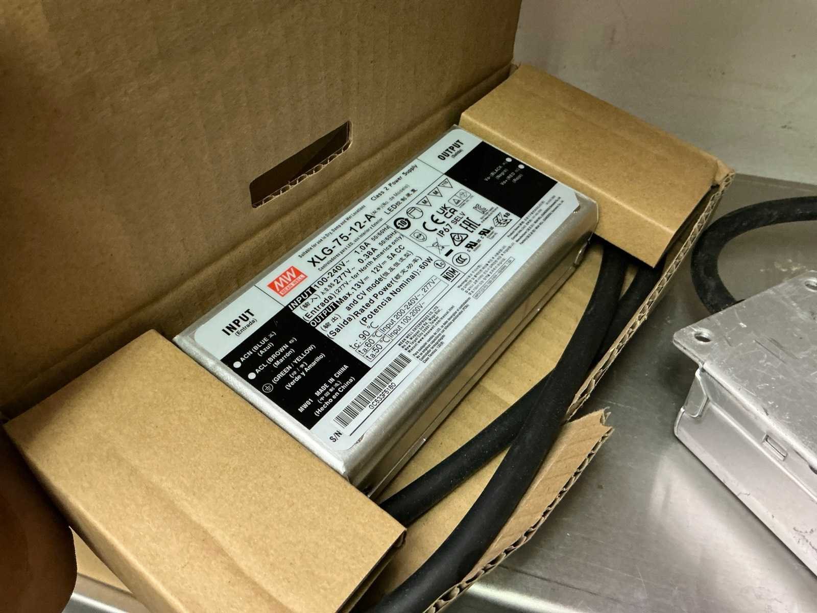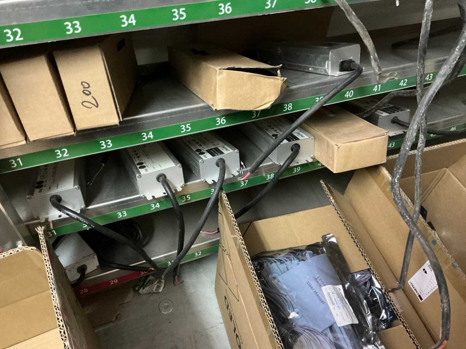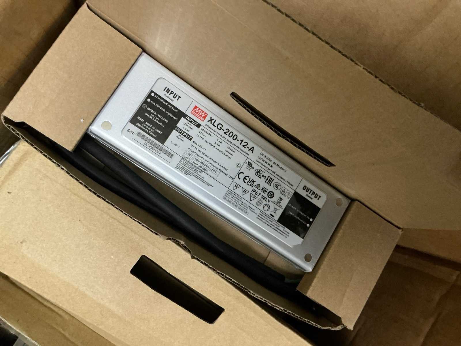 In diverse,types waaronder XLG-150-12-A, XLG-100-12-A, XLG-75-12-A, LPF-25-12, HLG-185H, HLG-320H, HLG-120H, HLG-240H, LPF-40-12, LPV-150-12, compleet met partij diverse Wagoklemmen en connectors 3M, inclusief rek Nee Merk: MW