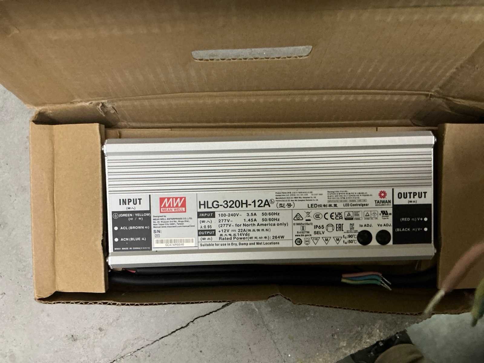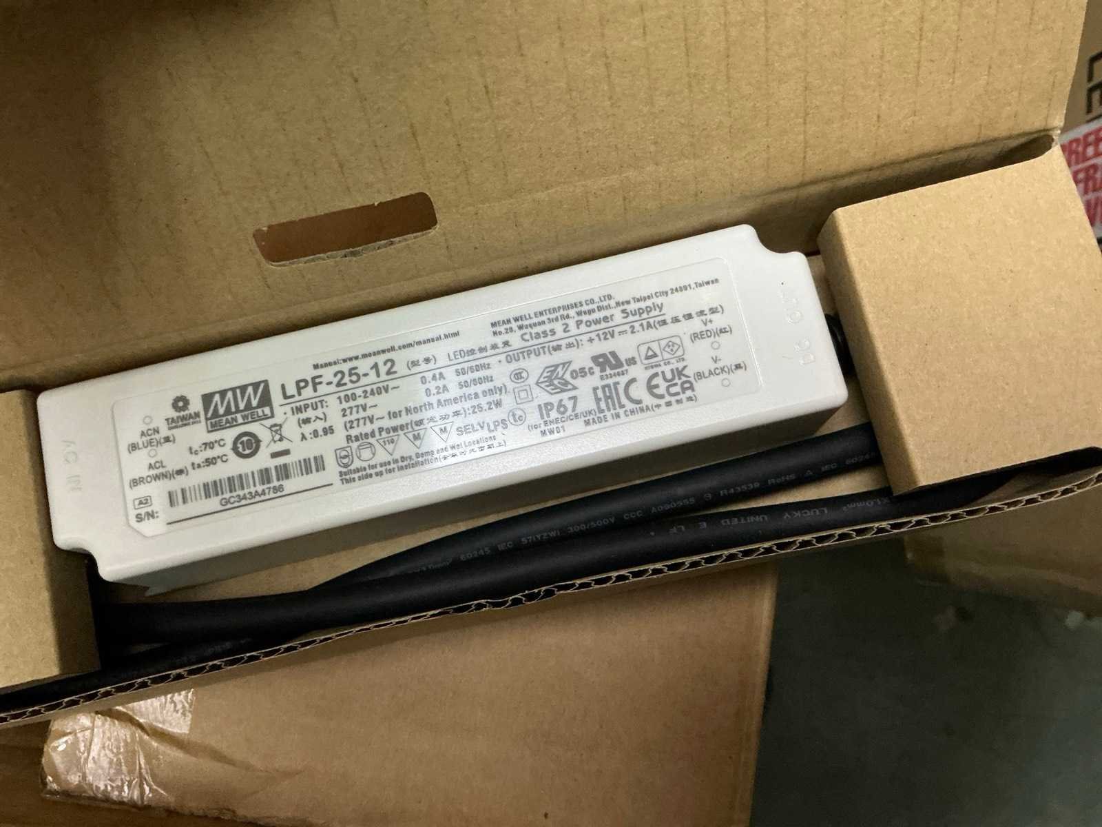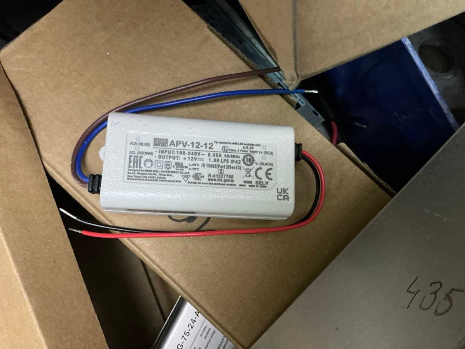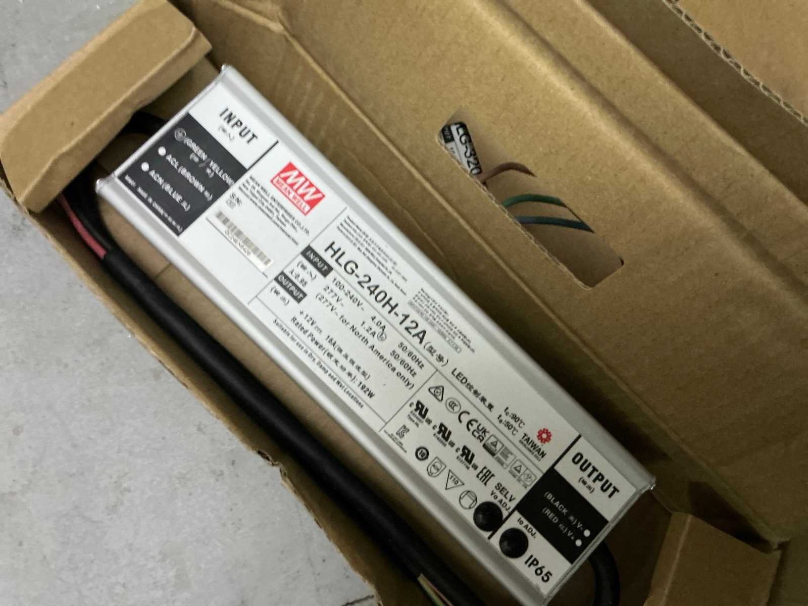 In diverse,types waaronder XLG-150-12-A, XLG-100-12-A, XLG-75-12-A, LPF-25-12, HLG-185H, HLG-320H, HLG-120H, HLG-240H, LPF-40-12, LPV-150-12, compleet met partij diverse Wagoklemmen en connectors 3M, inclusief rek Nee Merk: MW