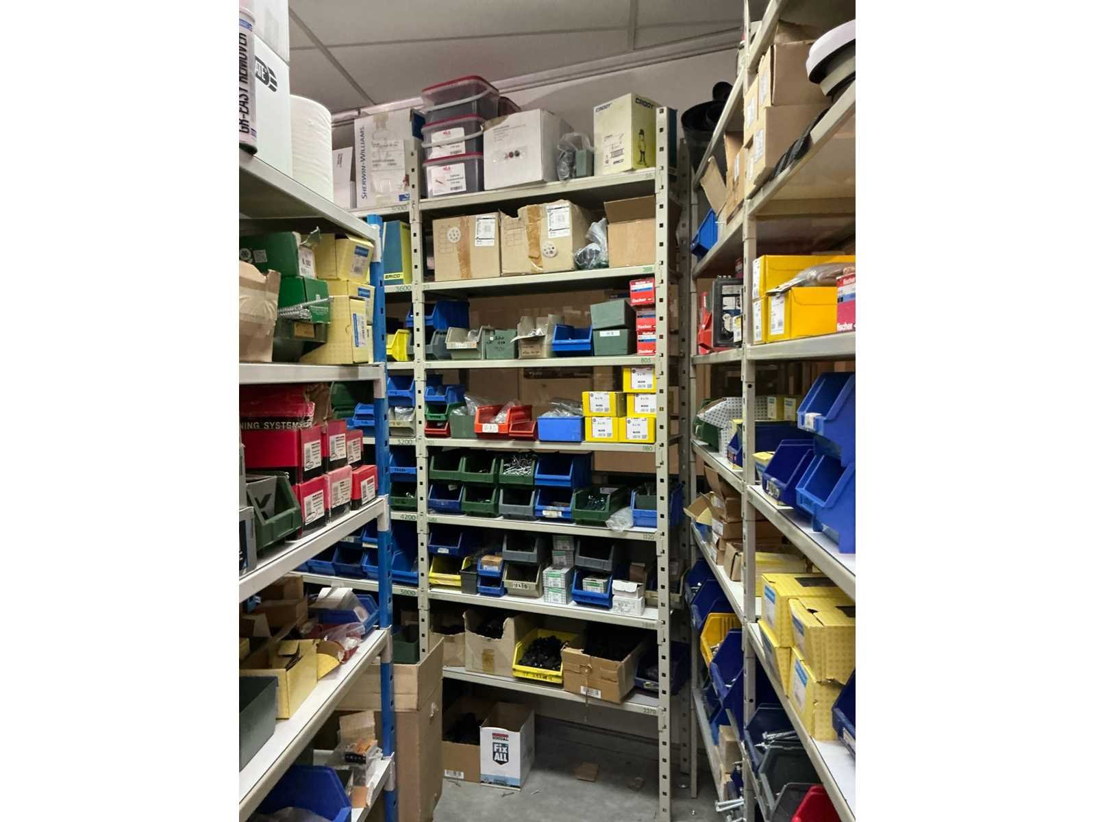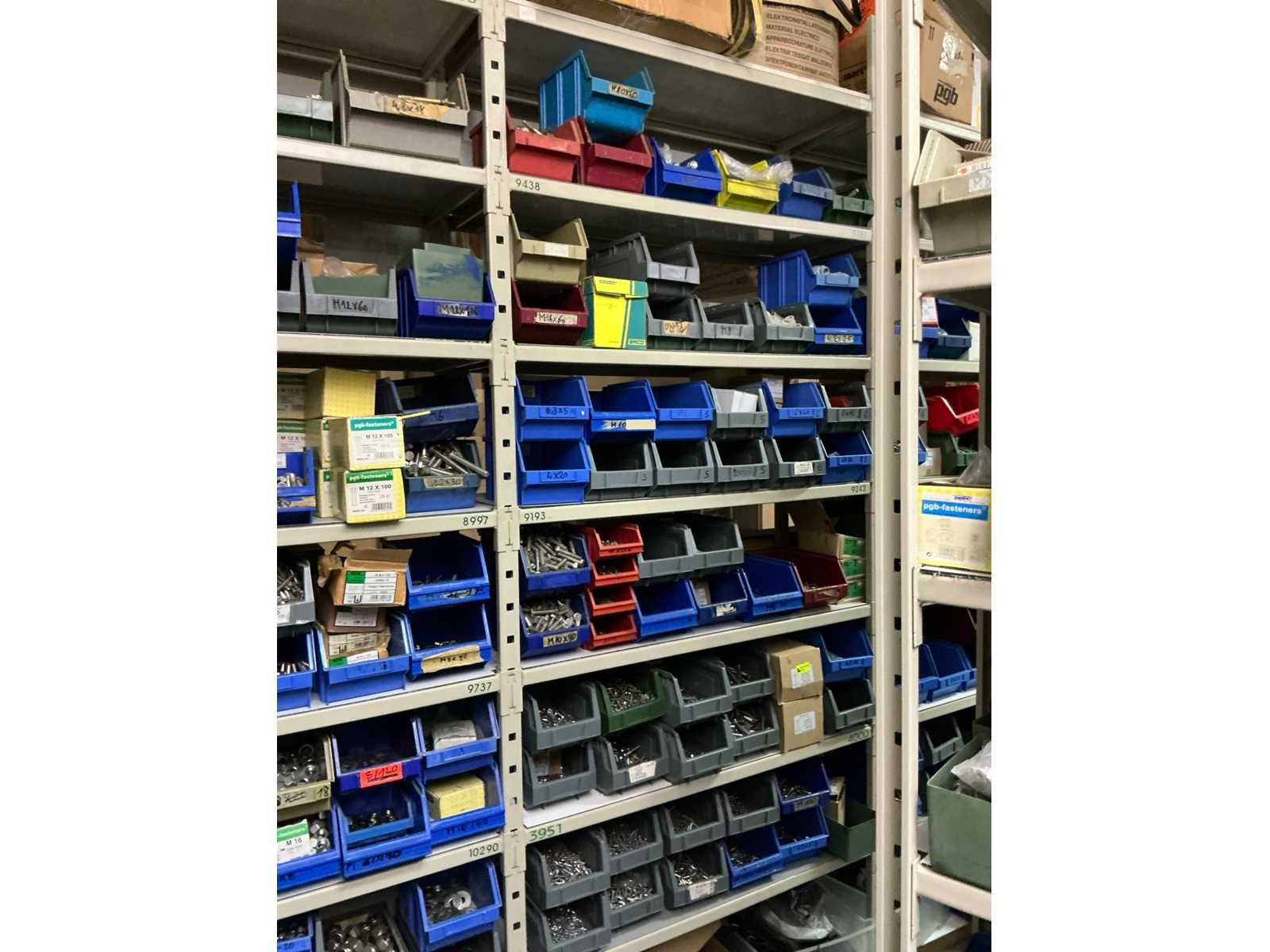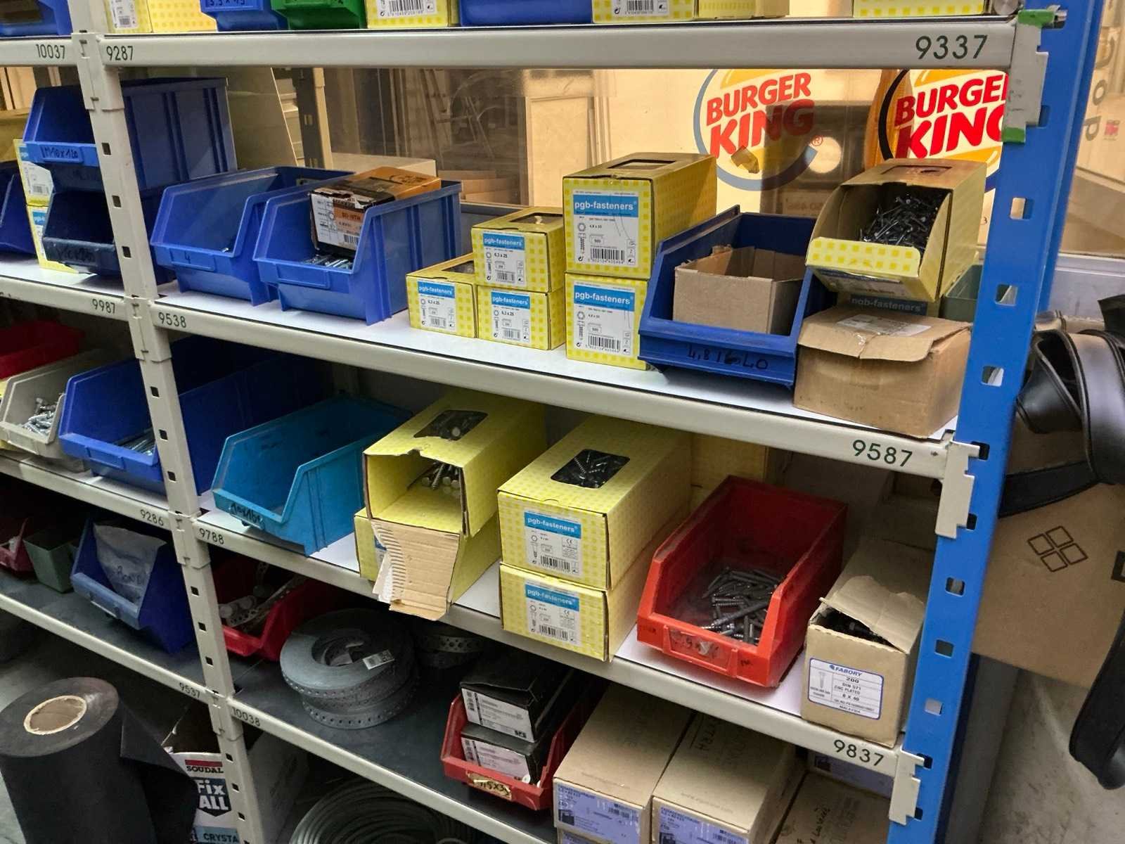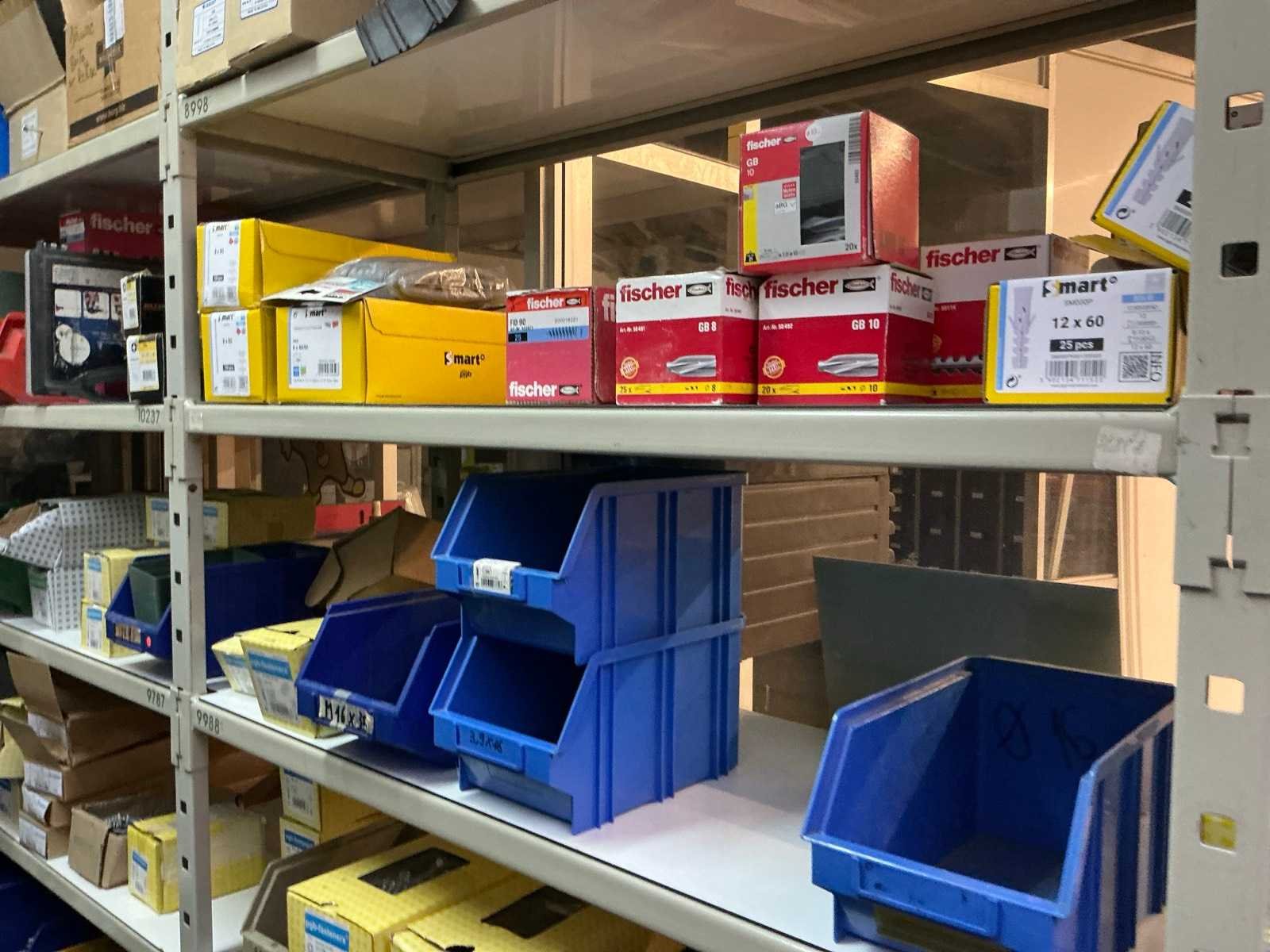 SPAX, INTERIXINGS, PGB, SOUDAL, GUNNEBO, SMART, FISCHER, SPIT, HILTI, MAXXFAST, FABORY bouten, moeren, rondellen, klemmen, oogschroeven en bouten, schroeven, hersluitingen, houtschroeven, isolatieschroeven, zelftapschroeven, pluggen, betonankers, staaldraad, afstandhouders, blindklinknagels, diverse siliconen en sealers, en kunststof afdekkapjes, in metalen magazijnstelling, betonboren, slijpschrijven,.., zonder stelling, compleet met dossierkast Nee Type: Grote