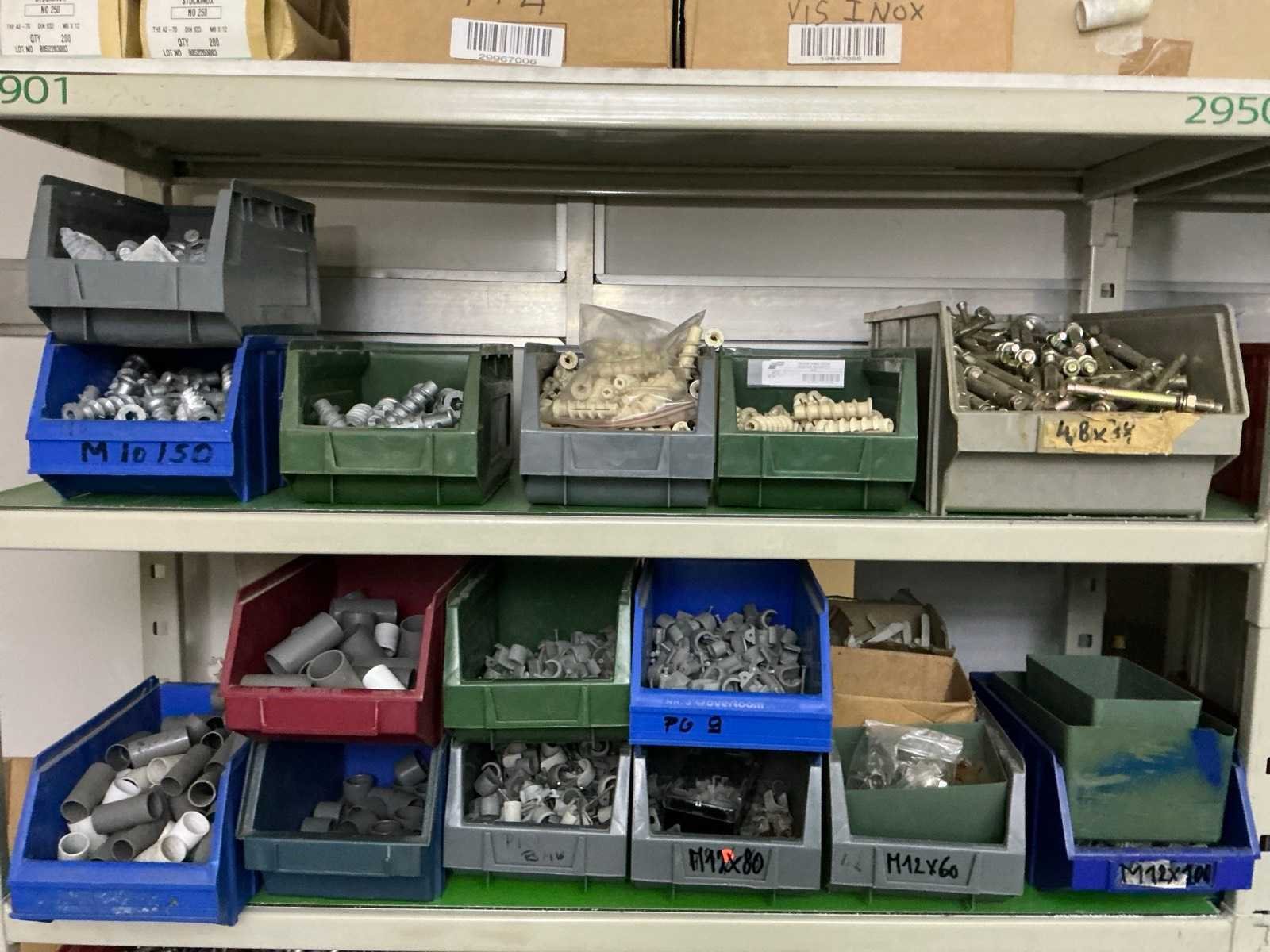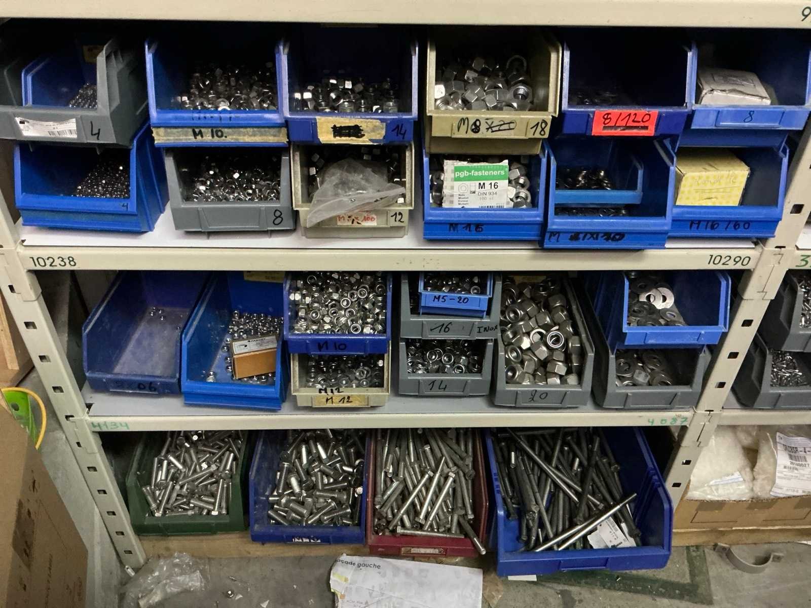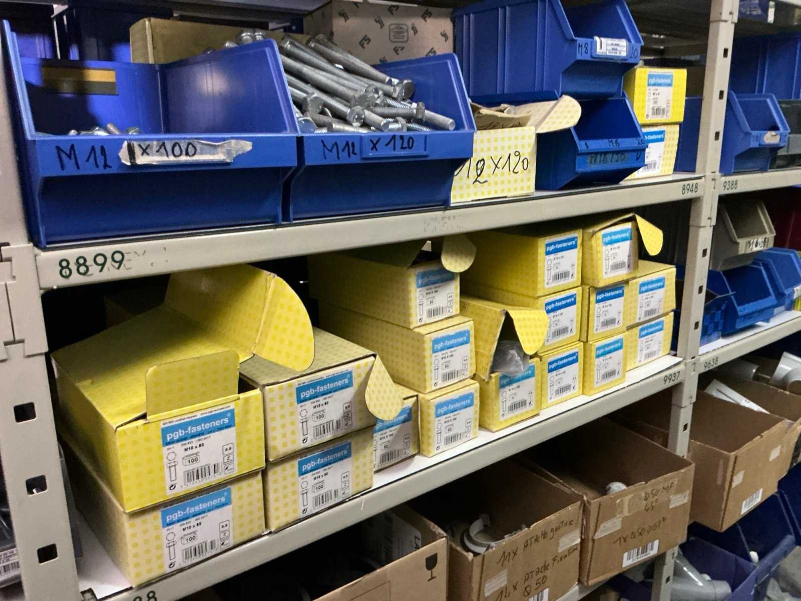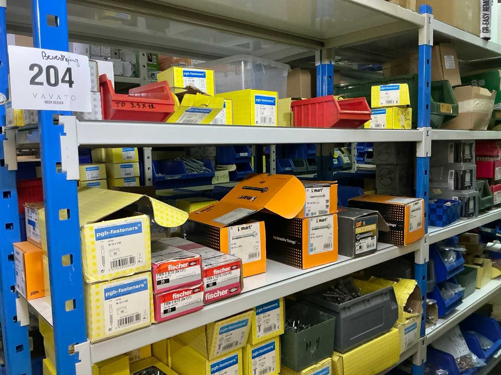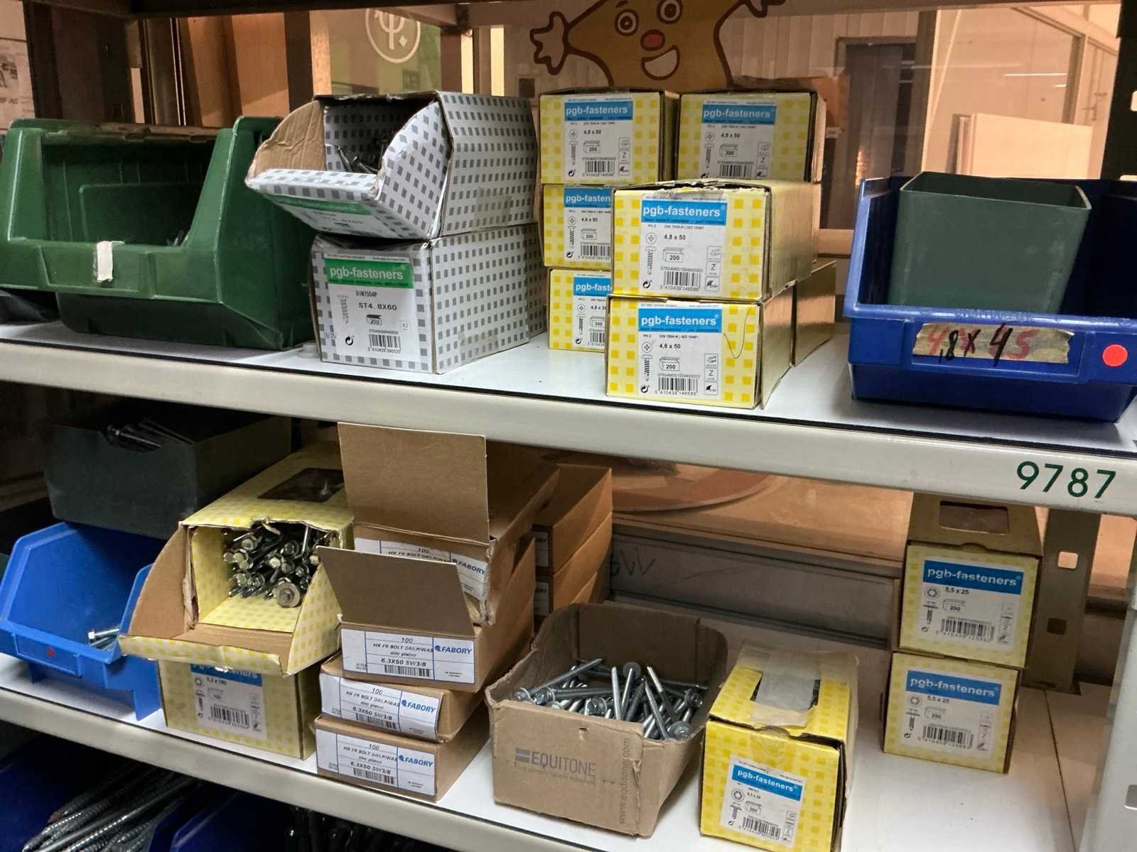 SPAX, INTERIXINGS, PGB, SOUDAL, GUNNEBO, SMART, FISCHER, SPIT, HILTI, MAXXFAST, FABORY bouten, moeren, rondellen, klemmen, oogschroeven en bouten, schroeven, hersluitingen, houtschroeven, isolatieschroeven, zelftapschroeven, pluggen, betonankers, staaldraad, afstandhouders, blindklinknagels, diverse siliconen en sealers, en kunststof afdekkapjes, in metalen magazijnstelling, betonboren, slijpschrijven,.., zonder stelling, compleet met dossierkast Nee Type: Grote