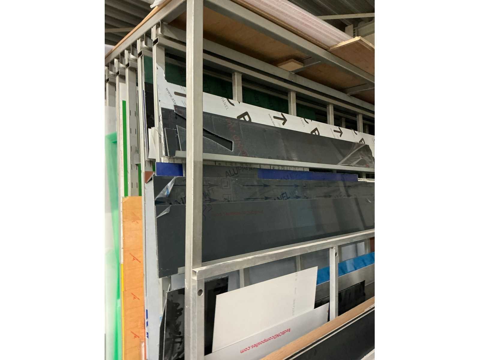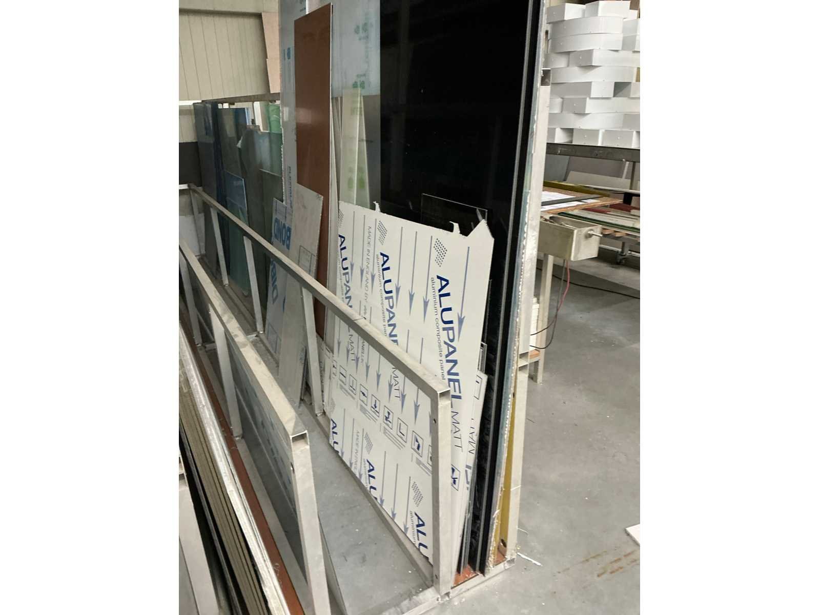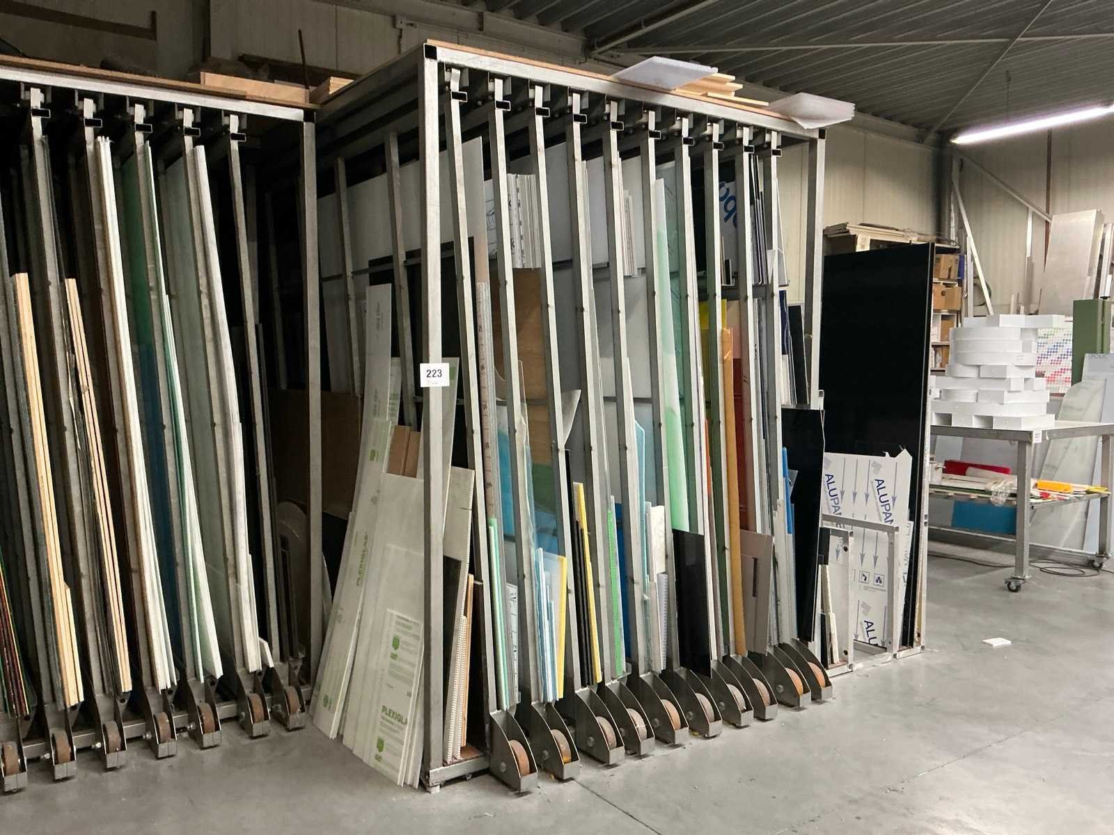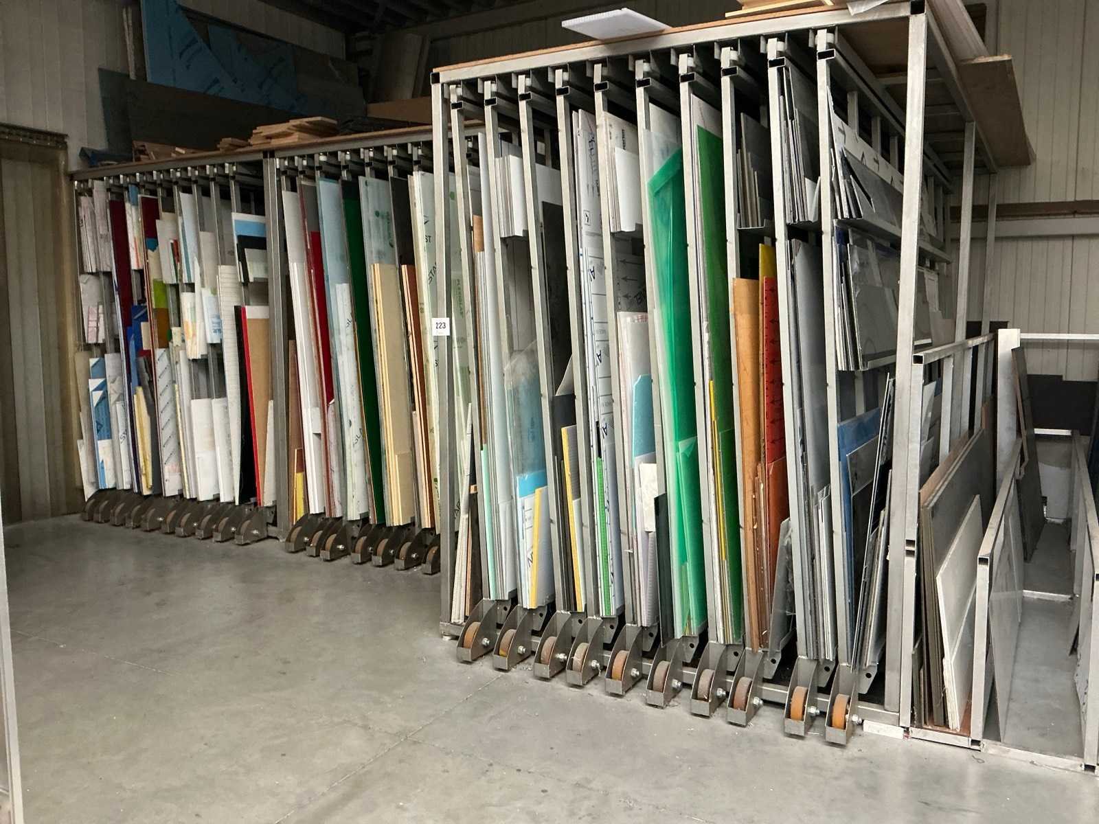2 x Voorzien van 10 uitrolbare platenhouders elk circa. 300 x 250cm, 1 x voorzien van 10 uitrolbare platenhouders circa. 195 x 400 x 250 cm Inhoudende enige diverse reeds aangebroken pvc en houten platen in diverse maten en uitvoeringen compleet met aluminium aanbouwstuk van circa. 84 x 400 x 133 cm met inhoud Nee Demontabel: true Totale afmeting L: 300cm Totale afmeting Breedte: 390cm Totale afmeting Hoogte: 250cm