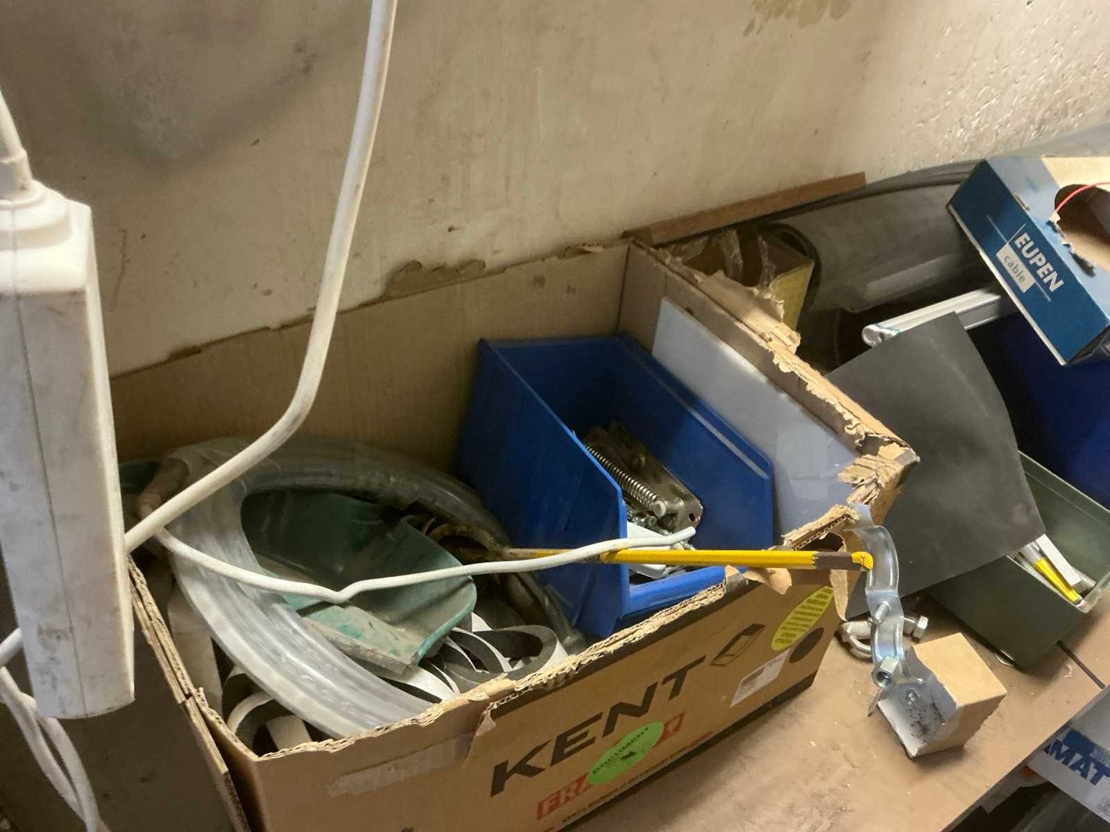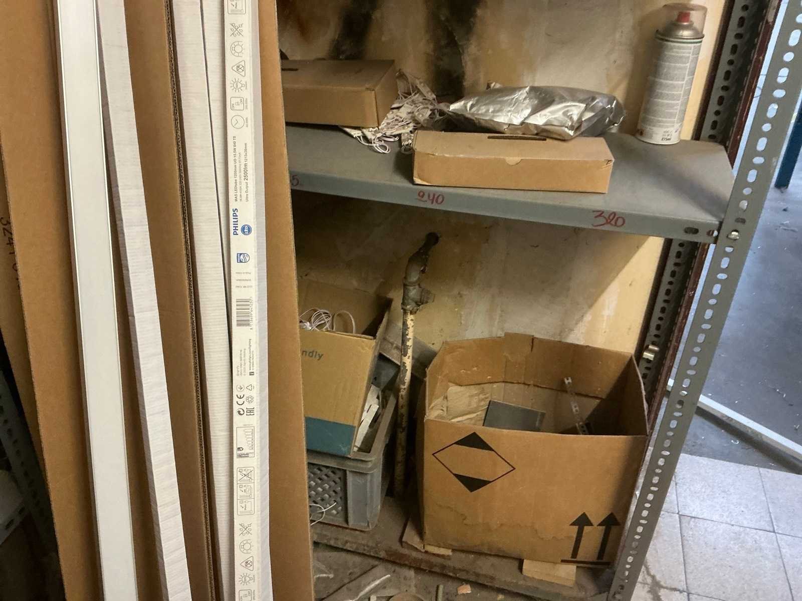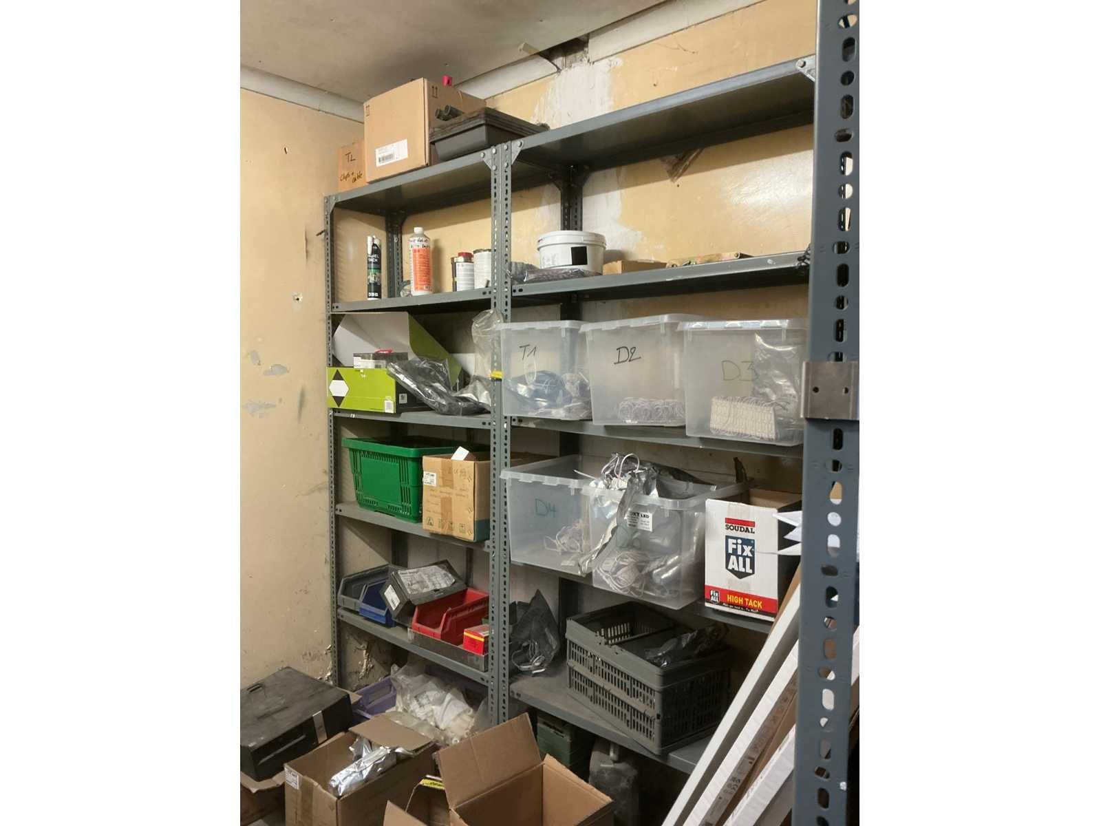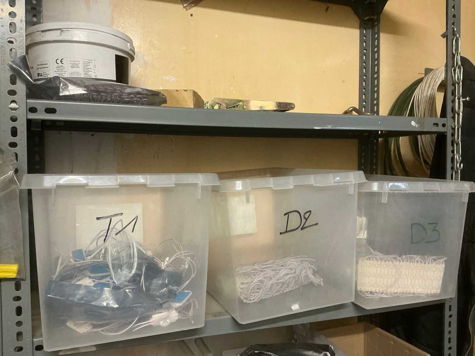 Bestaande uit 4 diverse metalen opbergrekken waaronder van circa. 185 x 32 x 200 cm compleet met inhoud waaronder partij divers elektrotoebehoren, enig bevestigingsmateriaal, enzovoort Nee