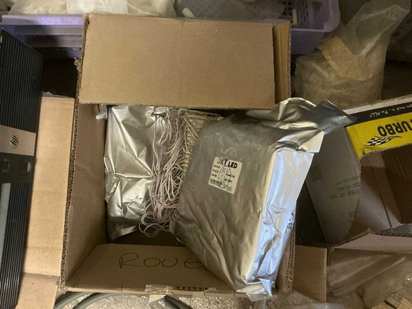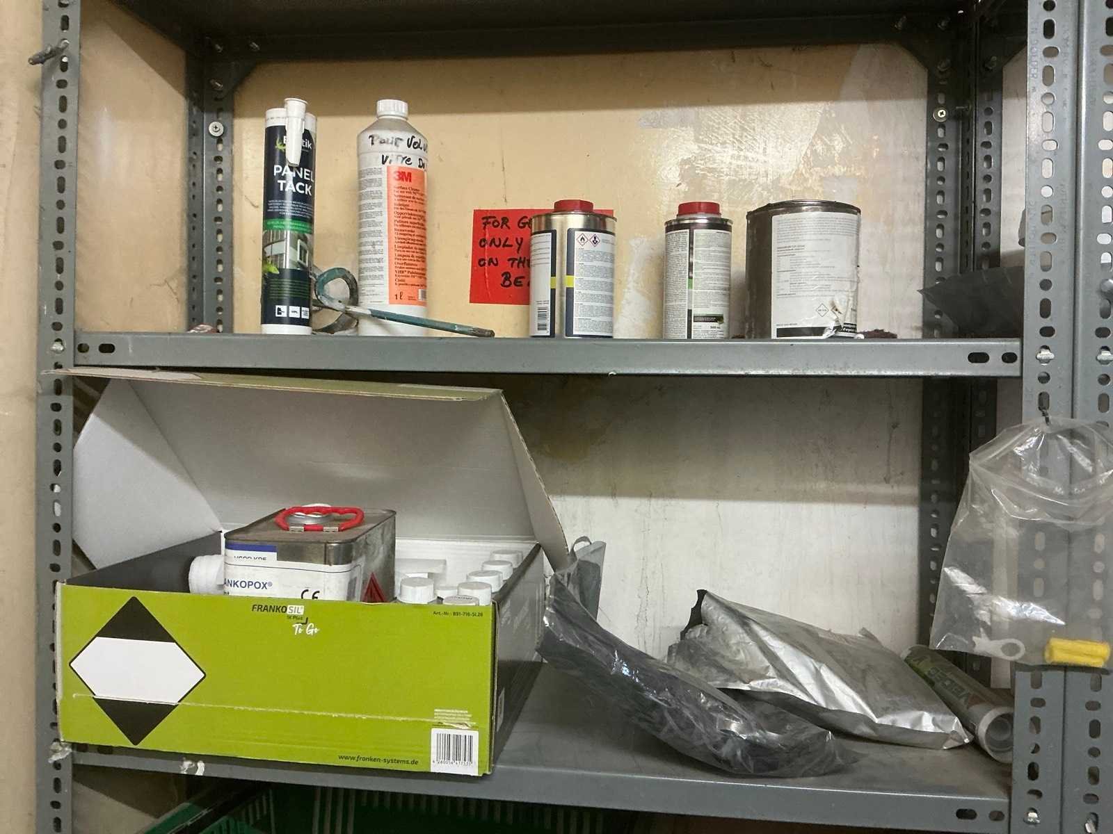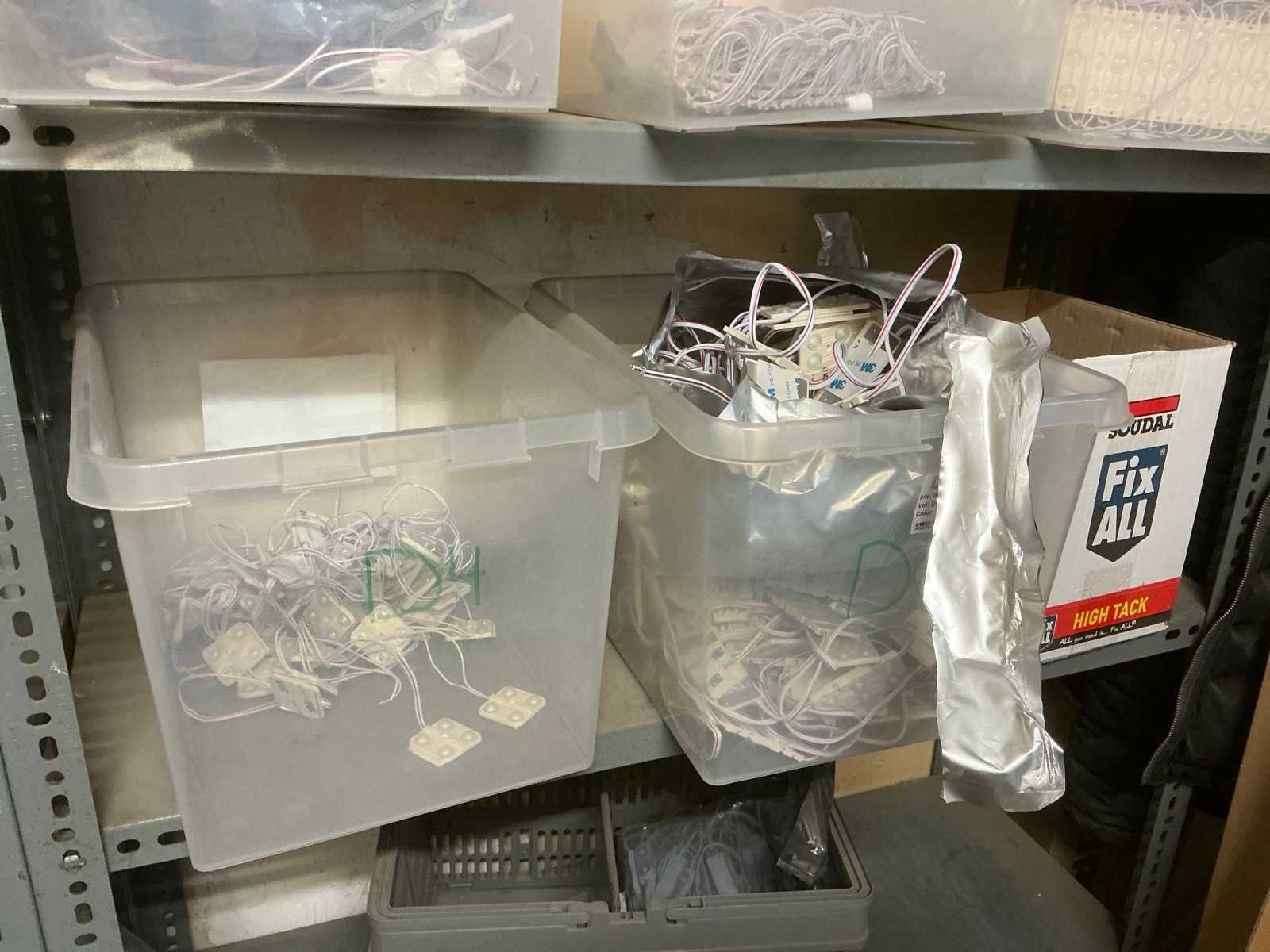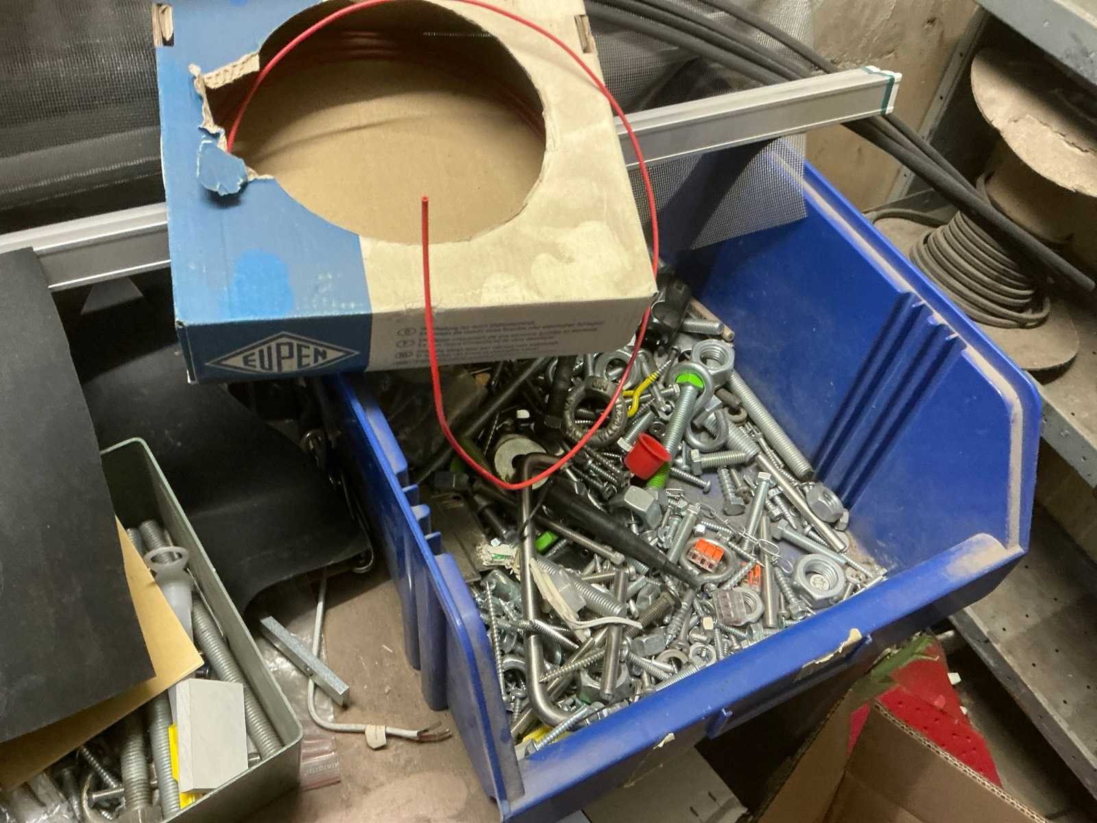 Bestaande uit 4 diverse metalen opbergrekken waaronder van circa. 185 x 32 x 200 cm compleet met inhoud waaronder partij divers elektrotoebehoren, enig bevestigingsmateriaal, enzovoort Nee