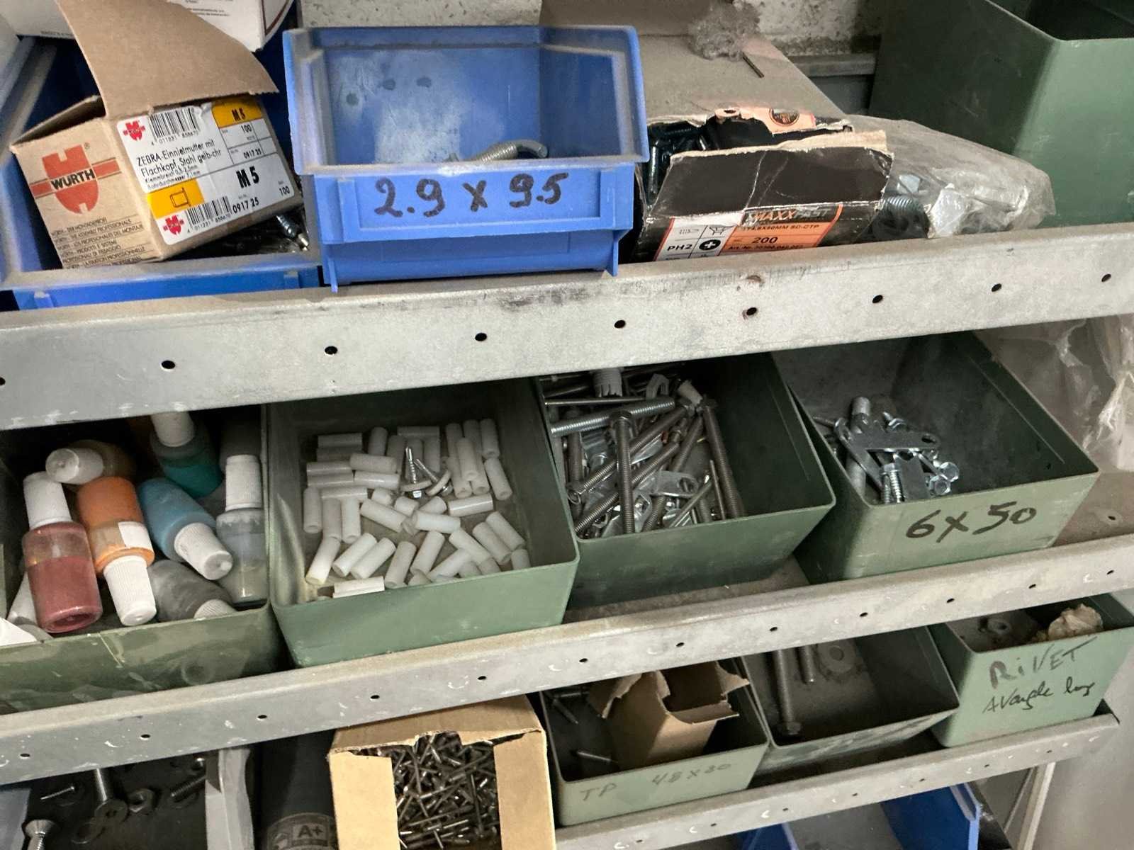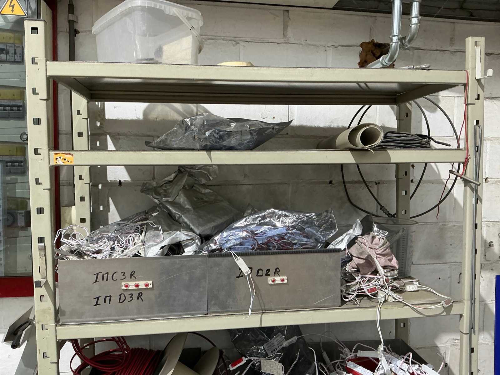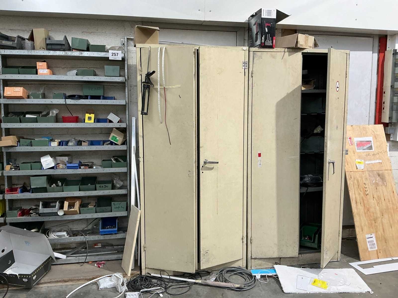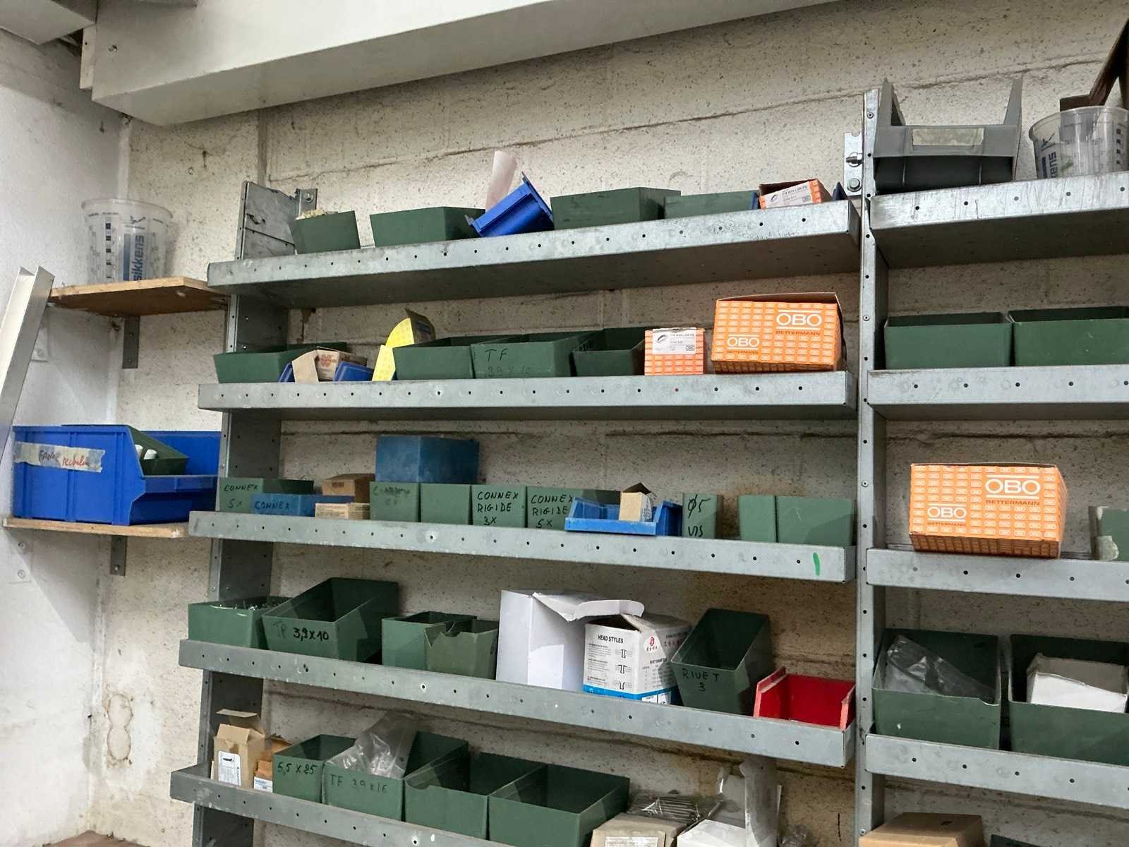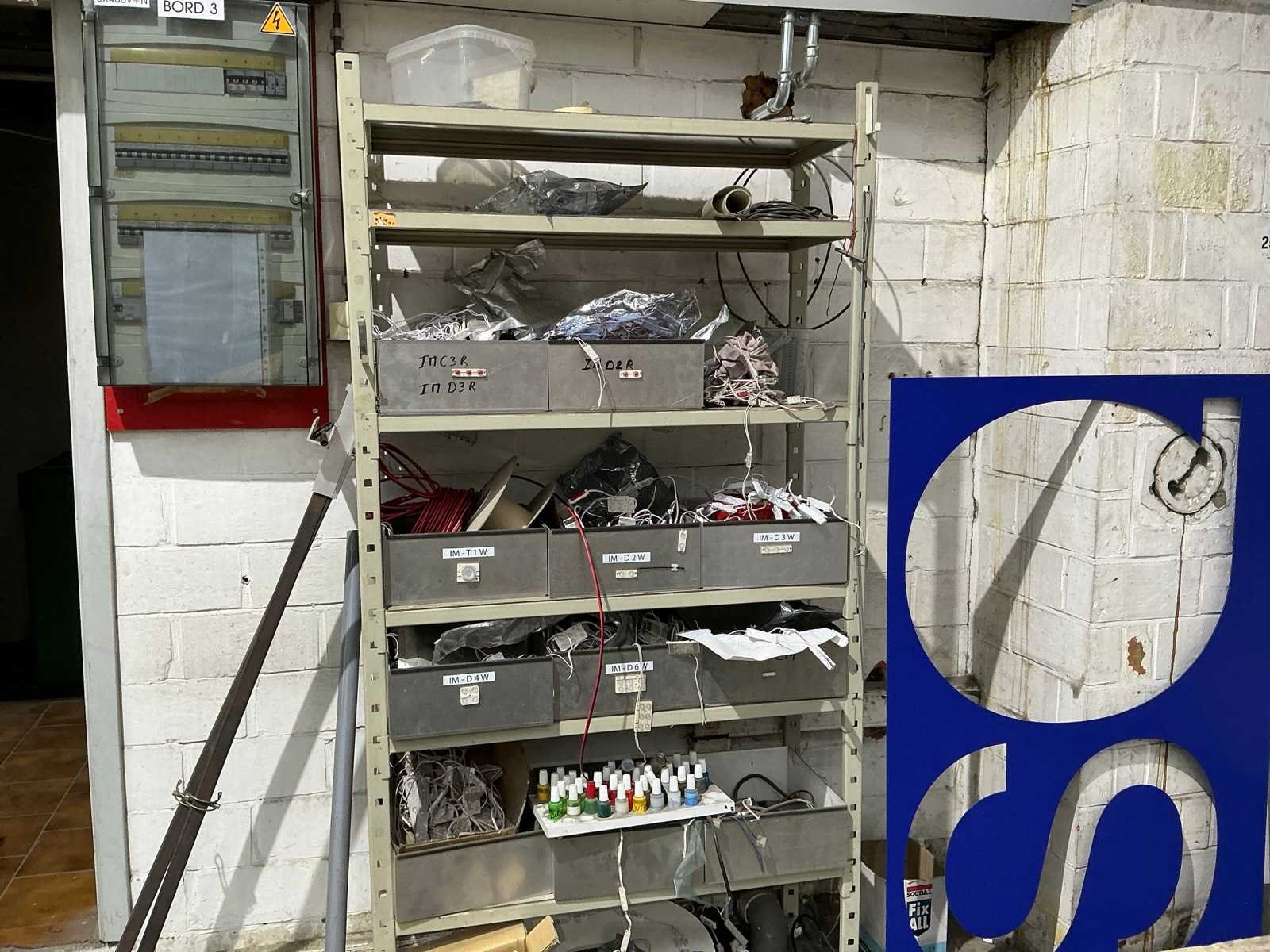 Waaronder partij bouten, moeren, schroeven, divers handgereedschap, klemmen, tape, partij divers elektrotoebehoren, compleet met 2 metalen kasten elk van circa. 92 x 43 x 195 cm en 2 metalen opbergrekken waaronder 1 van circa. 105 x 37 x 200 cm Nee