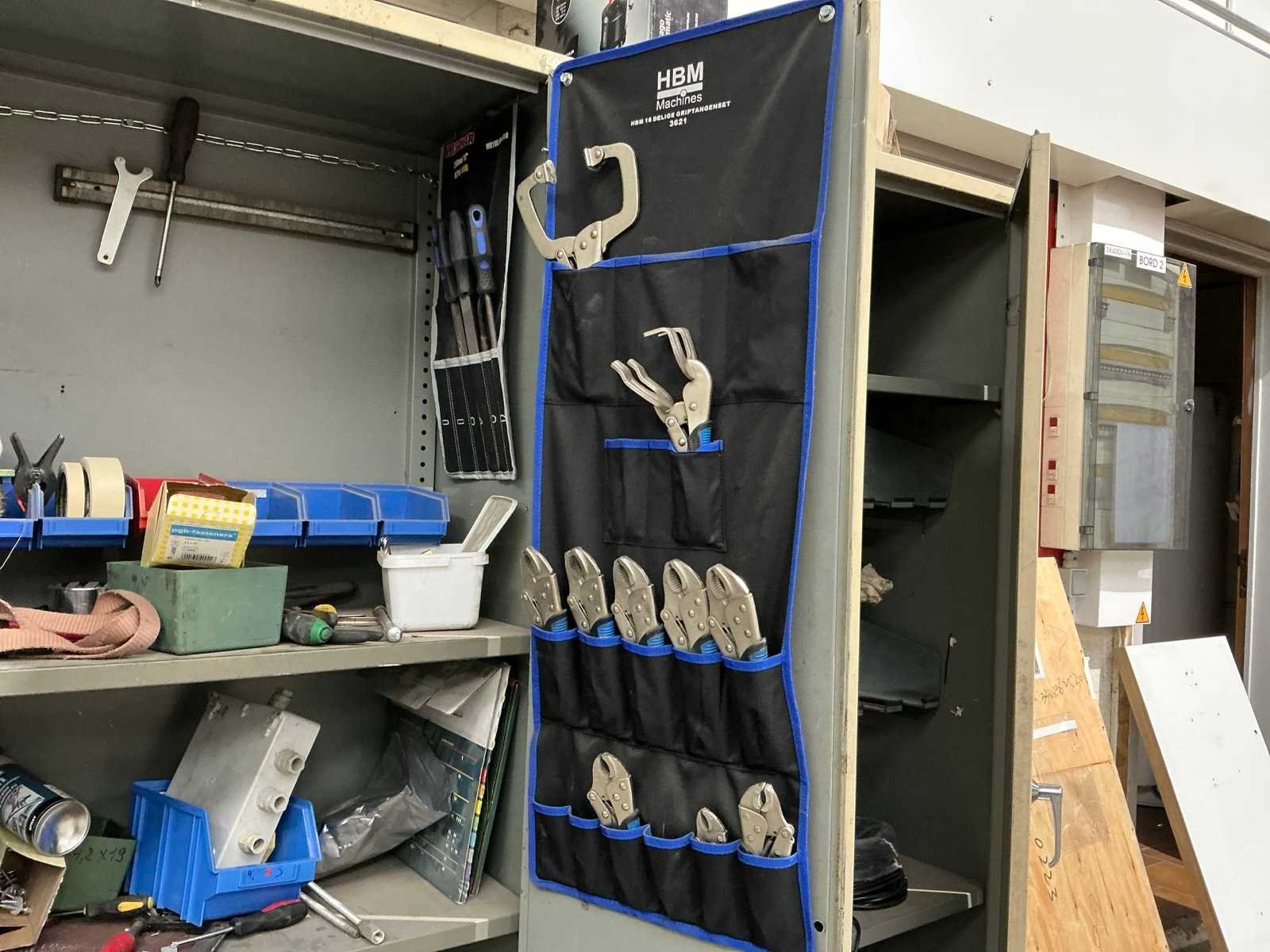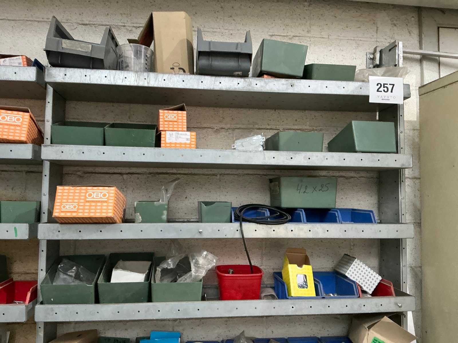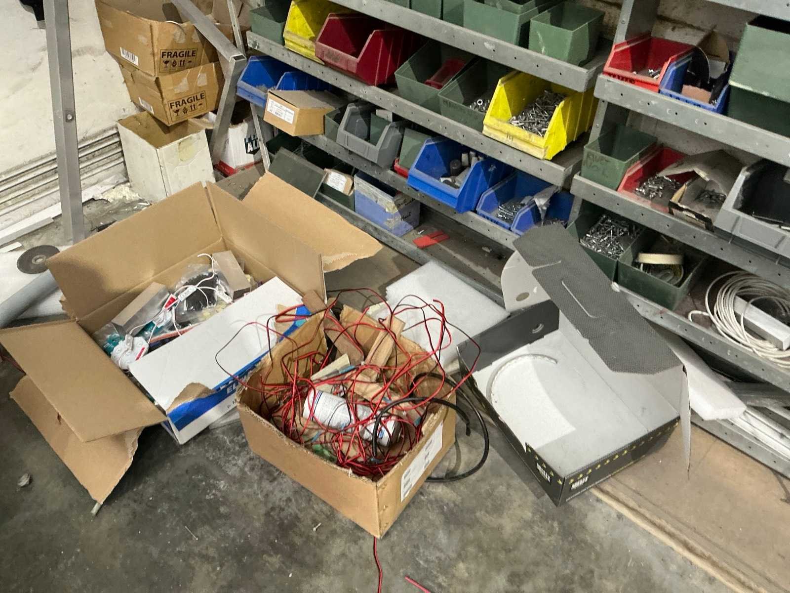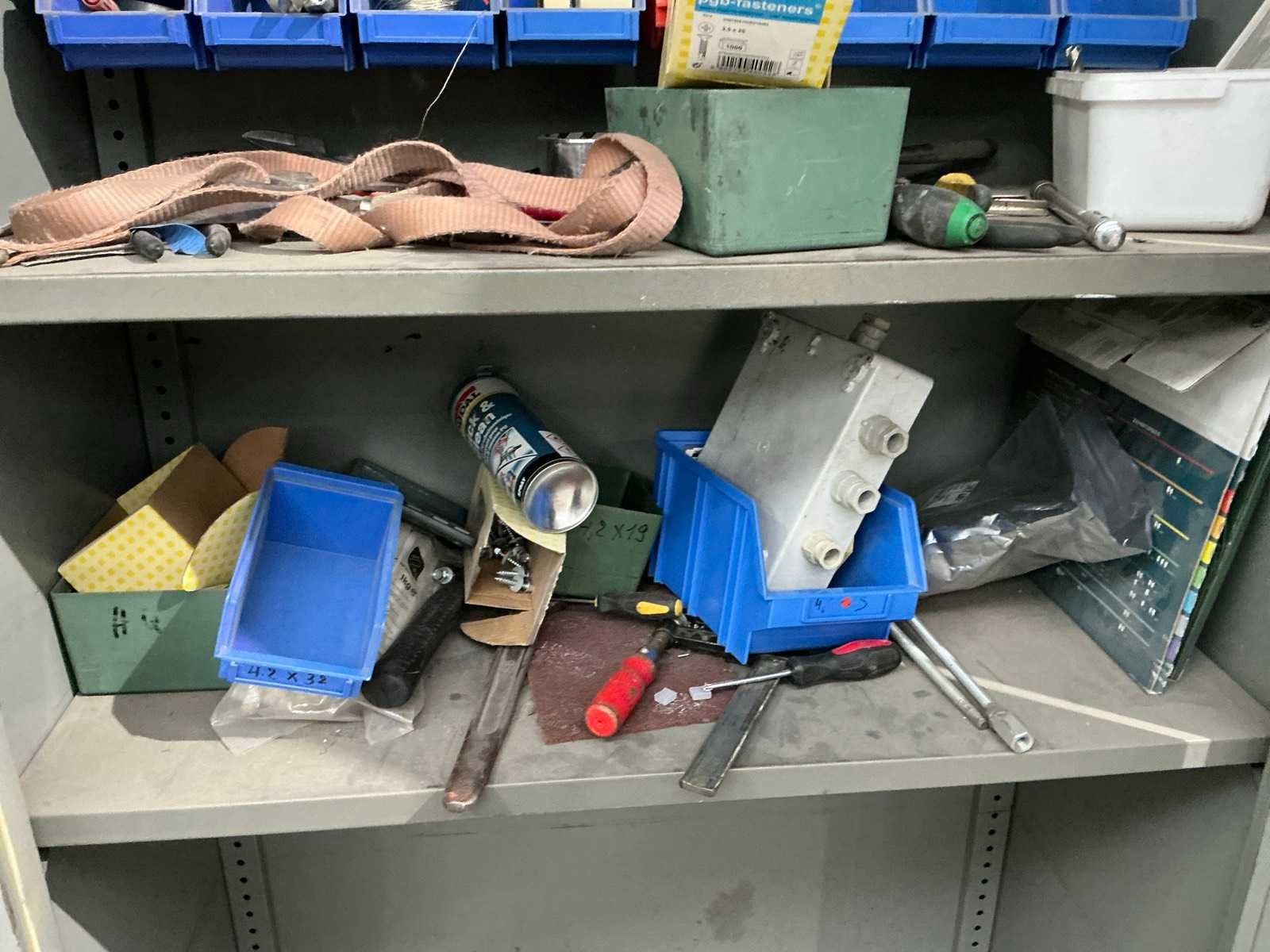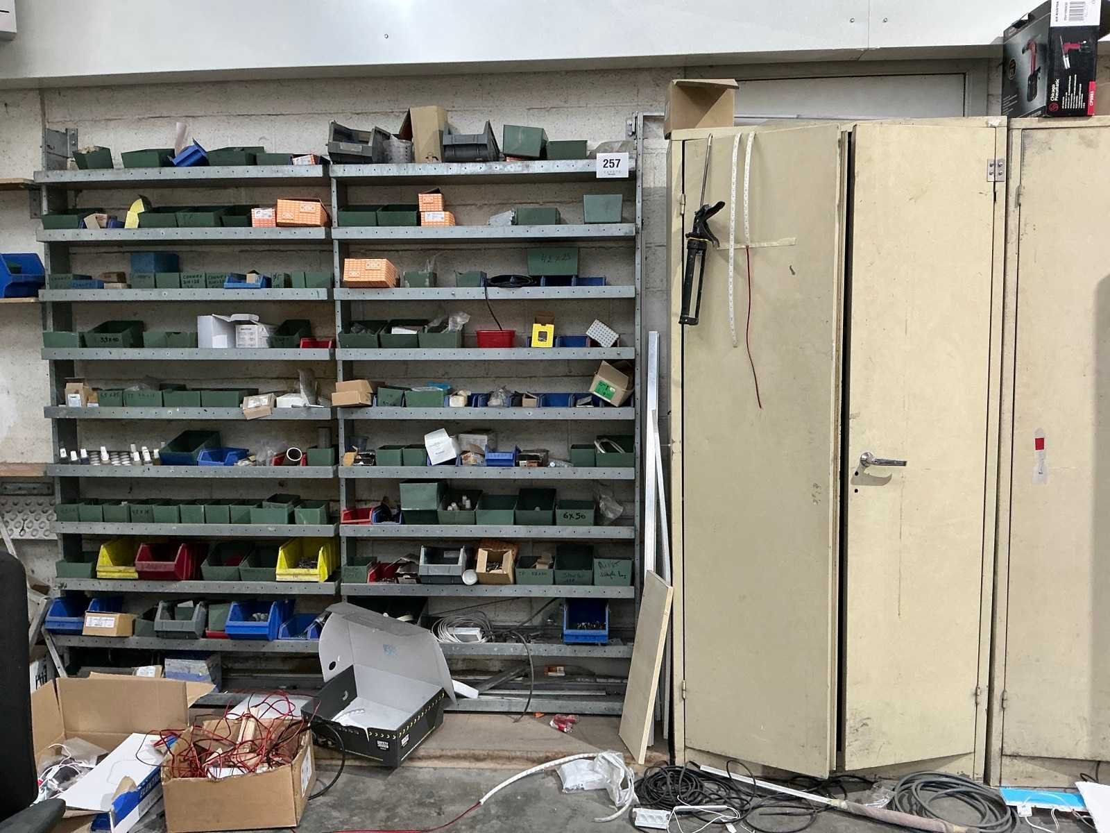 Waaronder partij bouten, moeren, schroeven, divers handgereedschap, klemmen, tape, partij divers elektrotoebehoren, compleet met 2 metalen kasten elk van circa. 92 x 43 x 195 cm en 2 metalen opbergrekken waaronder 1 van circa. 105 x 37 x 200 cm Nee