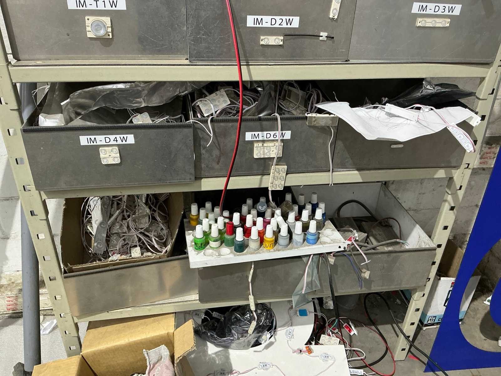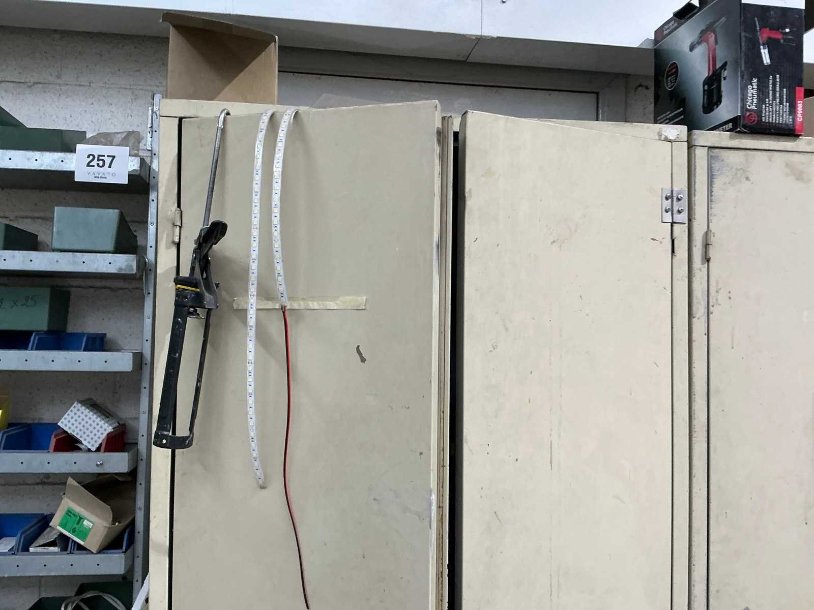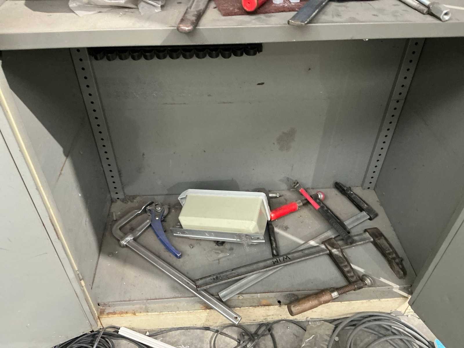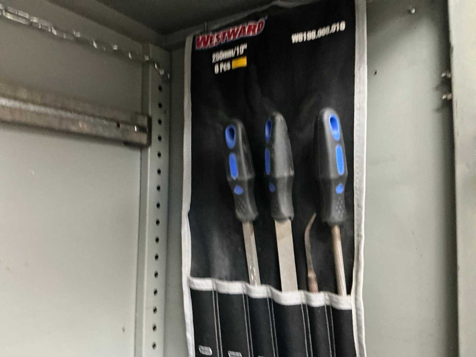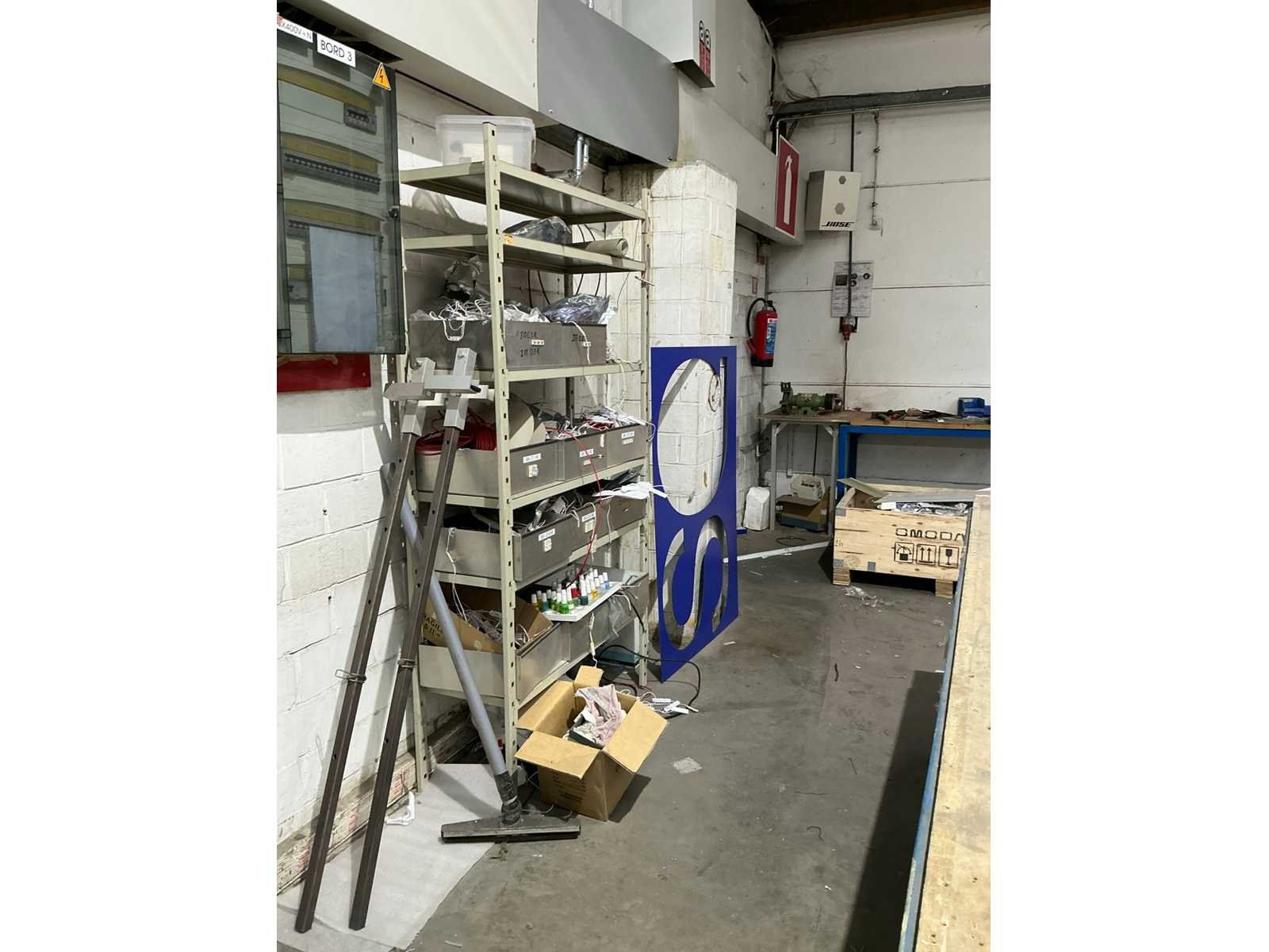 Waaronder partij bouten, moeren, schroeven, divers handgereedschap, klemmen, tape, partij divers elektrotoebehoren, compleet met 2 metalen kasten elk van circa. 92 x 43 x 195 cm en 2 metalen opbergrekken waaronder 1 van circa. 105 x 37 x 200 cm Nee