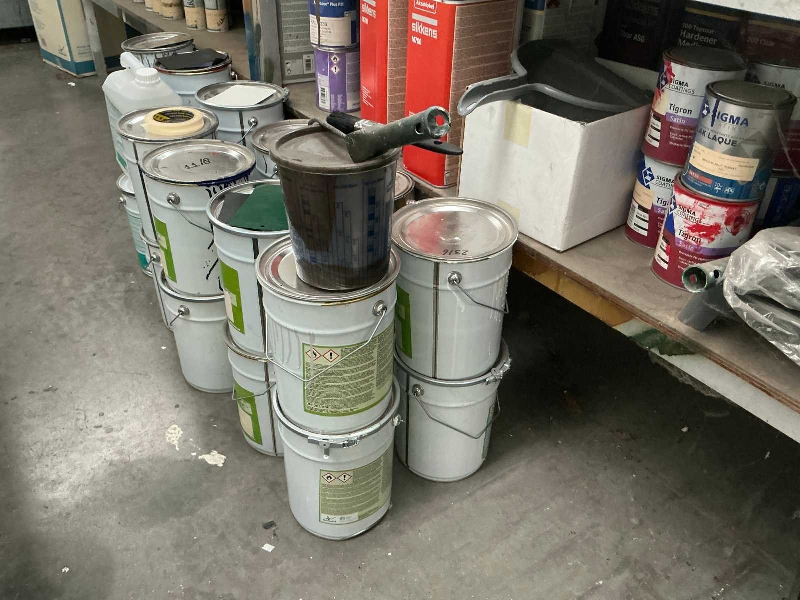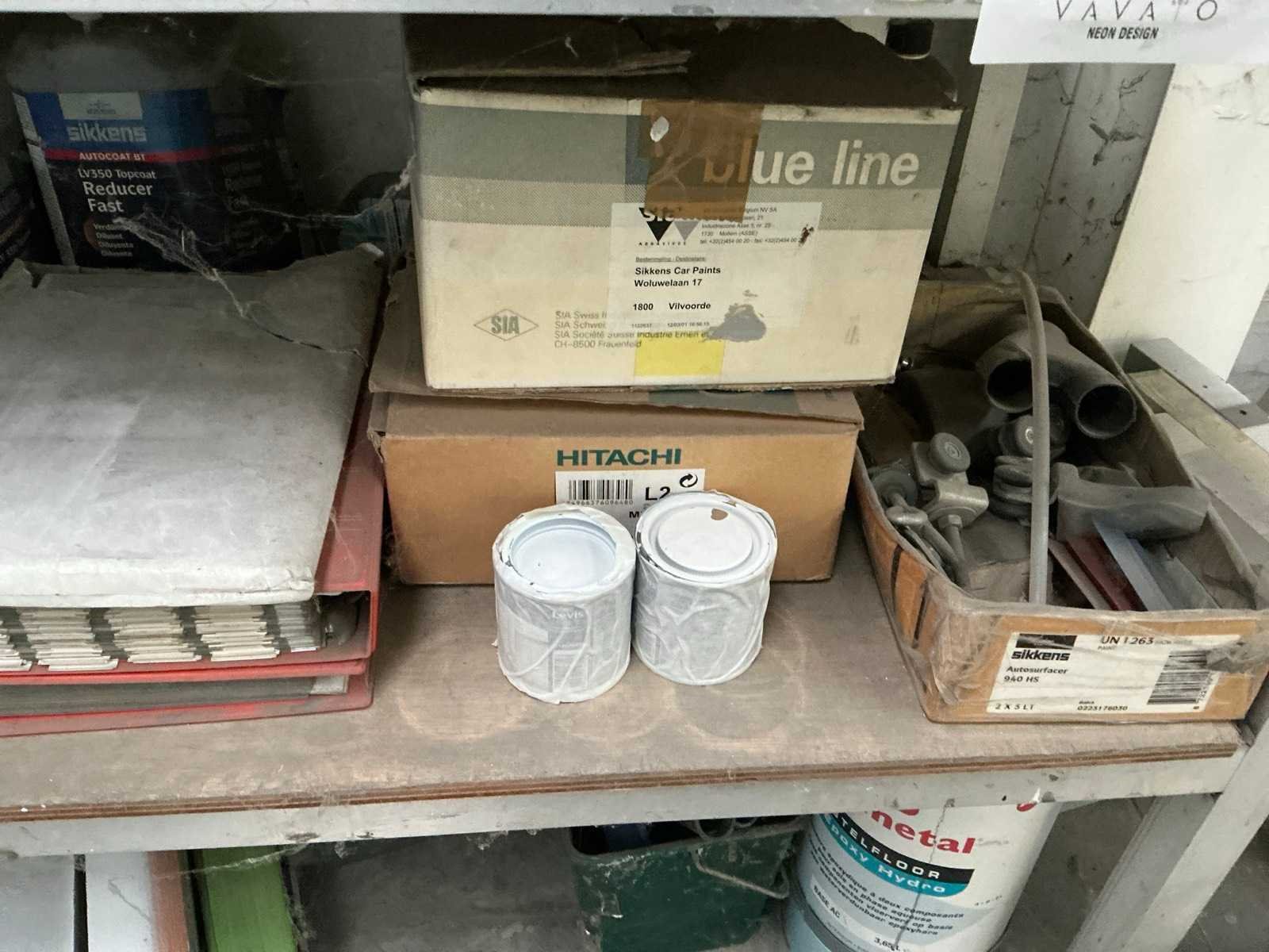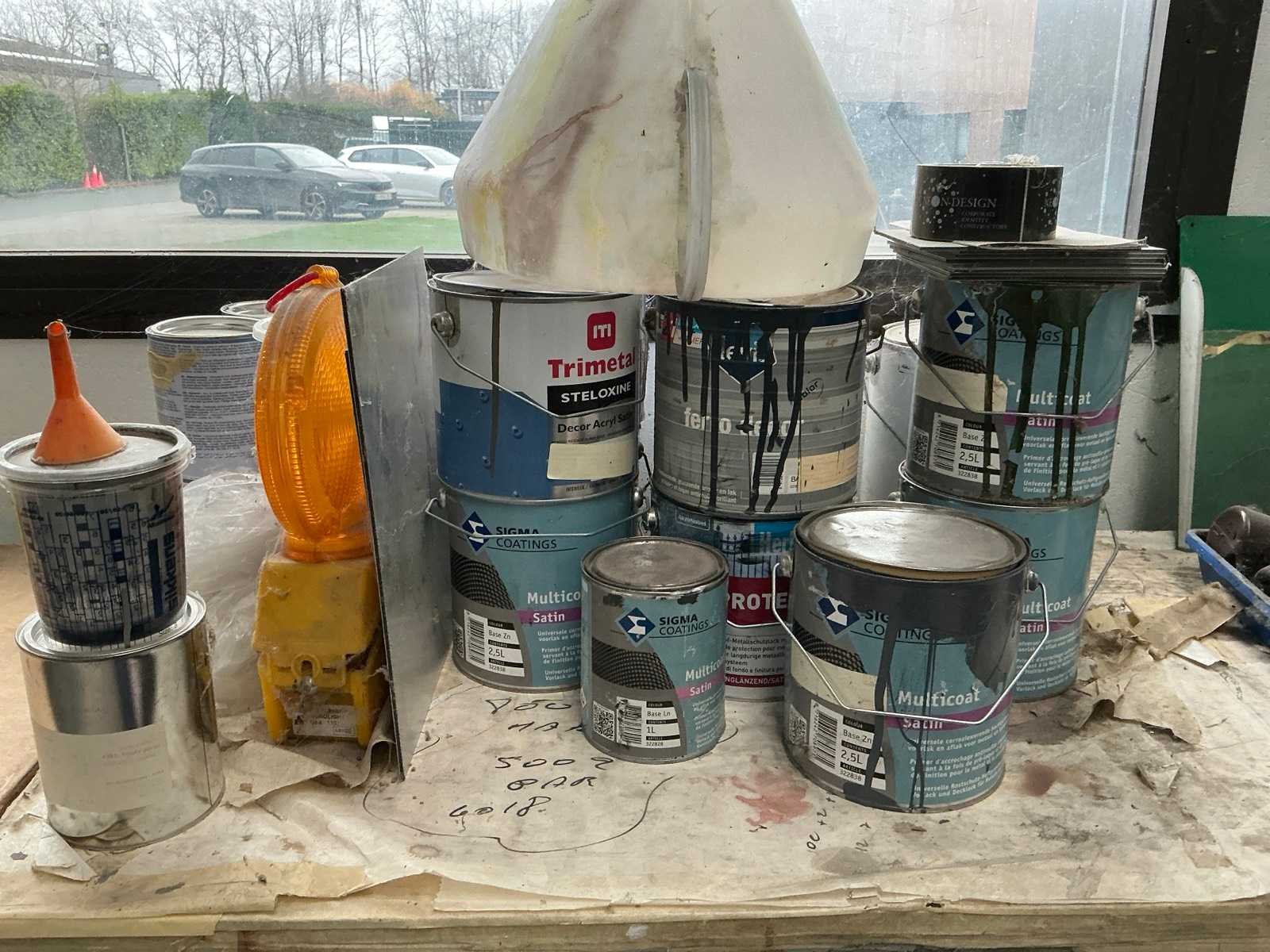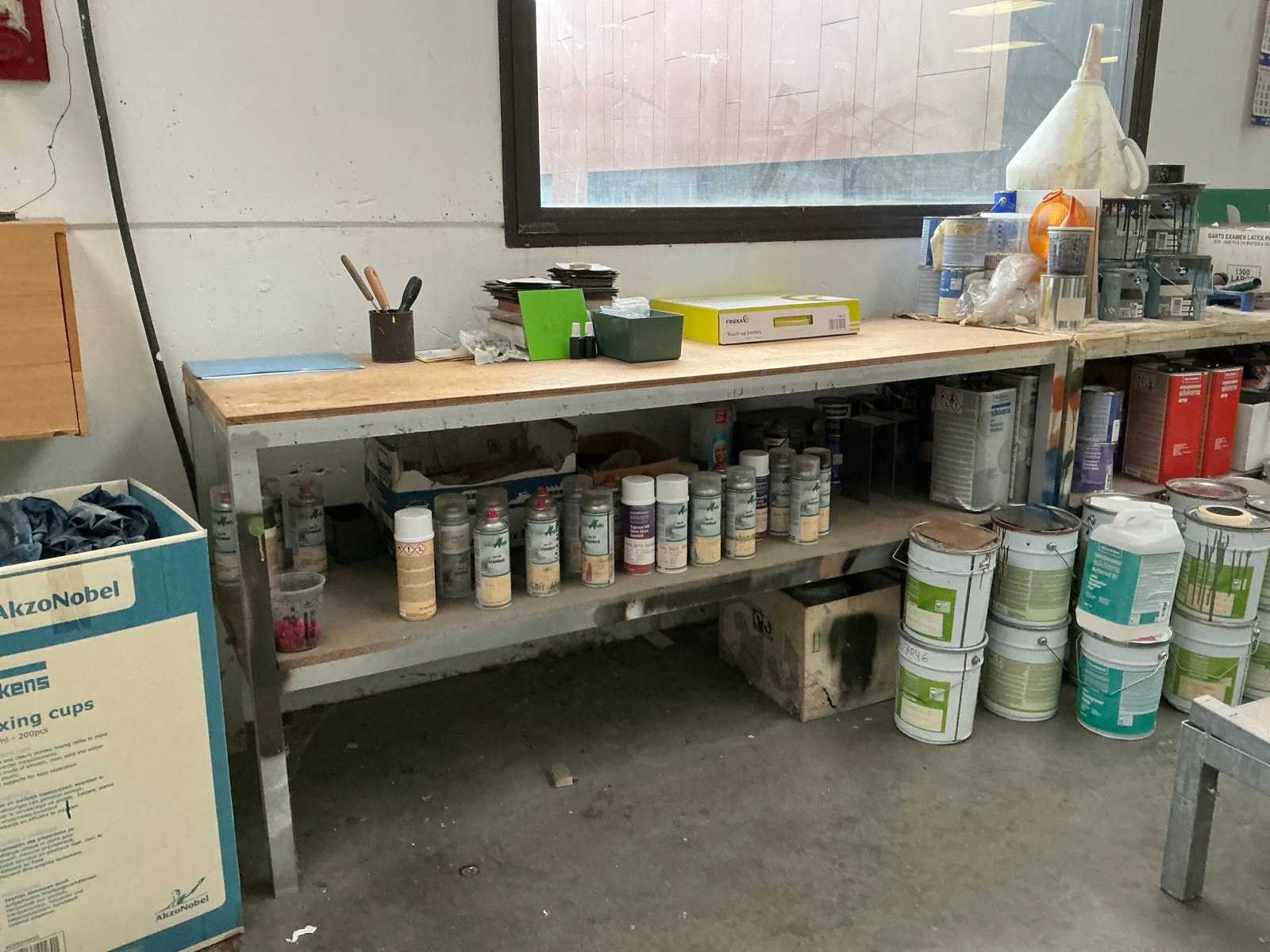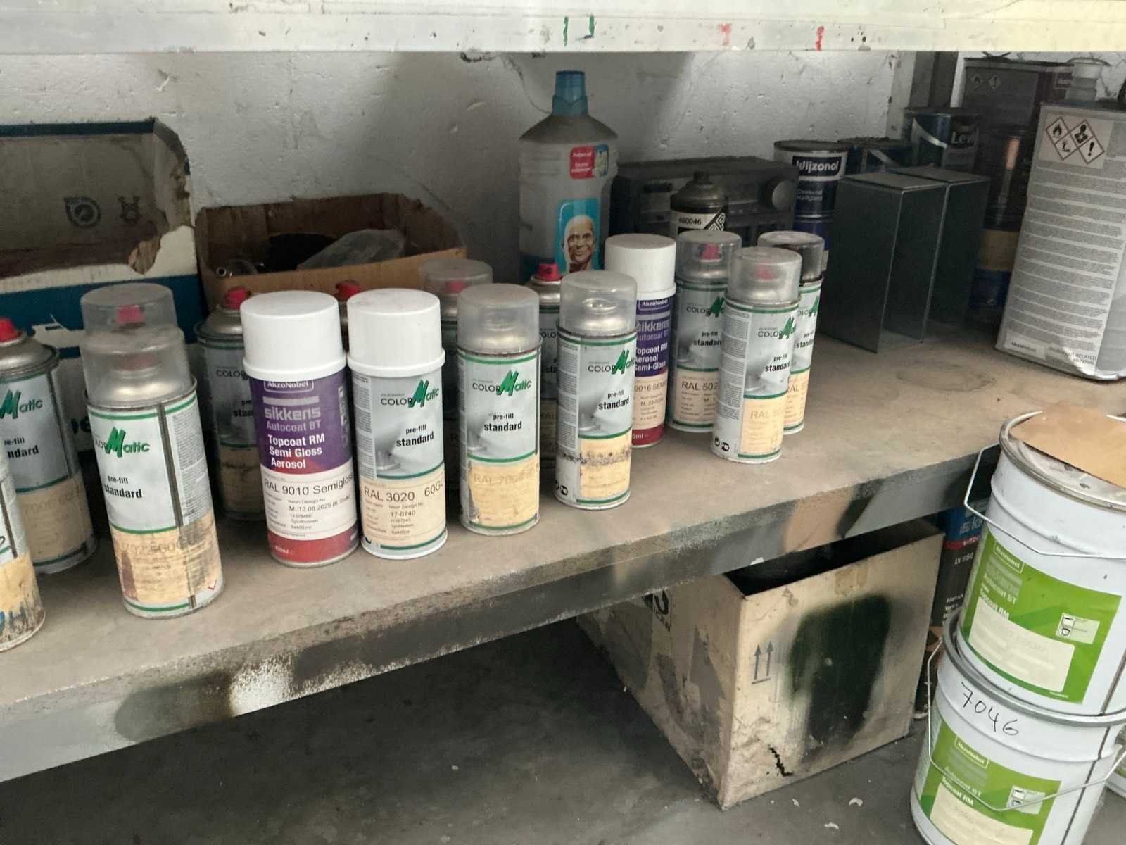 Waaronder 1 van circa. 230 x 60 x 86 cm en 1 van circa. 186 x 60 x 86 cm, compleet met inhoud inhoudende grote partij diverse waaronder aangesproken verfpotten en spuitbussen waaronder van SIKKENS, SIGMA, COLORMATIC, enzovoort, enige verftoebehoren Nee