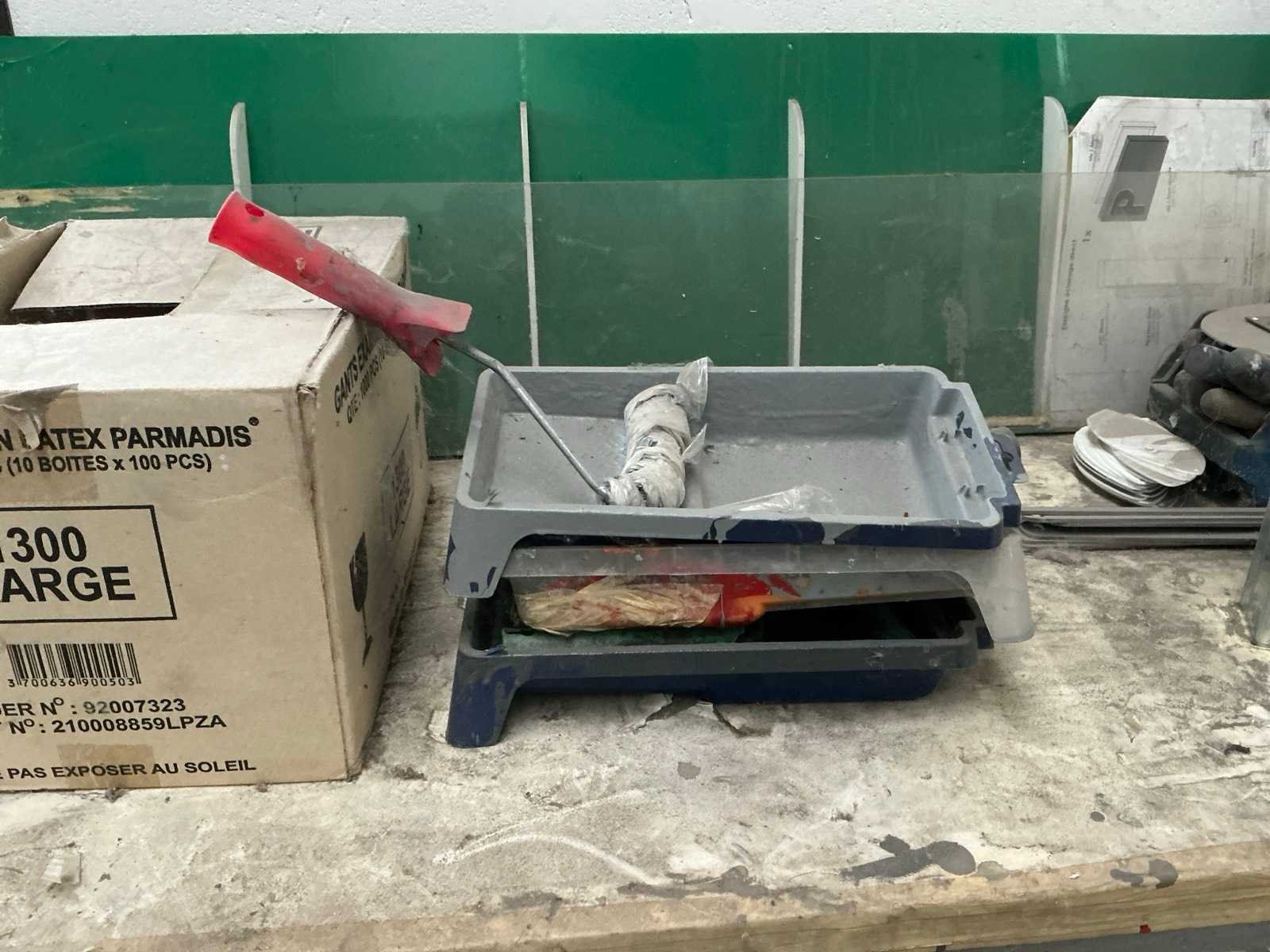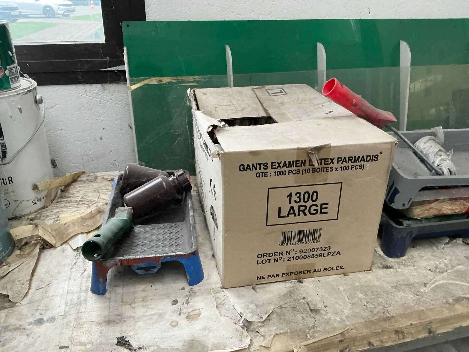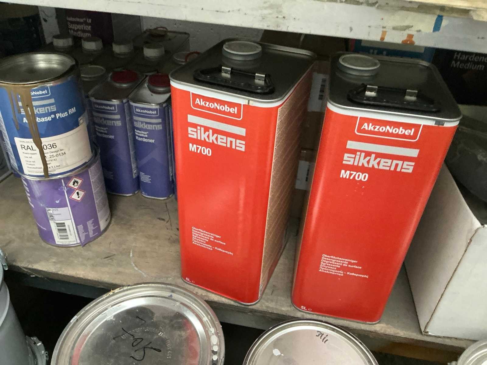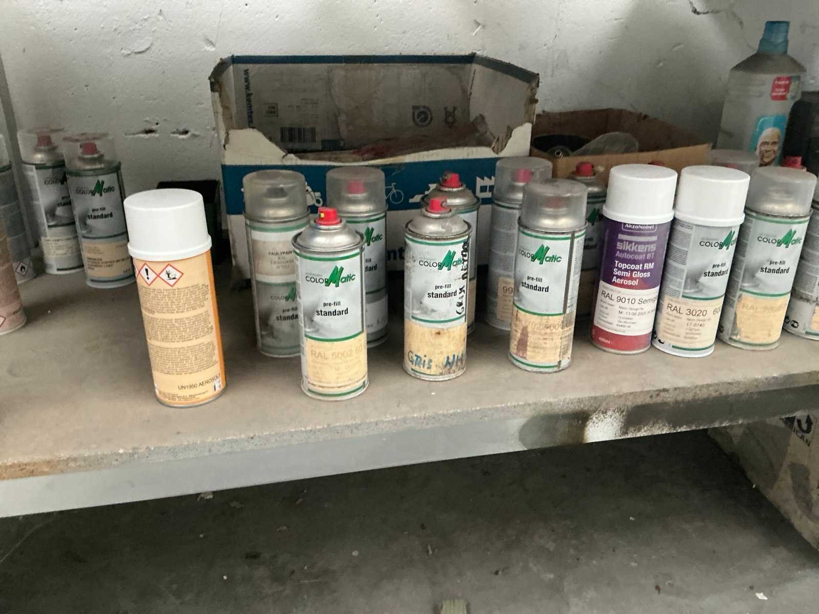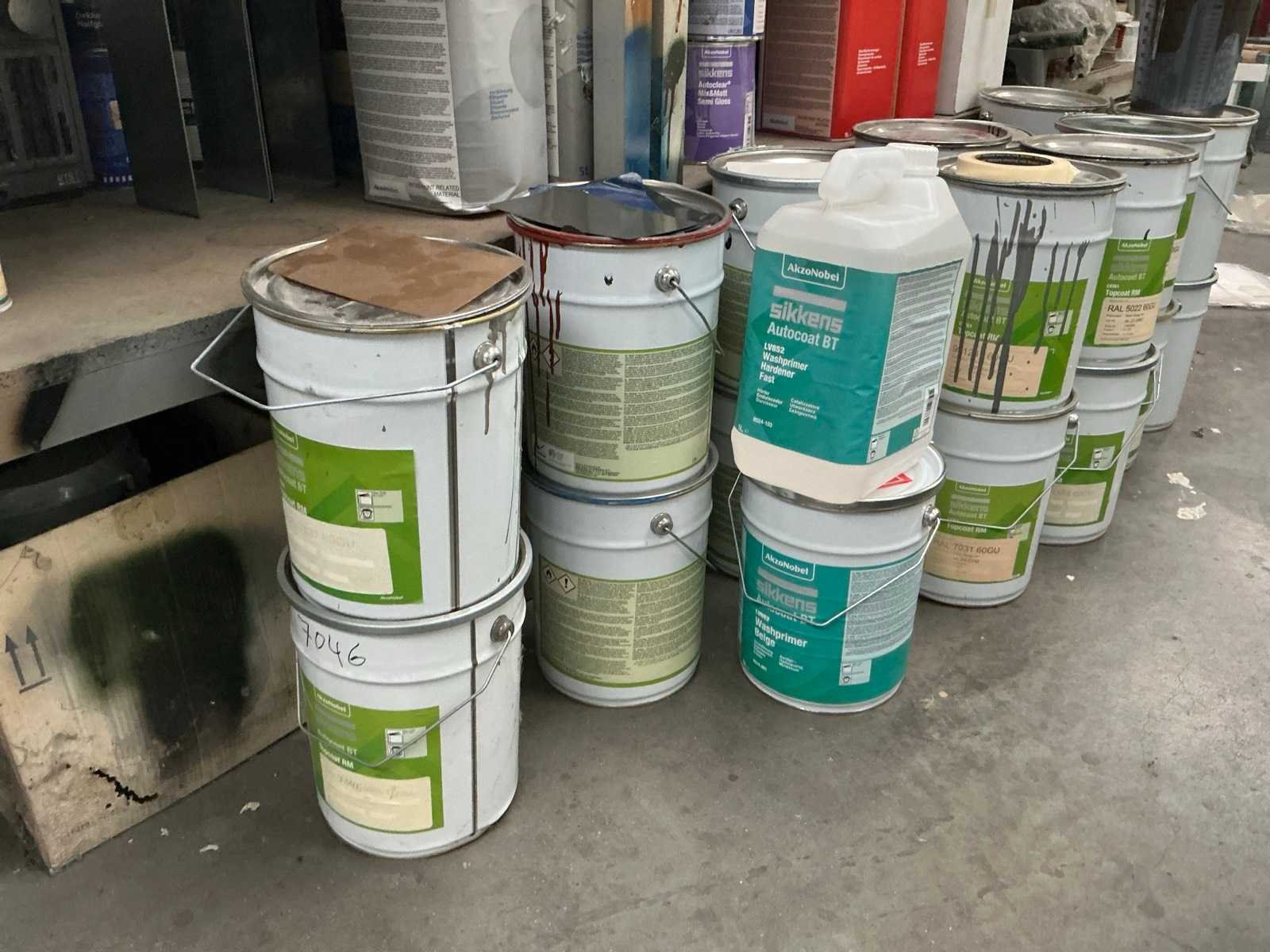 Waaronder 1 van circa. 230 x 60 x 86 cm en 1 van circa. 186 x 60 x 86 cm, compleet met inhoud inhoudende grote partij diverse waaronder aangesproken verfpotten en spuitbussen waaronder van SIKKENS, SIGMA, COLORMATIC, enzovoort, enige verftoebehoren Nee