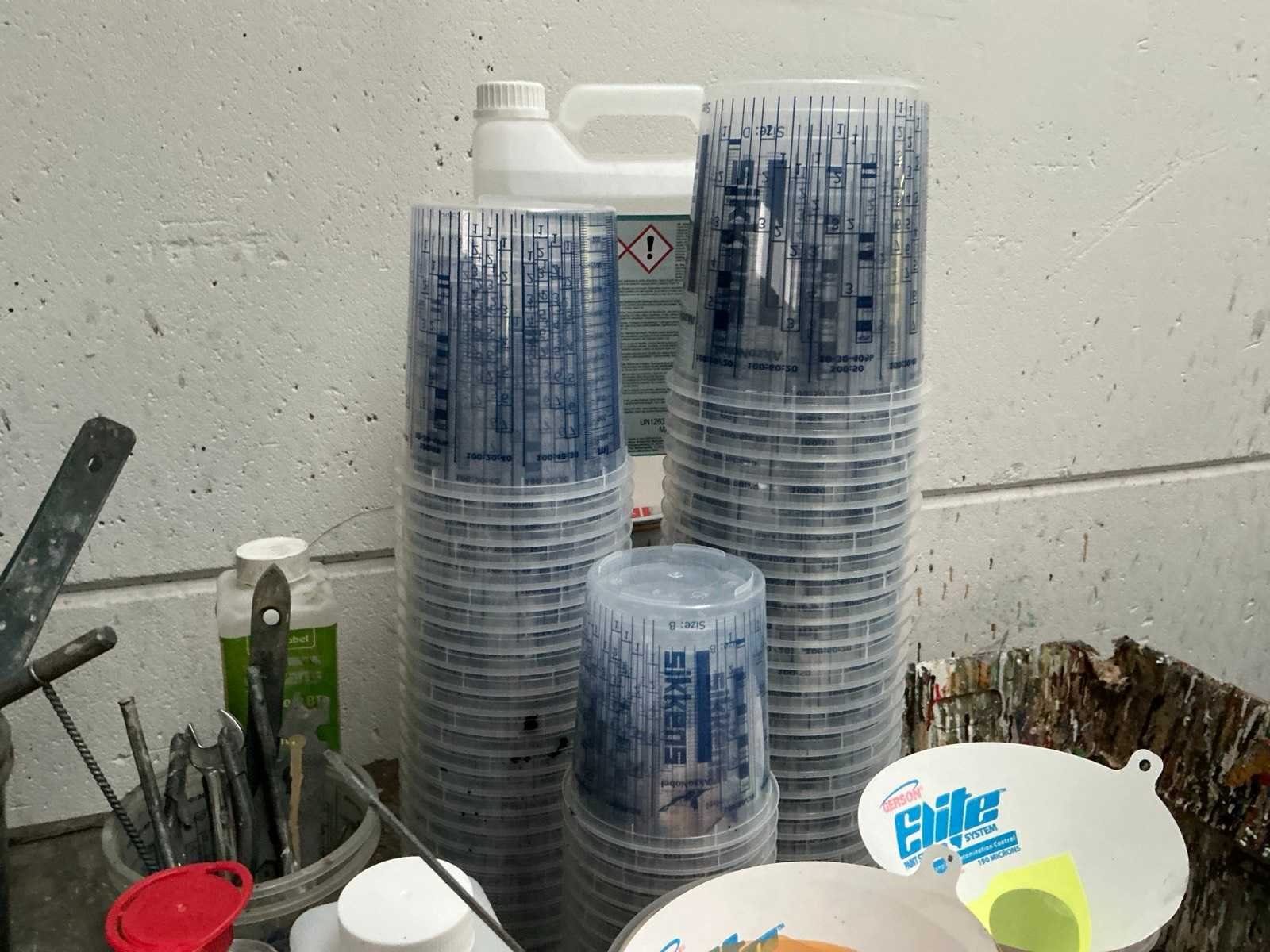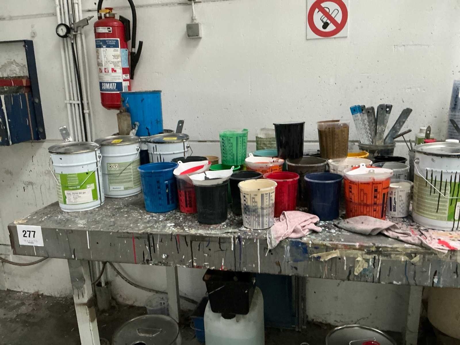 Compleet met inhoud waaronder aangesproken verfpotten waaronder AKZONOBEL, diverse pvc mengemmers SIKKENS, spatels en manuele pottenpres (dient door de koper gedemonteerd te worden van de omgeving Nee Lengte: 192cm Breedte: 93cm Hoogte: 100cm