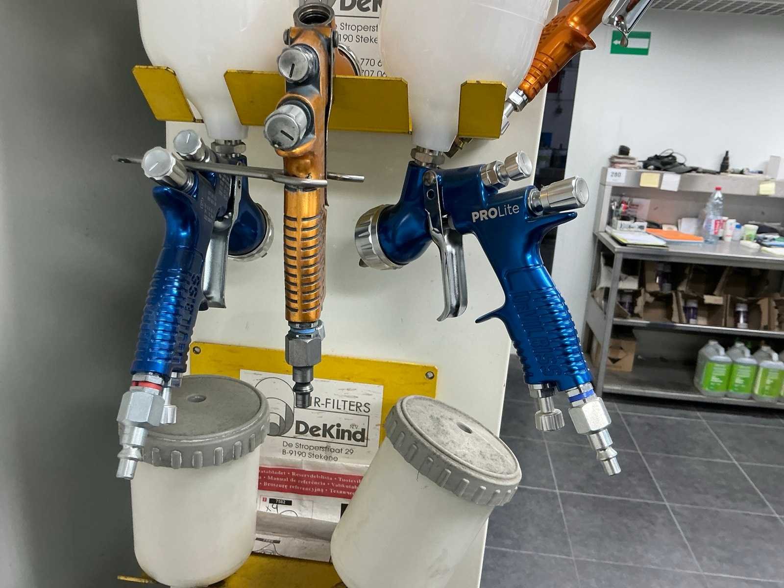 Compleet met 45 diverse potten Sikkens Topcoat, diverse types waaronder aangesproken en vol en 5 diverse verfspuitpistolen waaronder 4x Prolite en 2x Sata Nee Merk: Sikkens AkzoNobel Totale afmeting L: 1150mm Totale afmeting Breedte: 250mm Totale afmeting Hoogte: 1930mm