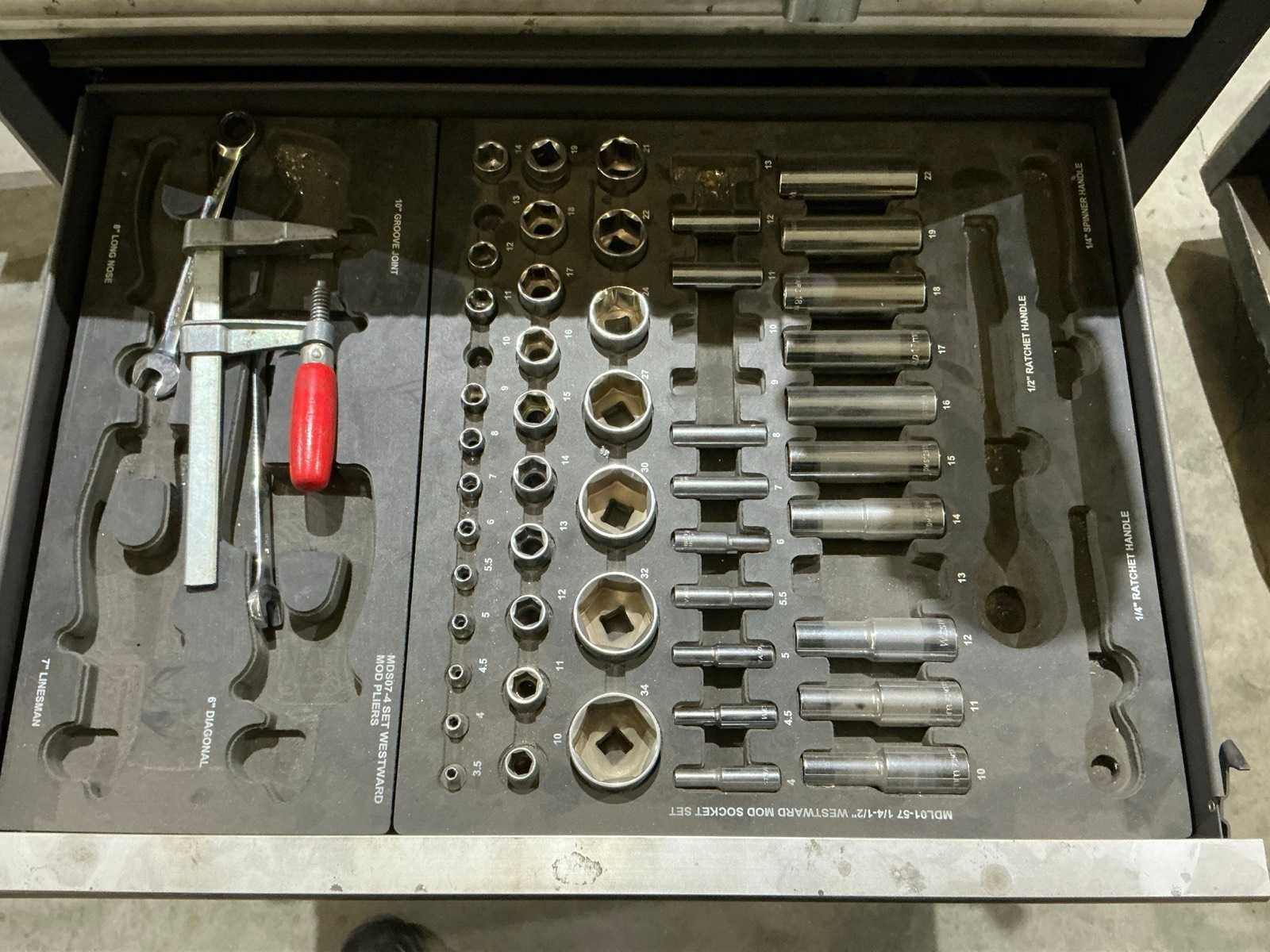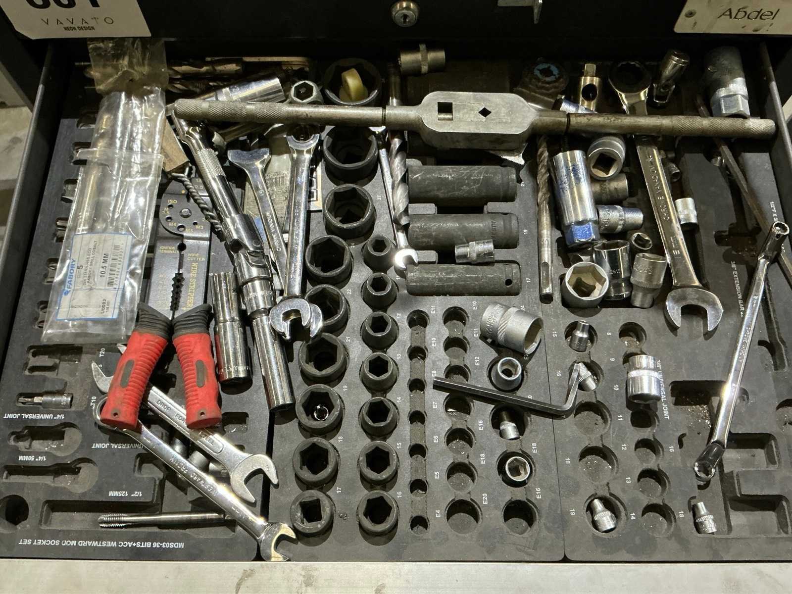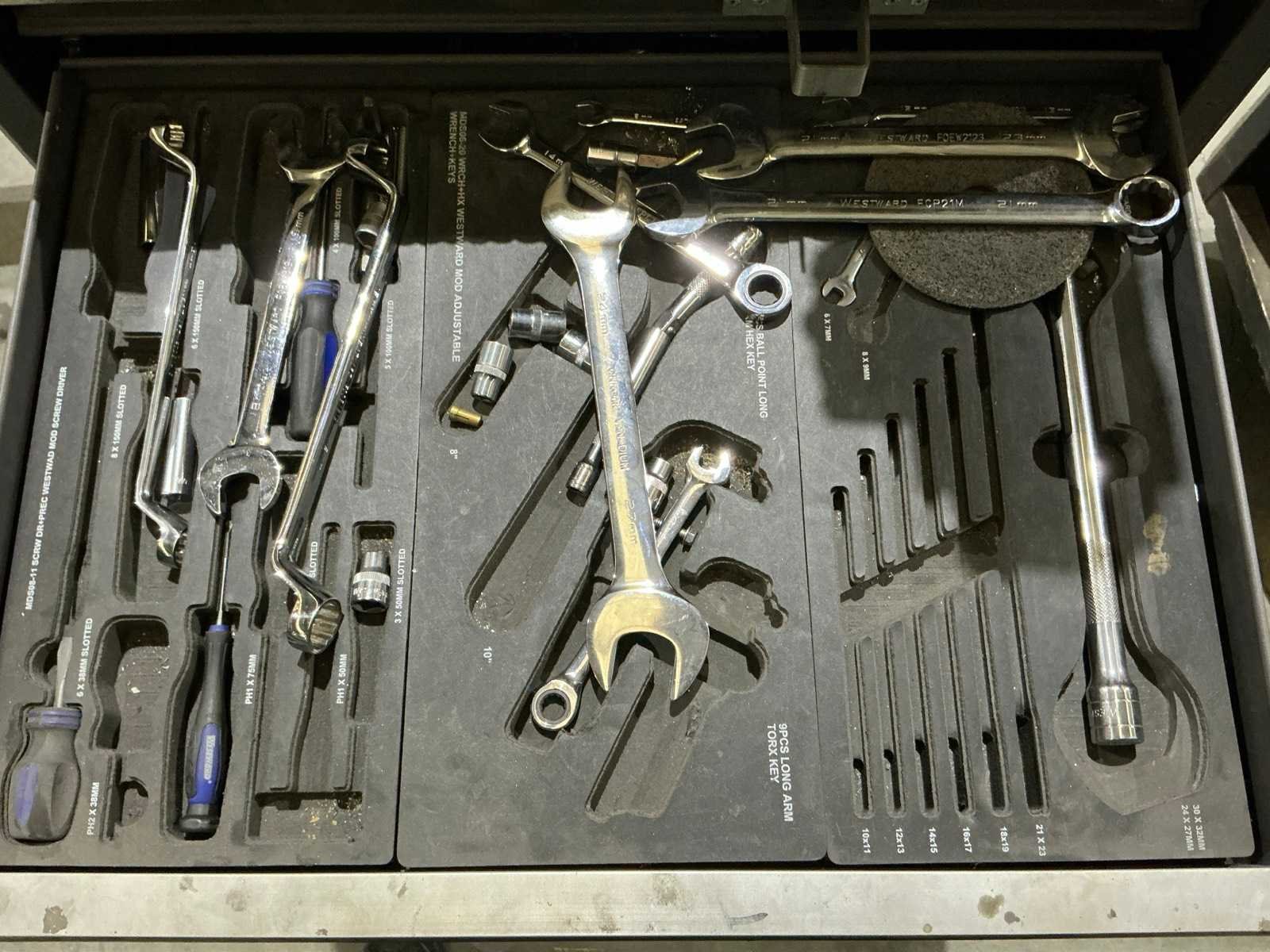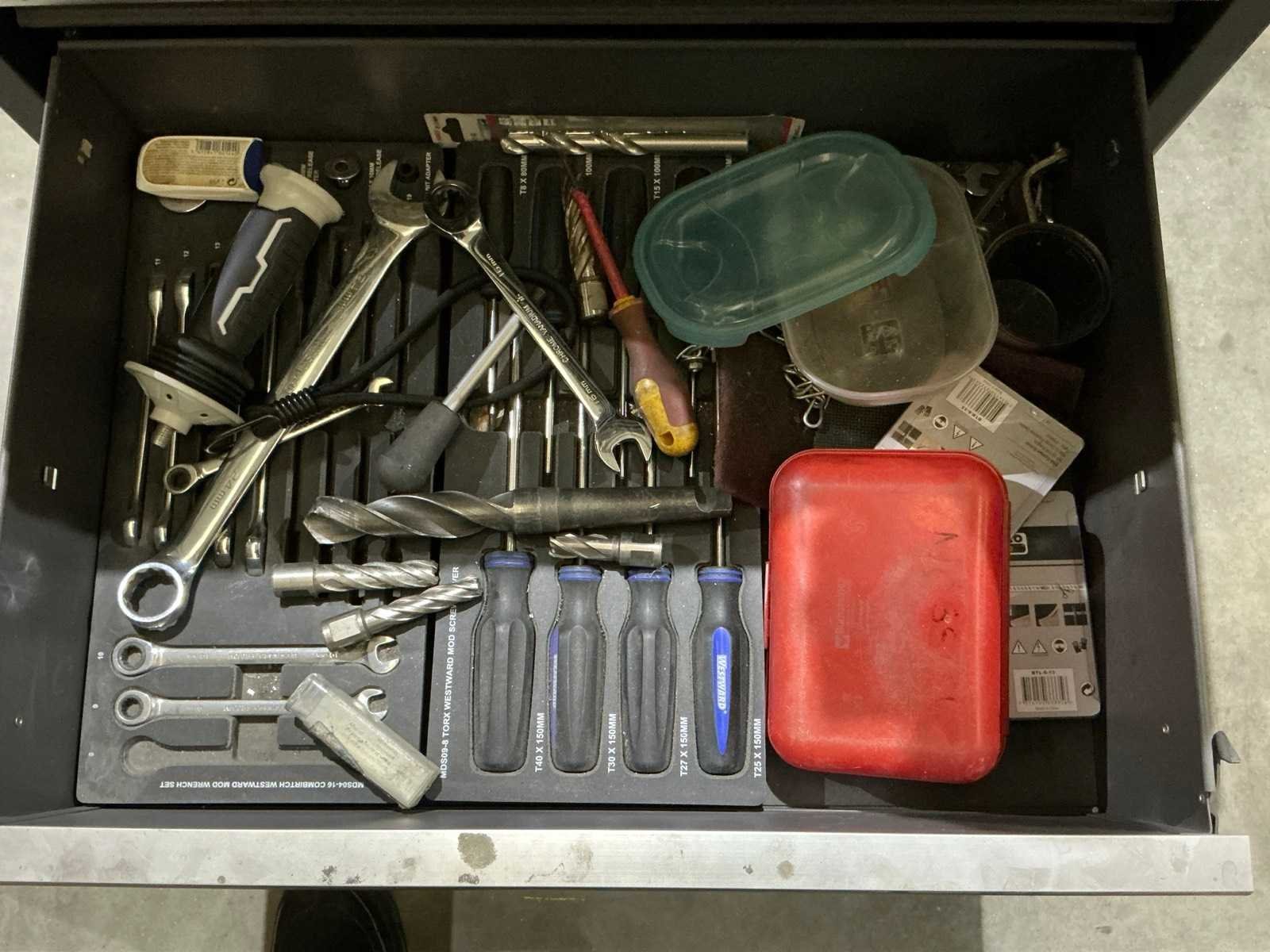 Inhoudende partij divers handgereedschap waaronder: Dopsleutelsets, ring-/steeksleutels, schroevendraaiers, tangen en enige boren Nee Merk: Westward Model: 7-laden Lengte: 72cm Breedte: 46cm Hoogte: 100cm Materiaal: Metaal