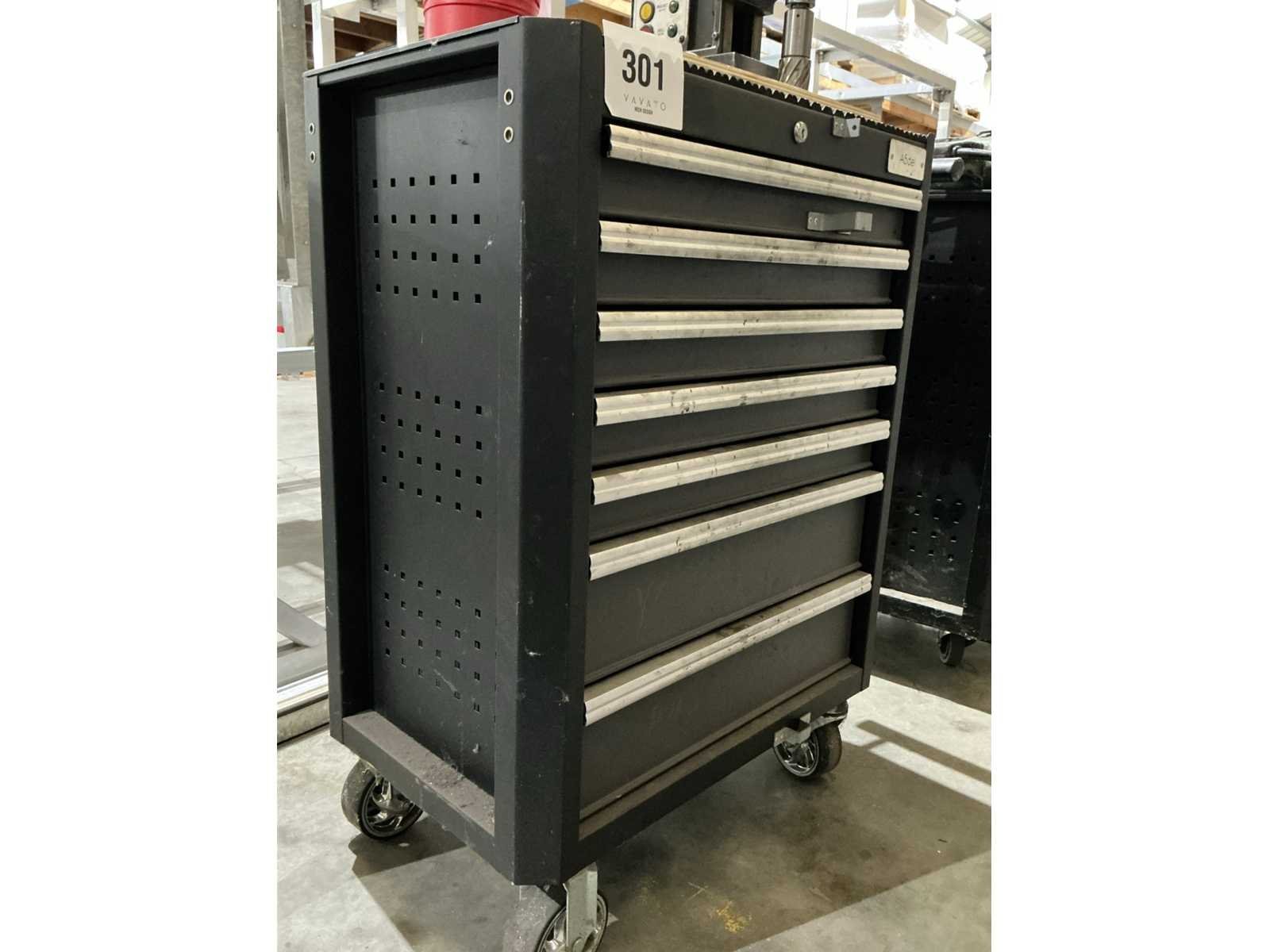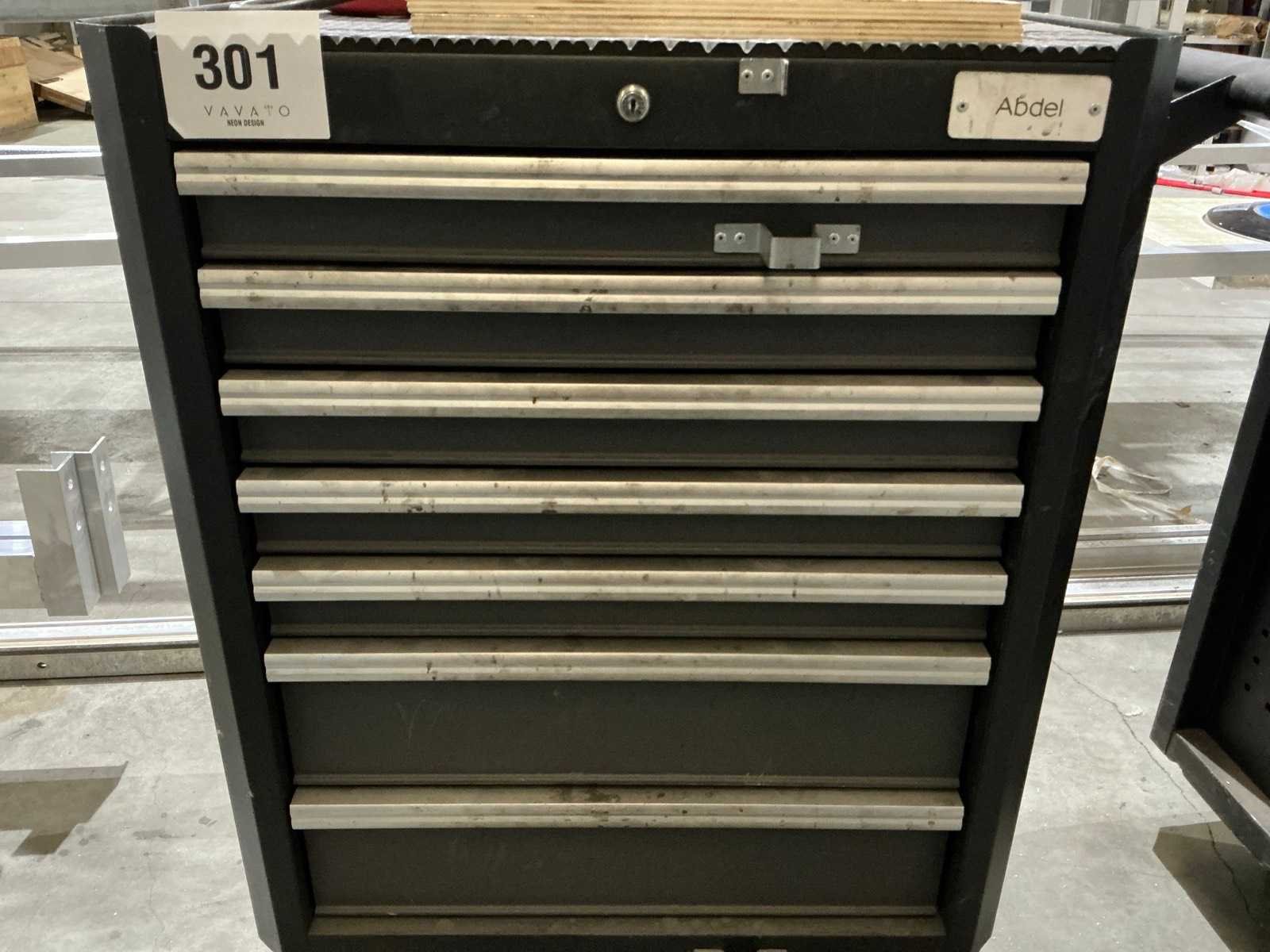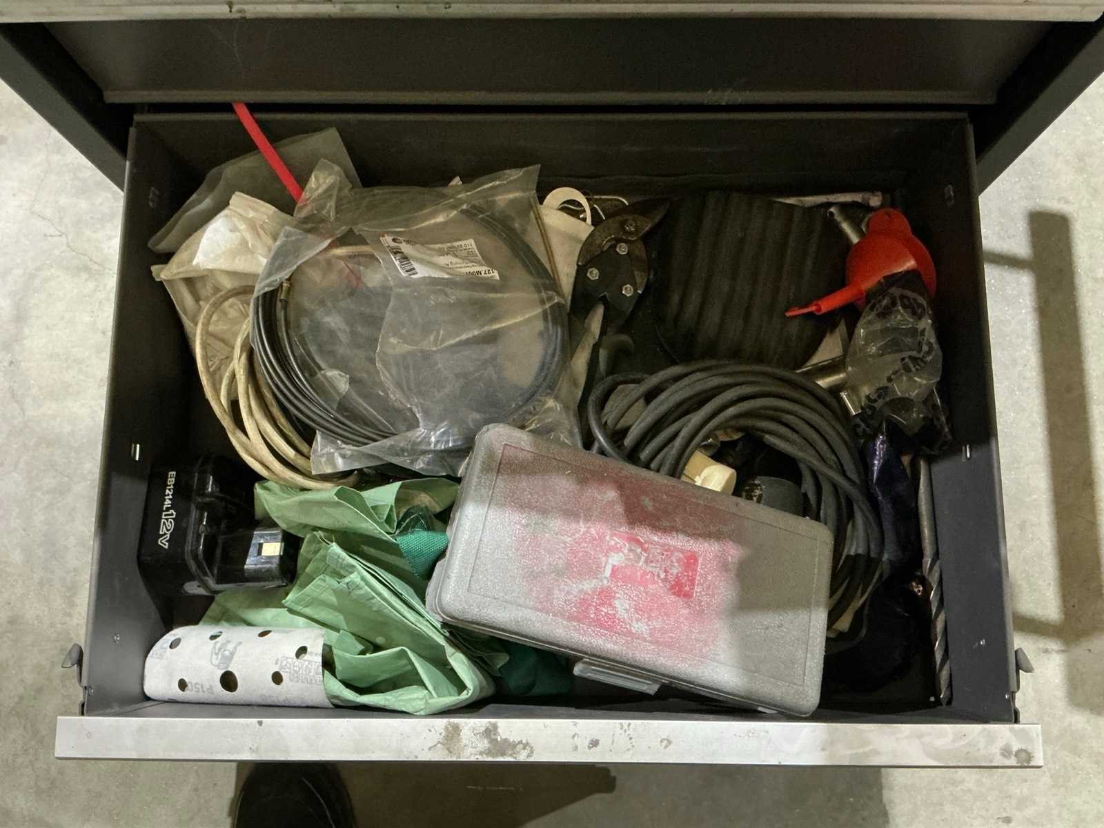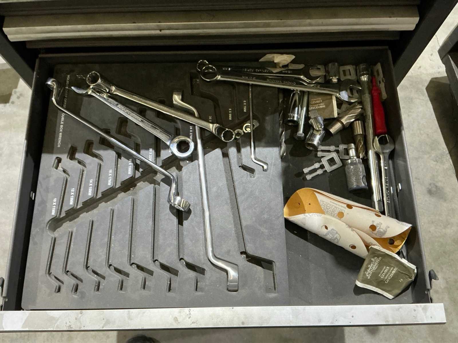 Inhoudende partij divers handgereedschap waaronder: Dopsleutelsets, ring-/steeksleutels, schroevendraaiers, tangen en enige boren Nee Merk: Westward Model: 7-laden Lengte: 72cm Breedte: 46cm Hoogte: 100cm Materiaal: Metaal