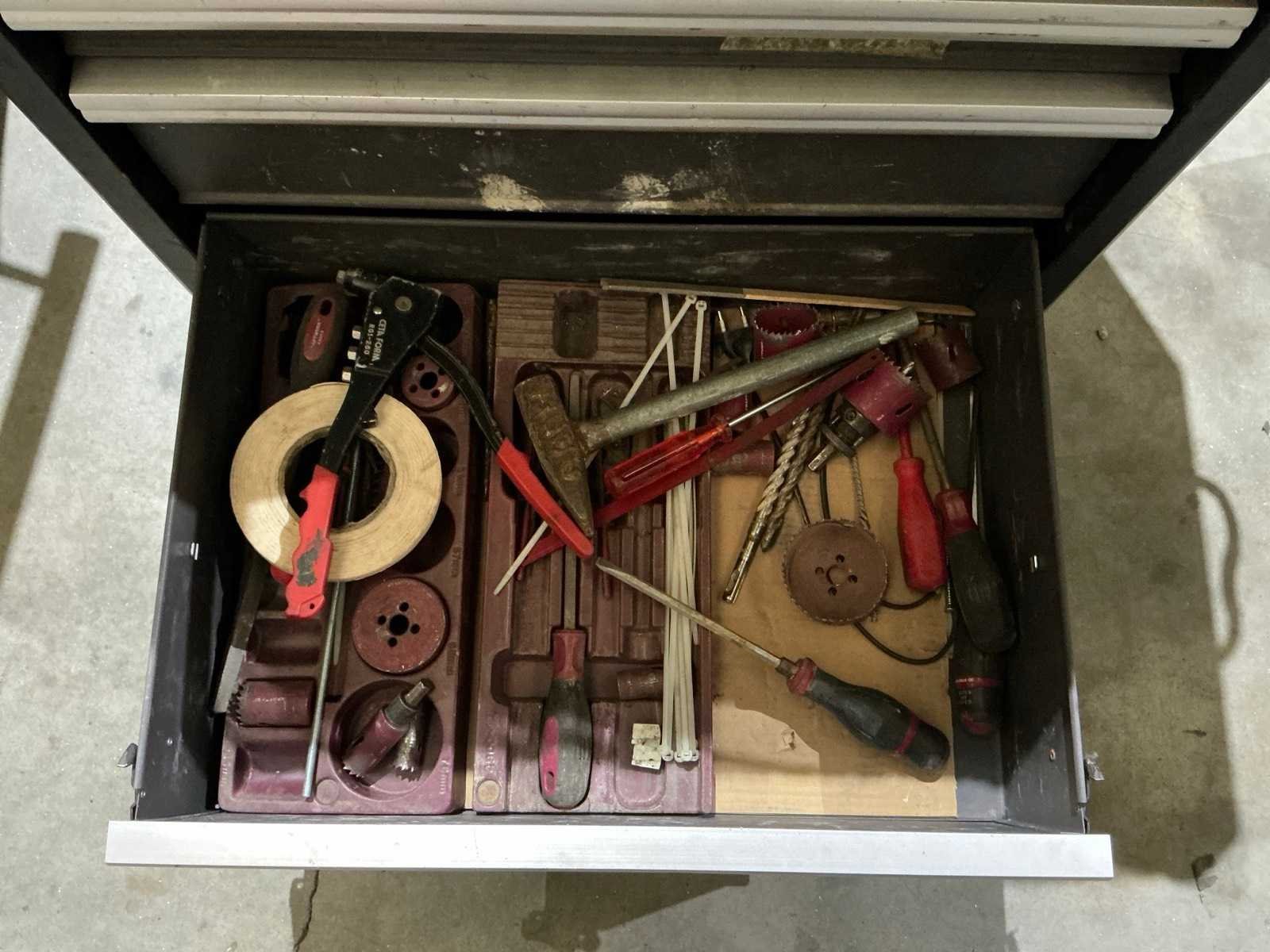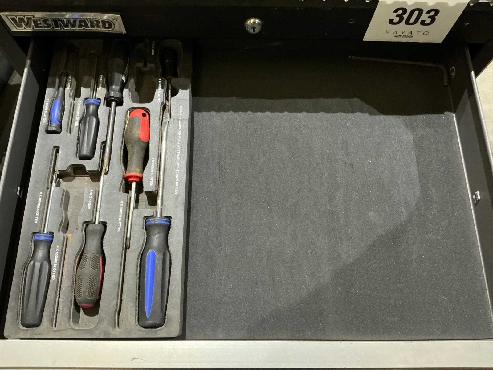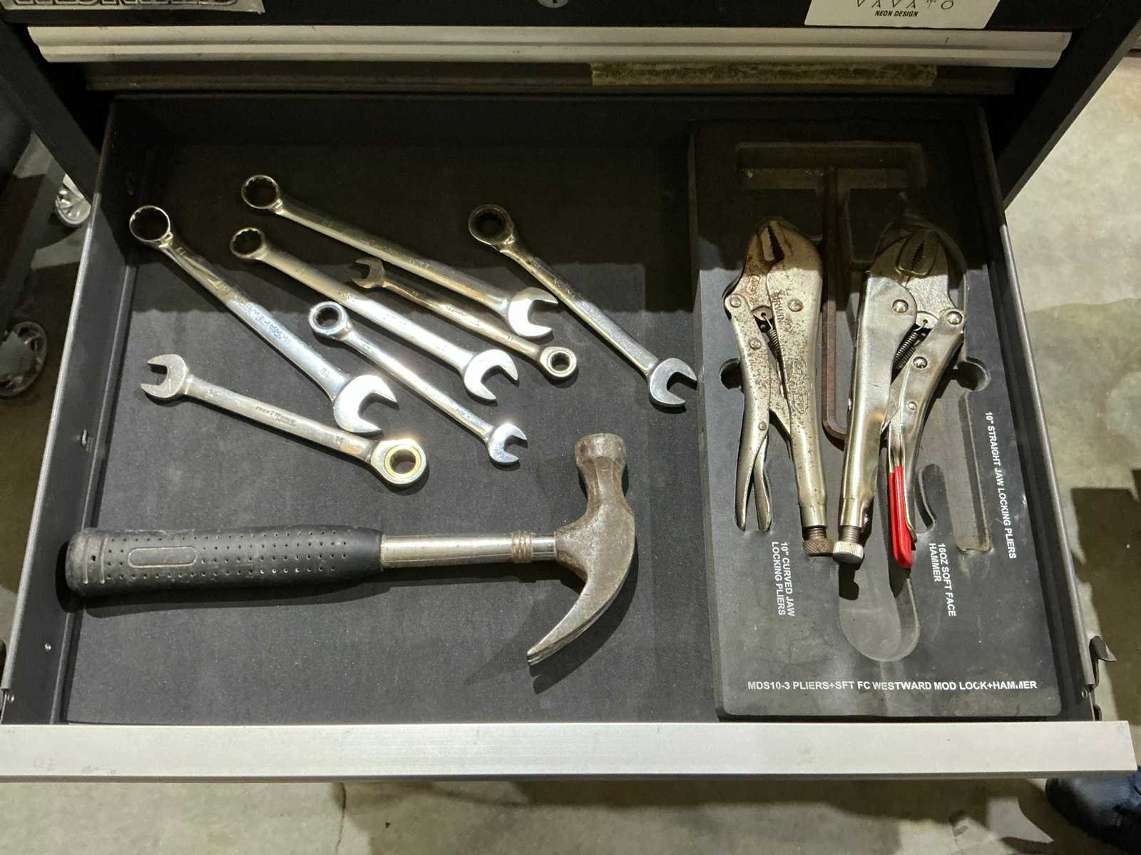 Inhoudende partij divers handgereedschap waaronder: Enige steek-/ringsleutels, schroevendraaiers en tangen Nee Merk: Westward Model: 7-laden Lengte: 72cm Breedte: 46cm Hoogte: 100cm Materiaal: Metaal