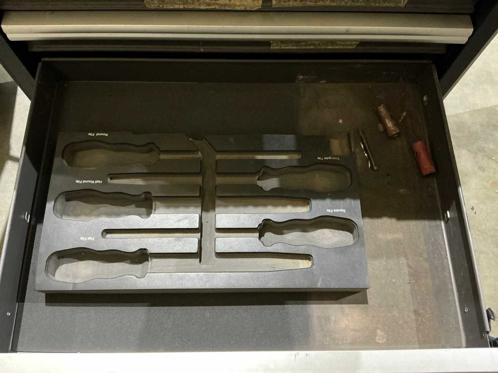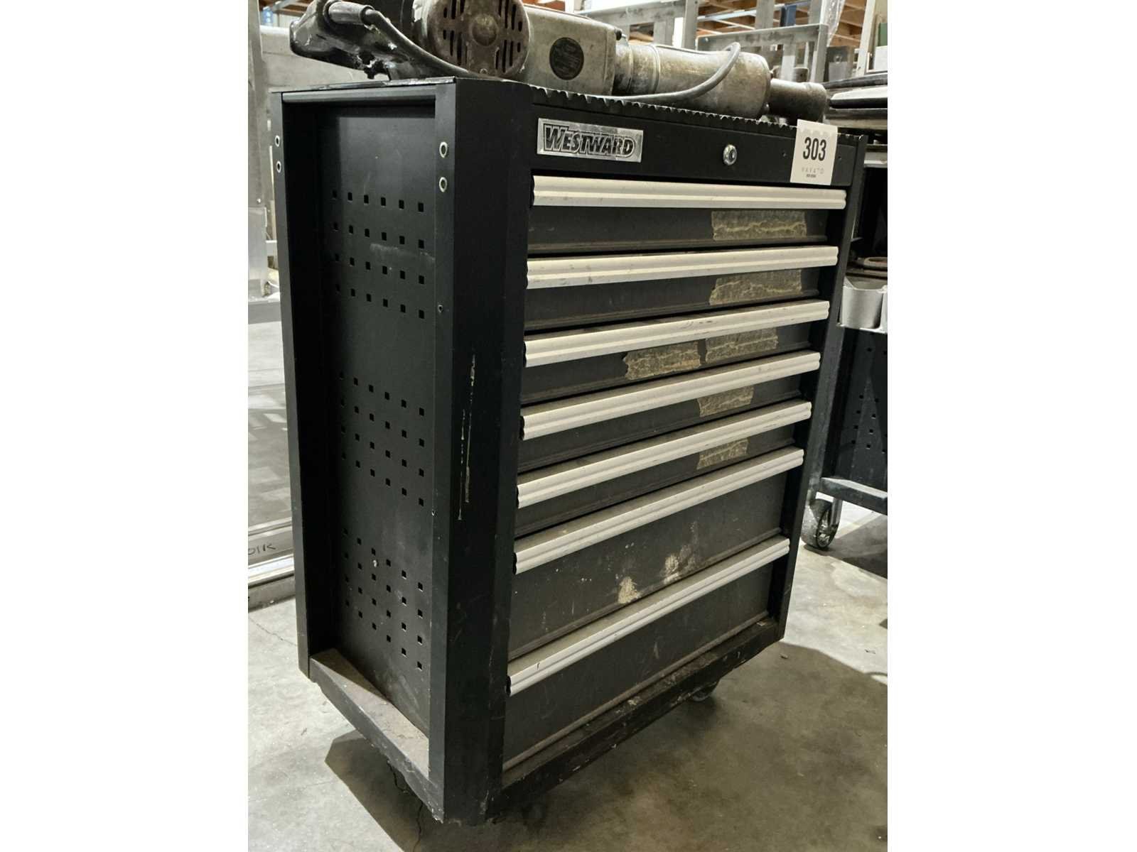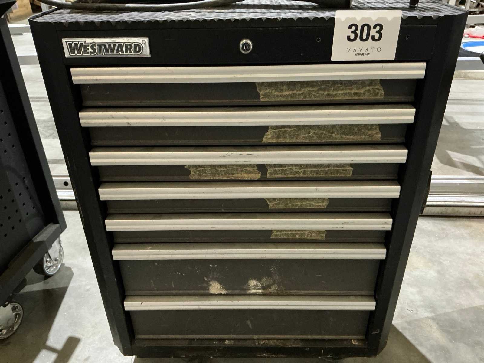 Inhoudende partij divers handgereedschap waaronder: Enige steek-/ringsleutels, schroevendraaiers en tangen Nee Merk: Westward Model: 7-laden Lengte: 72cm Breedte: 46cm Hoogte: 100cm Materiaal: Metaal