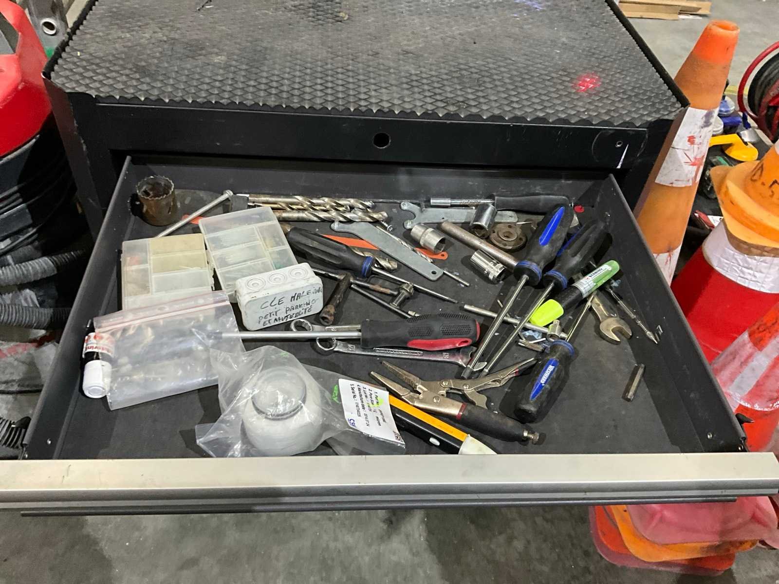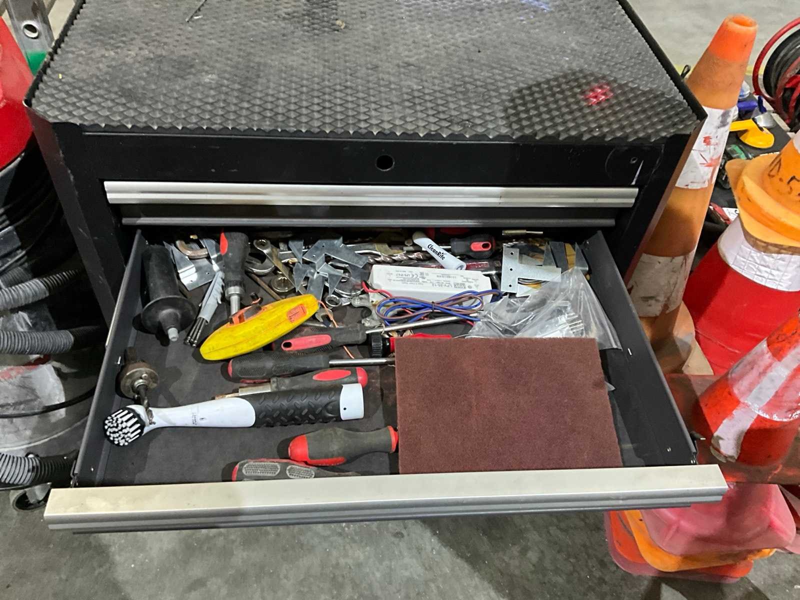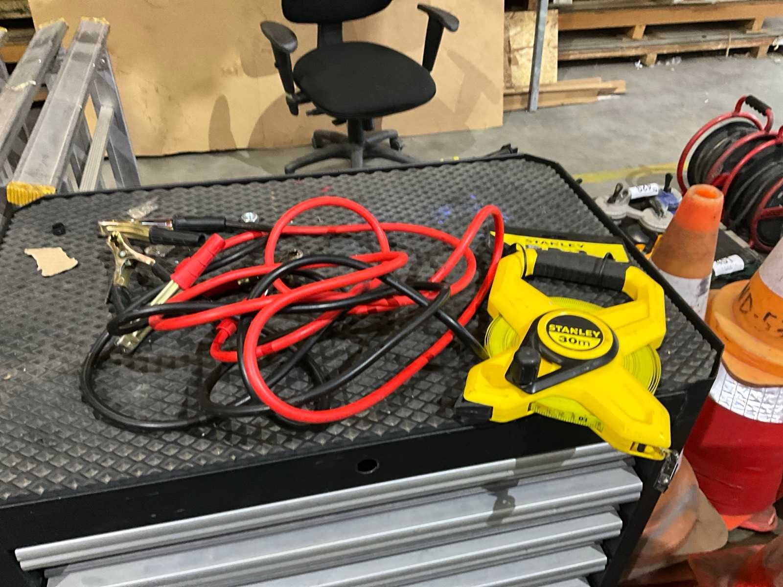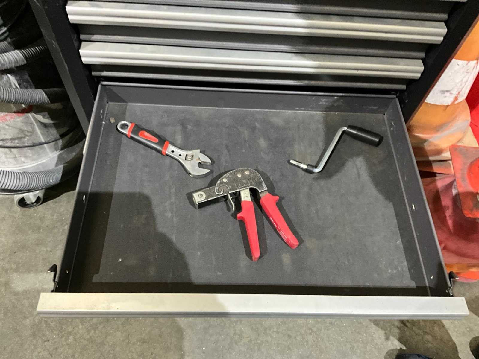 Inhoudende divers handgereedschap waaronder schroevendraaiers, tangen, rolmeter van 30 m, 2 glasdragers en startkabels Nee Merk: Westward Model: 7-laden Lengte: 72cm Breedte: 46cm Hoogte: 93cm Materiaal: Metaal