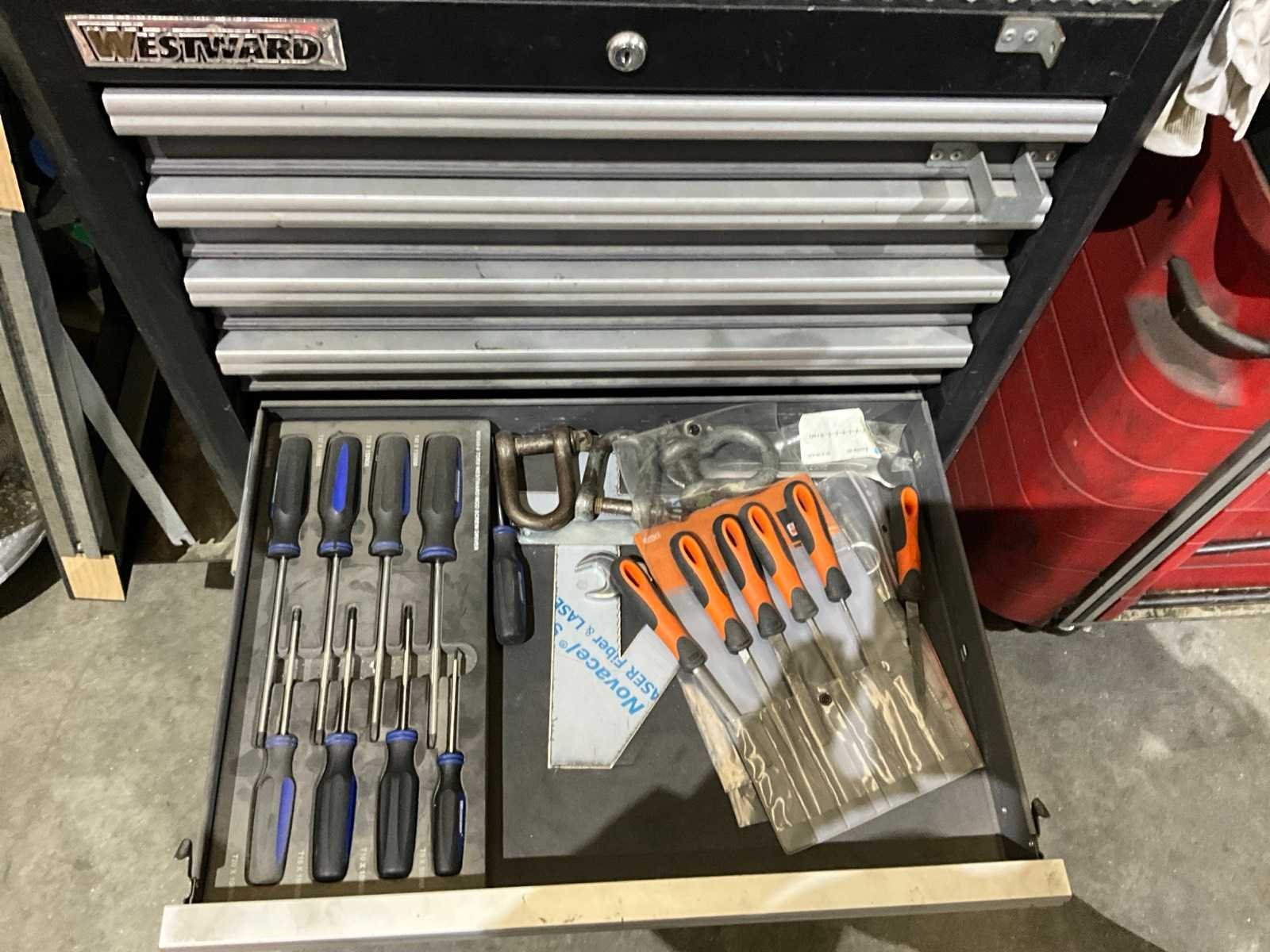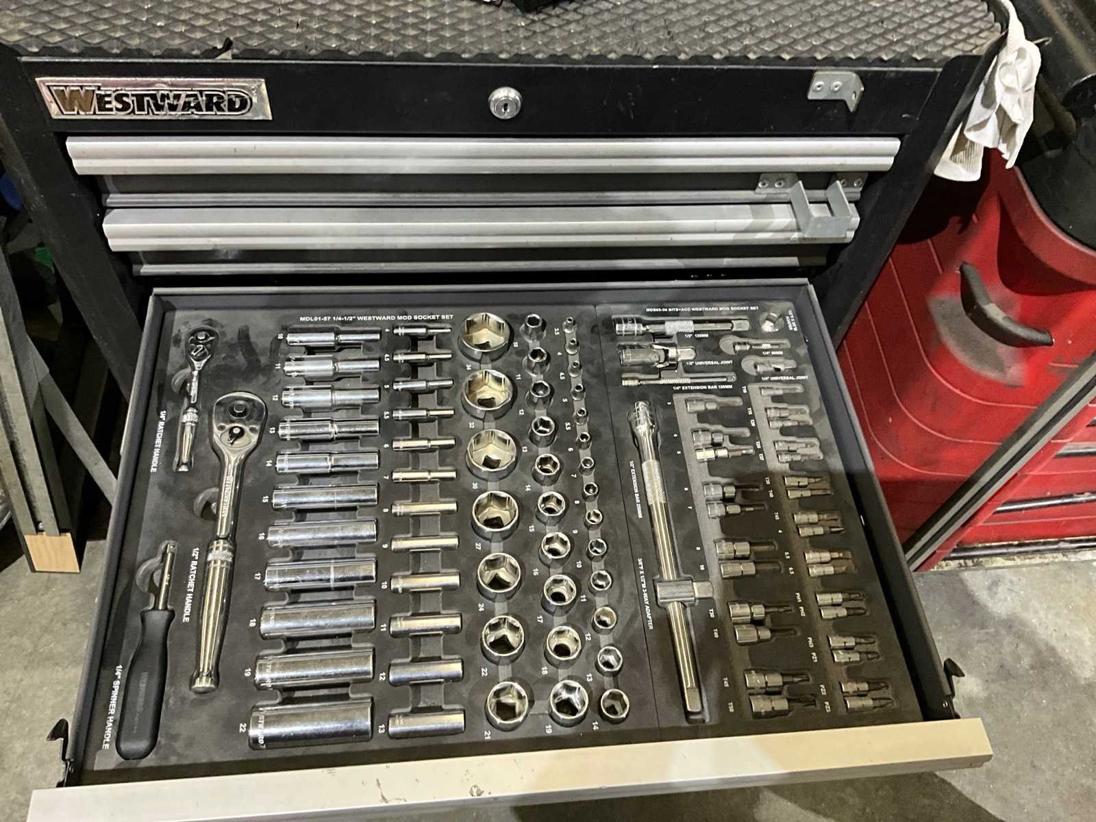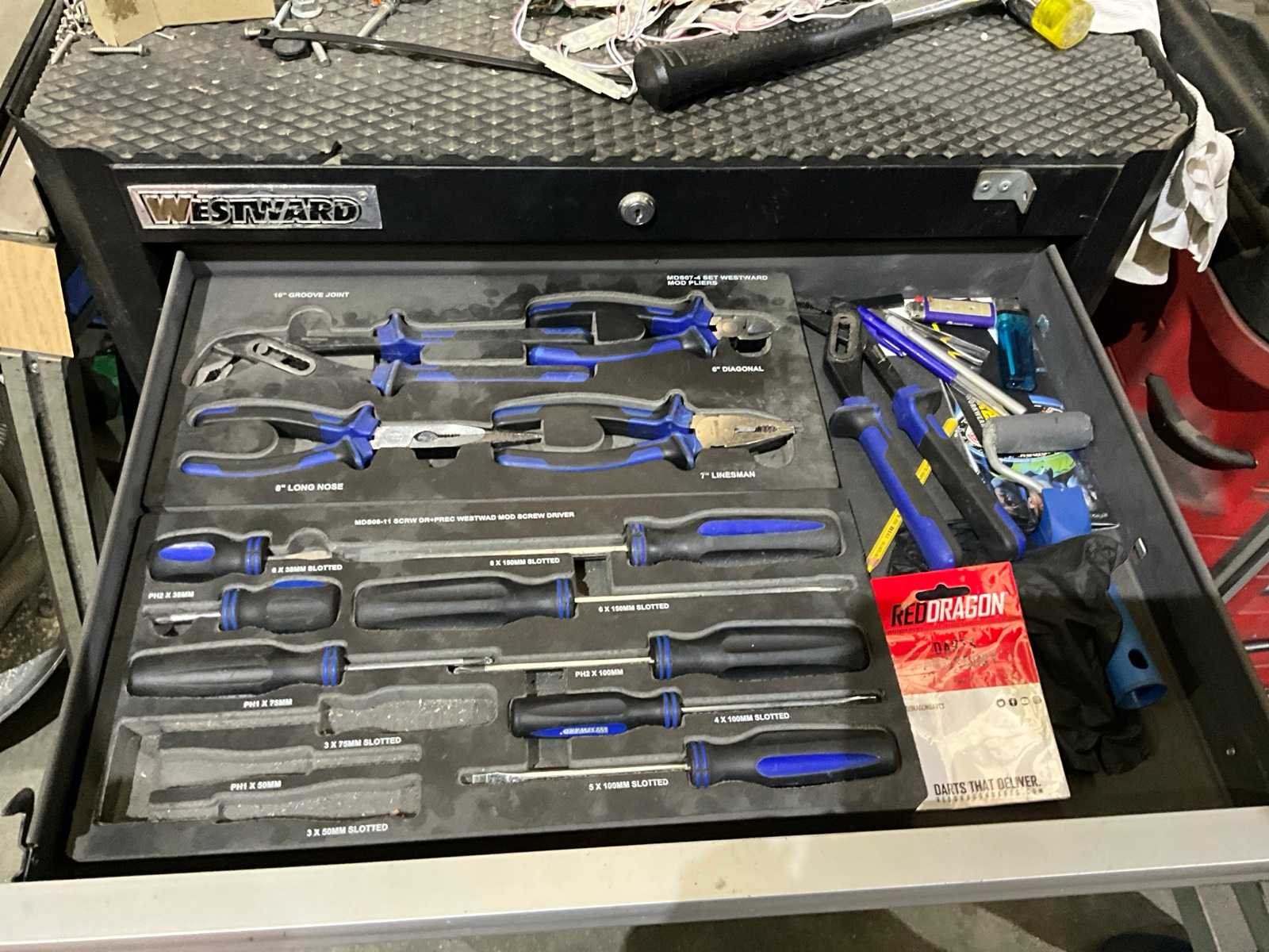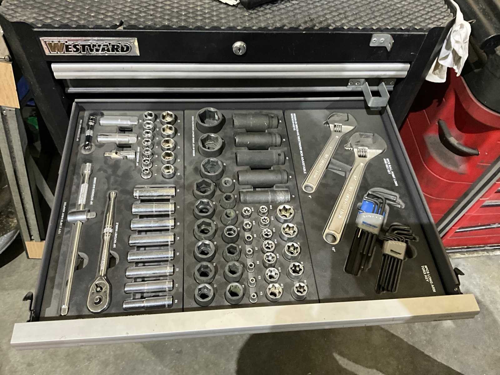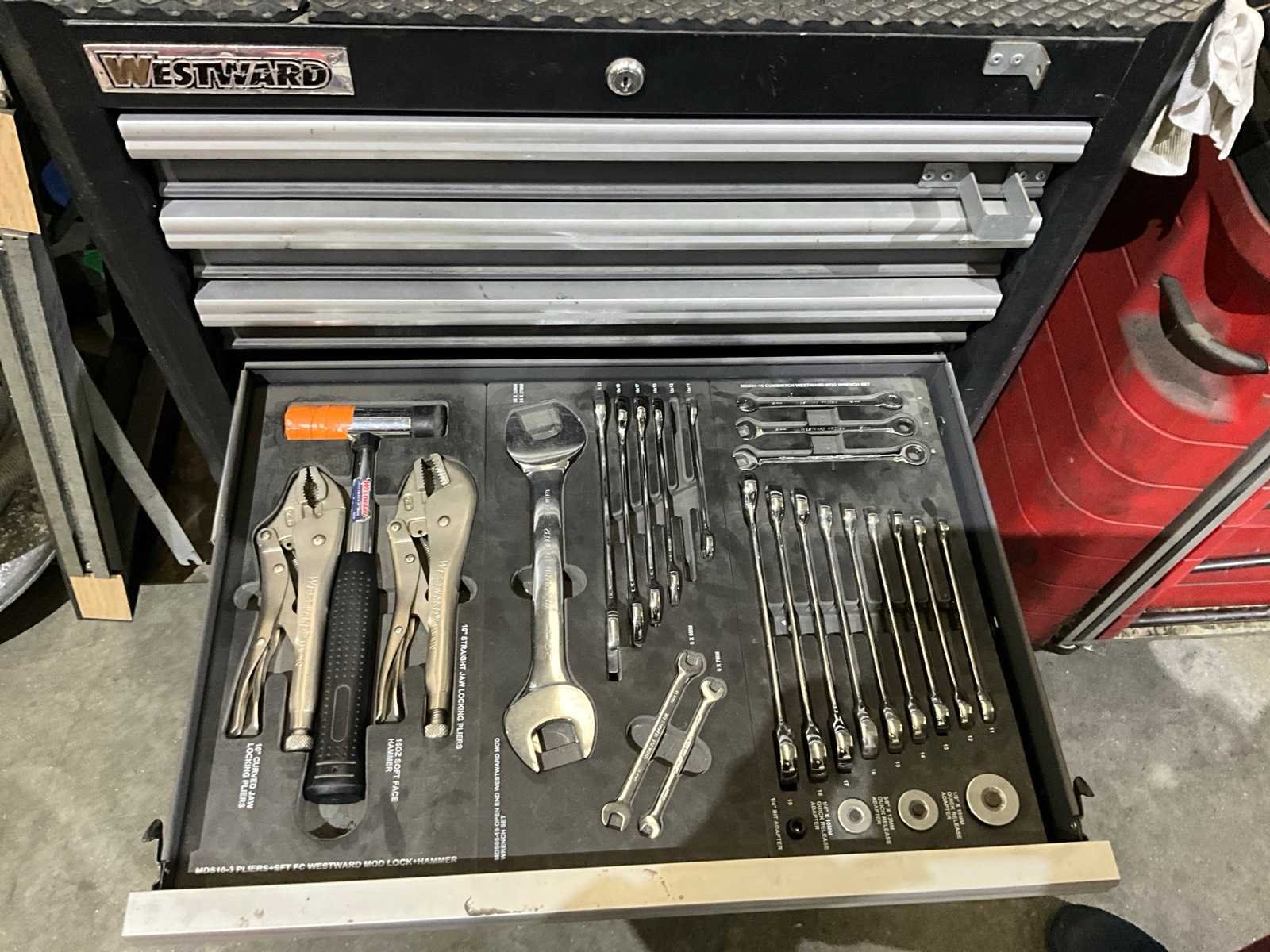 Inhoudende partij divers handgereedschap waaronder: Dopsleutelsets, ring-/steeksleutels, schroevendraaiers, tangen en enige boren Nee Merk: Westward Model: 7-laden Lengte: 72cm Breedte: 46cm Hoogte: 100cm Materiaal: Metaal