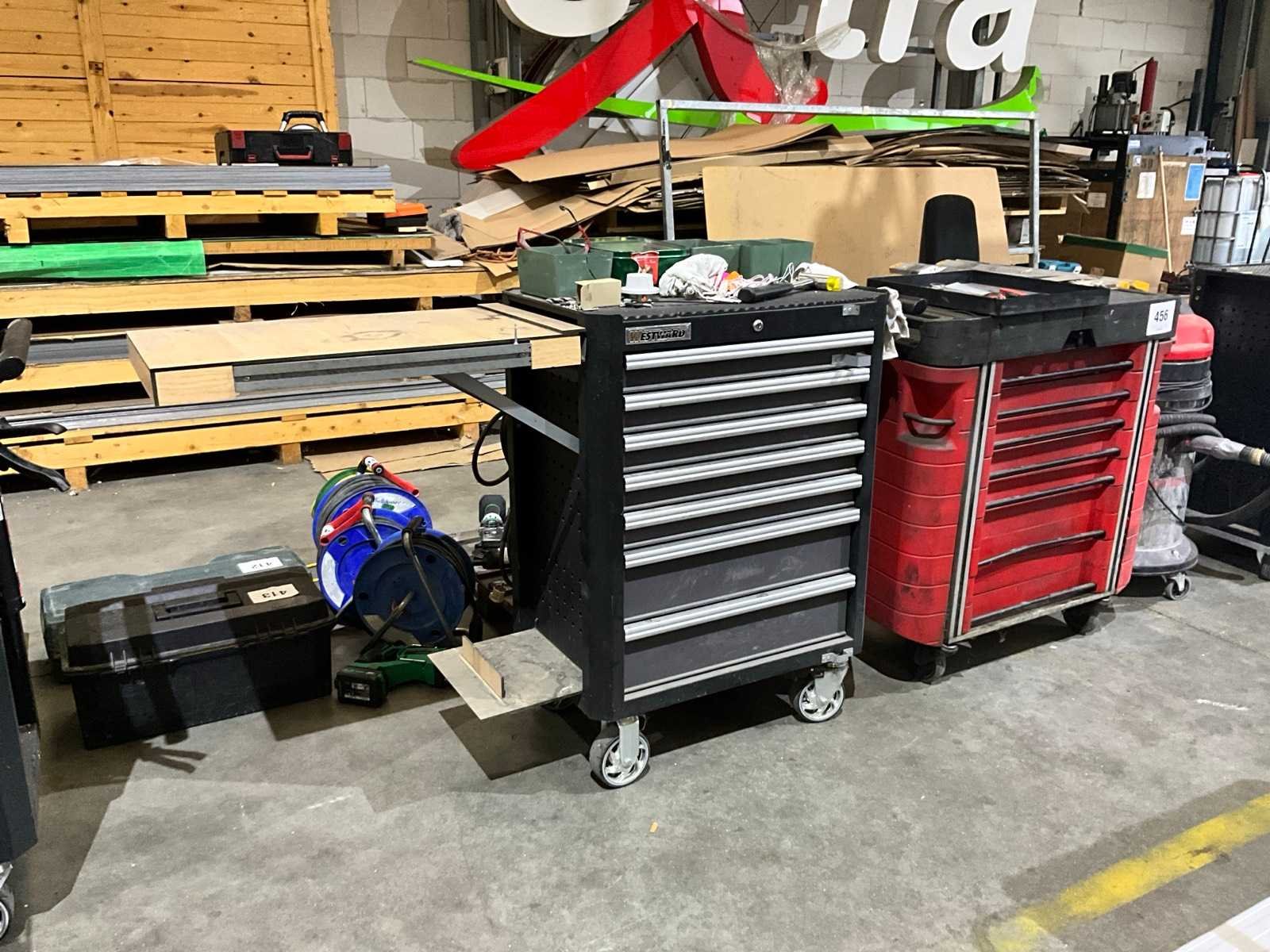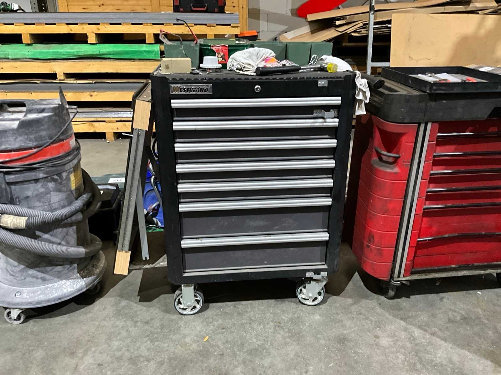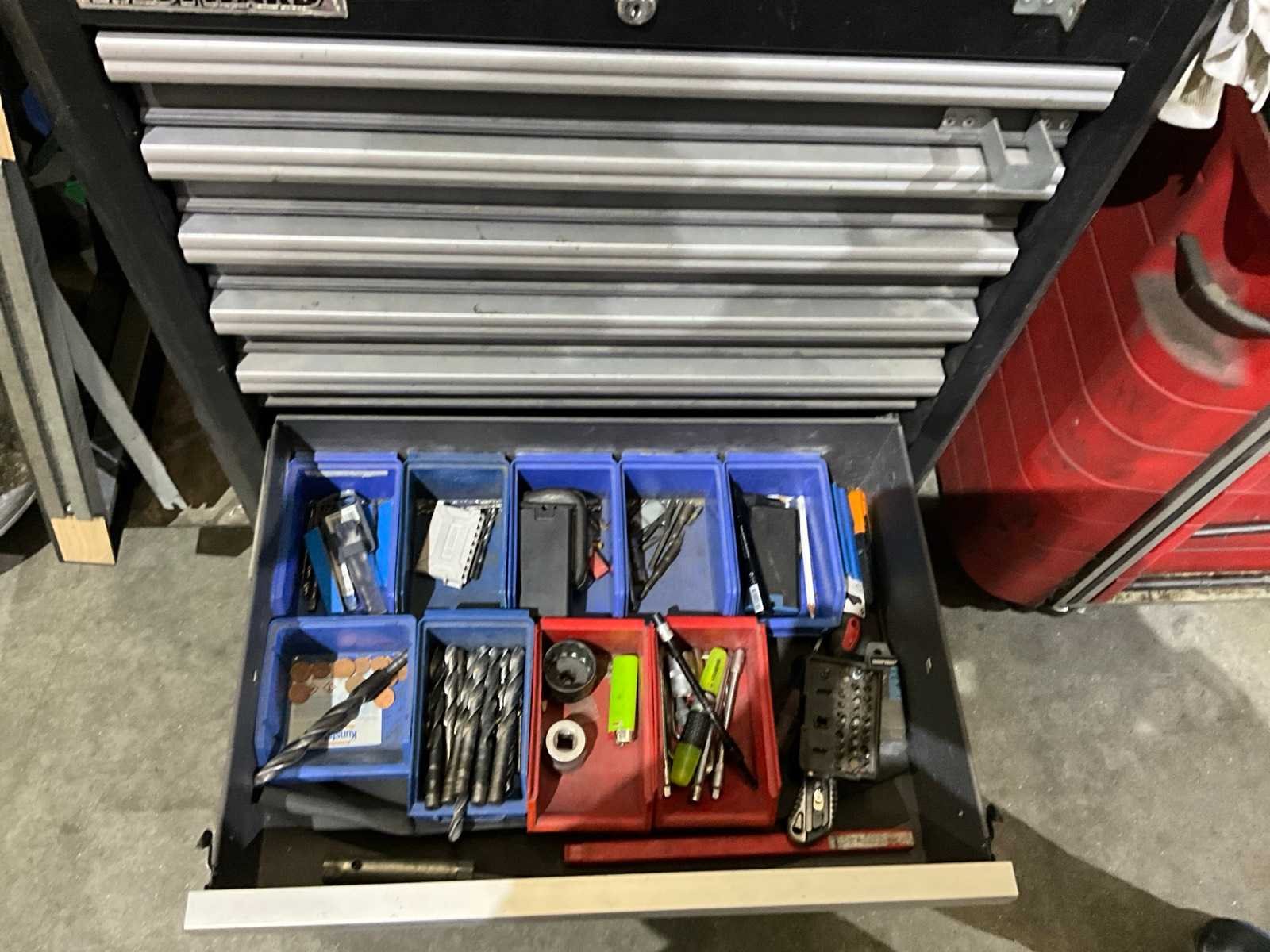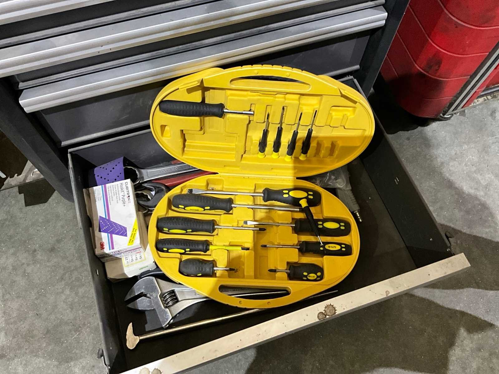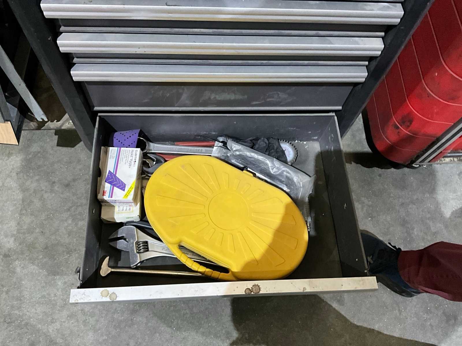 Inhoudende partij divers handgereedschap waaronder: Dopsleutelsets, ring-/steeksleutels, schroevendraaiers, tangen en enige boren Nee Merk: Westward Model: 7-laden Lengte: 72cm Breedte: 46cm Hoogte: 100cm Materiaal: Metaal