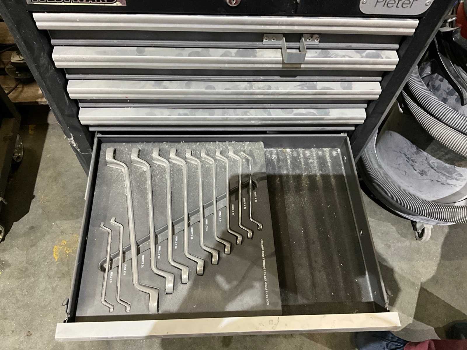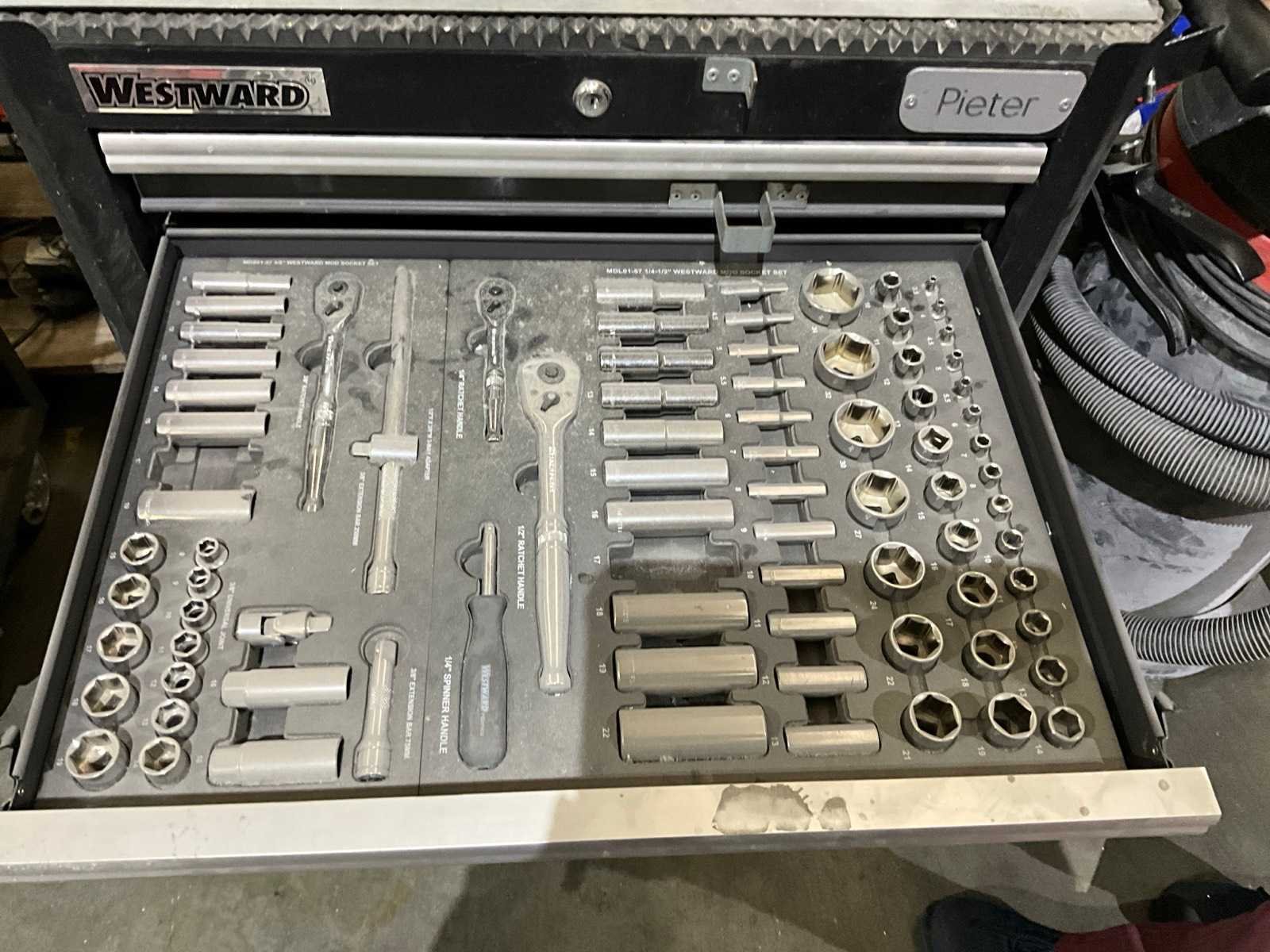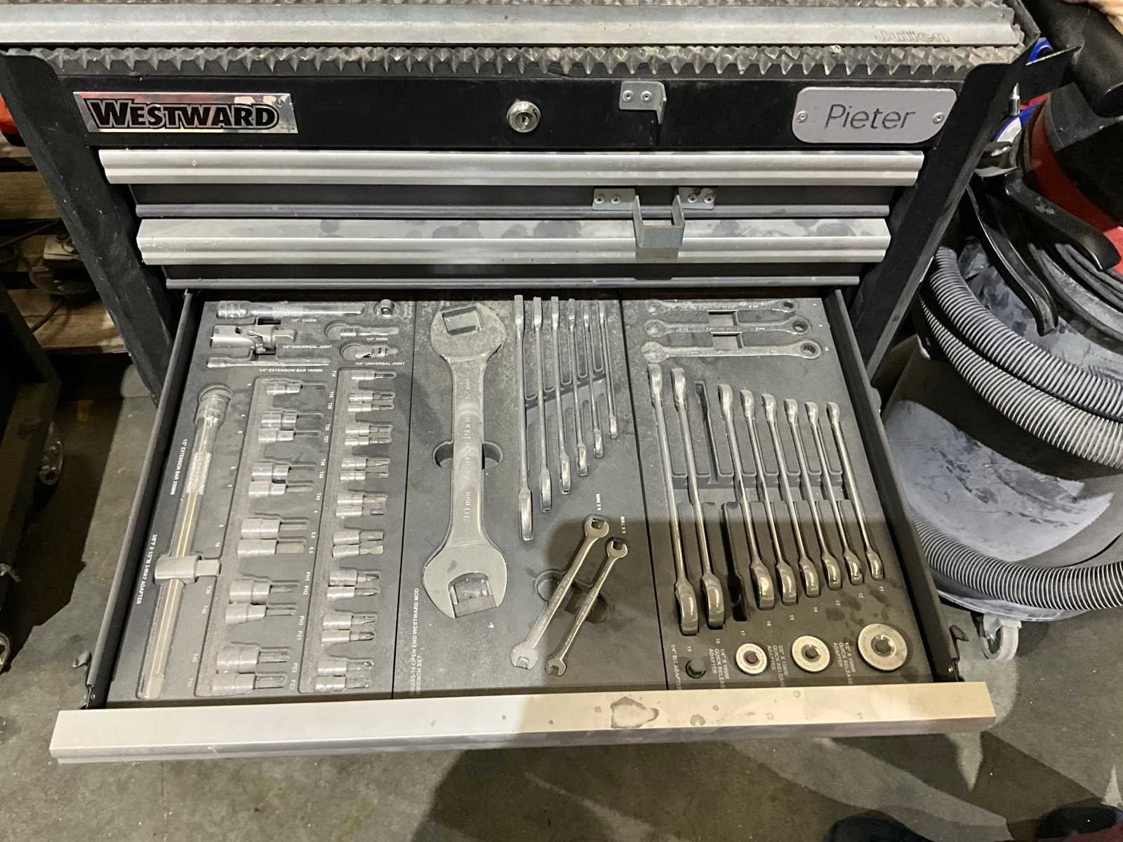 Inhoudende partij divers handgereedschap waaronder: Dopsleutelsets, ring-/steeksleutels, schroevendraaiers, tangen en ratelsleutels Nee Merk: Westward Model: 7-laden Lengte: 72cm Breedte: 46cm Hoogte: 100cm Materiaal: Metaal