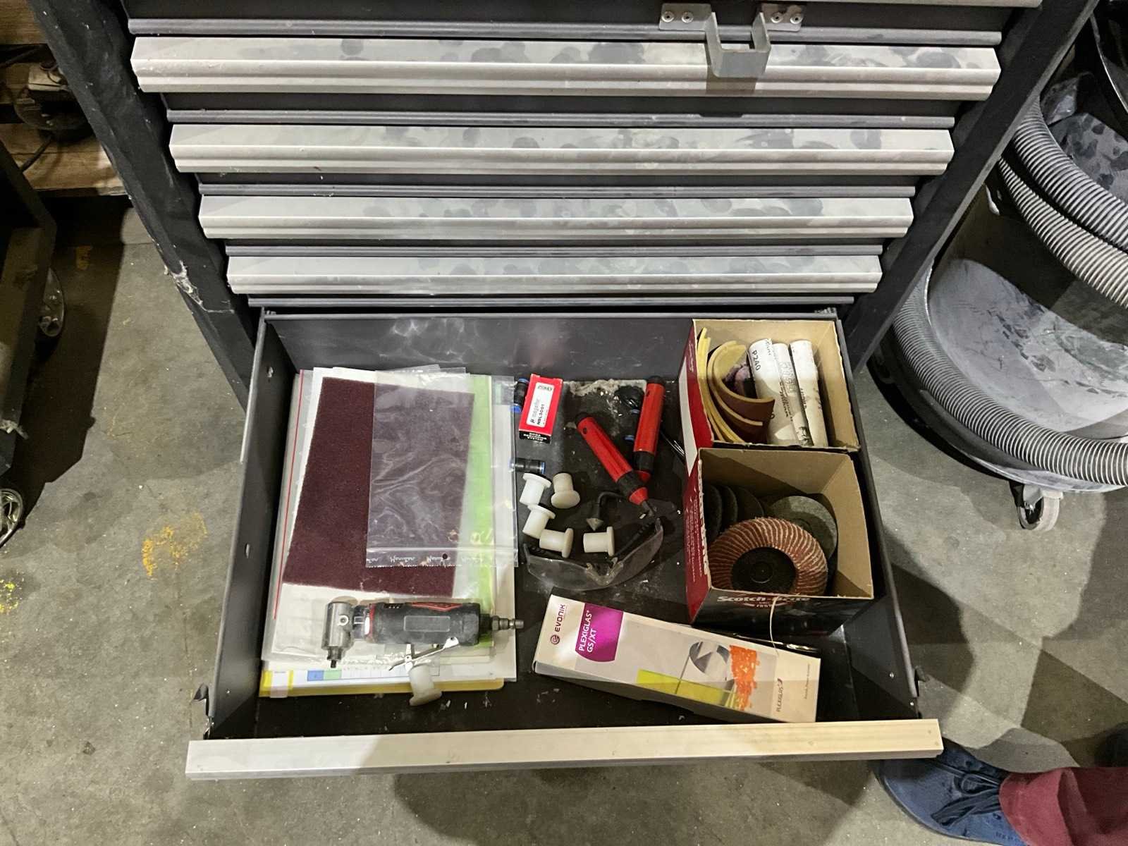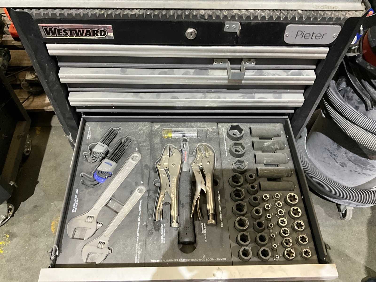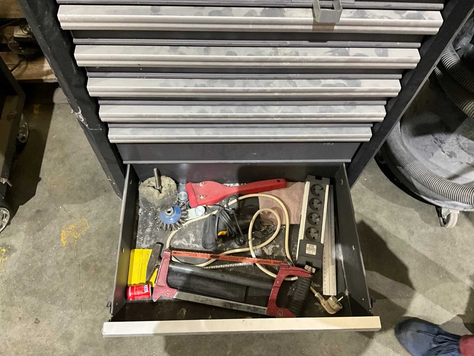 Inhoudende partij divers handgereedschap waaronder: Dopsleutelsets, ring-/steeksleutels, schroevendraaiers, tangen en ratelsleutels Nee Merk: Westward Model: 7-laden Lengte: 72cm Breedte: 46cm Hoogte: 100cm Materiaal: Metaal