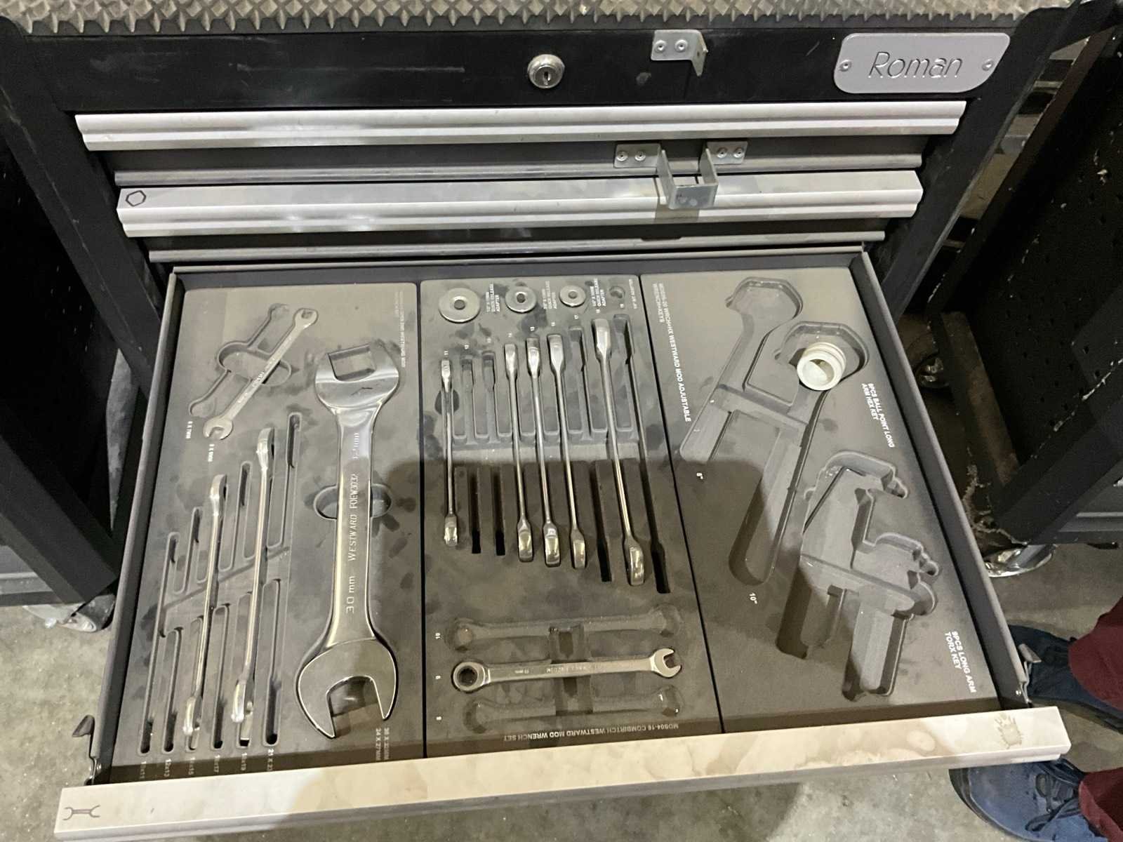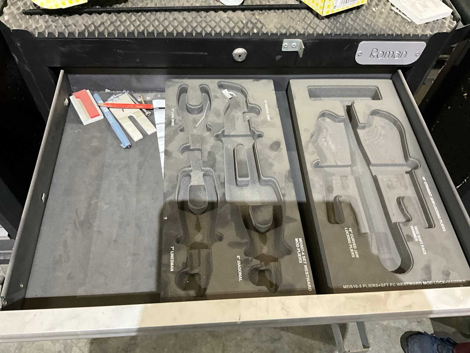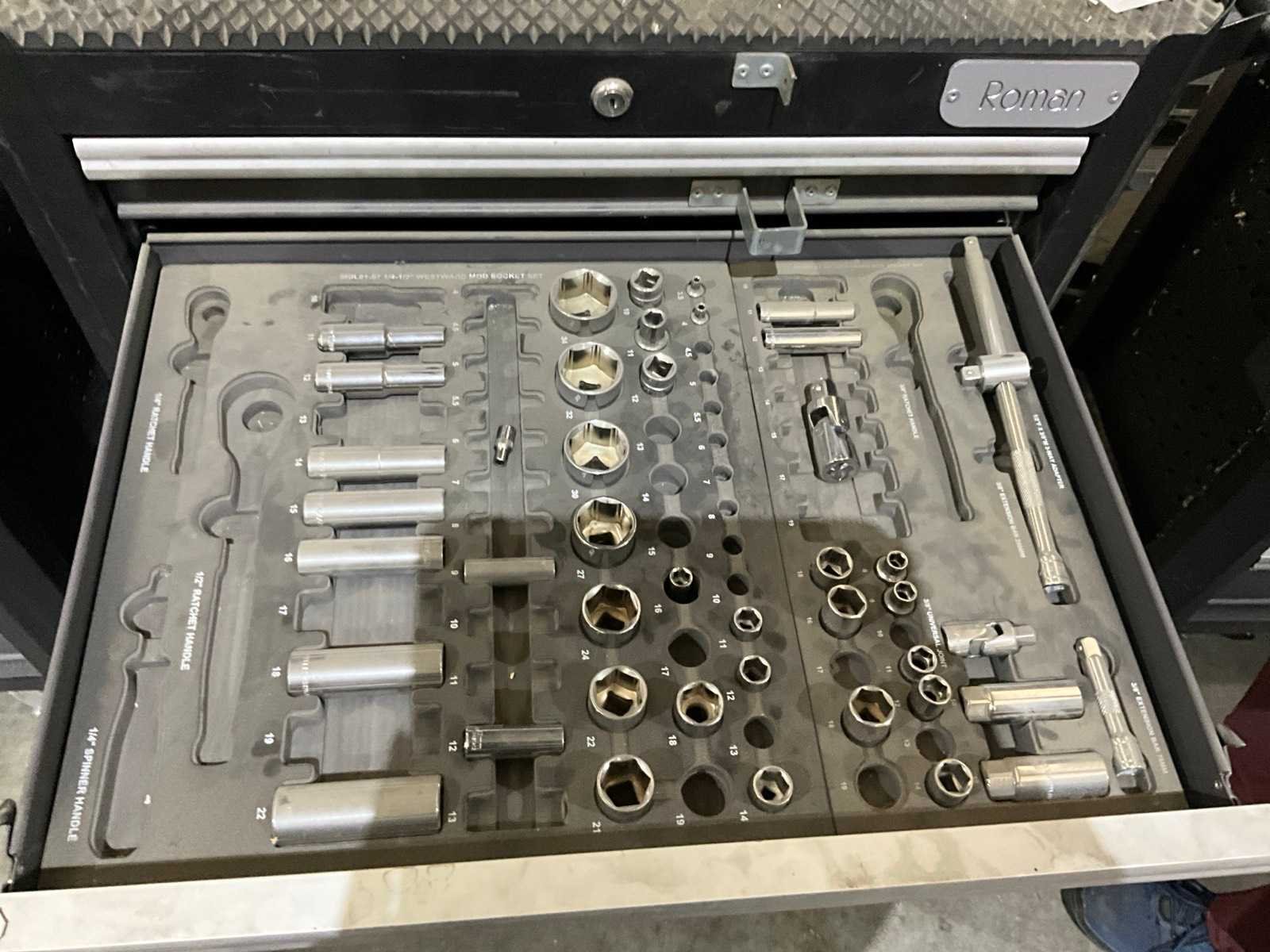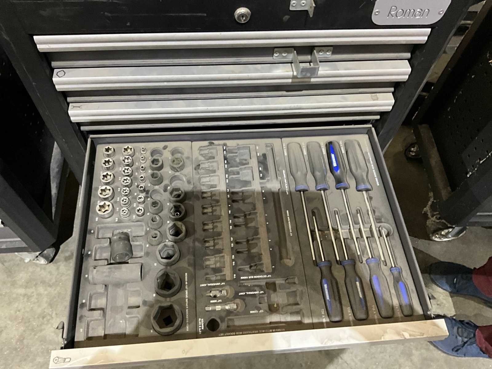 Inhoudende partij divers handgereedschap waaronder: Dopsleutelsets, ring-/steeksleutels, schroevendraaiers Nee Merk: Westward Model: 7-laden Lengte: 72cm Breedte: 46cm Hoogte: 100cm Materiaal: Metaal