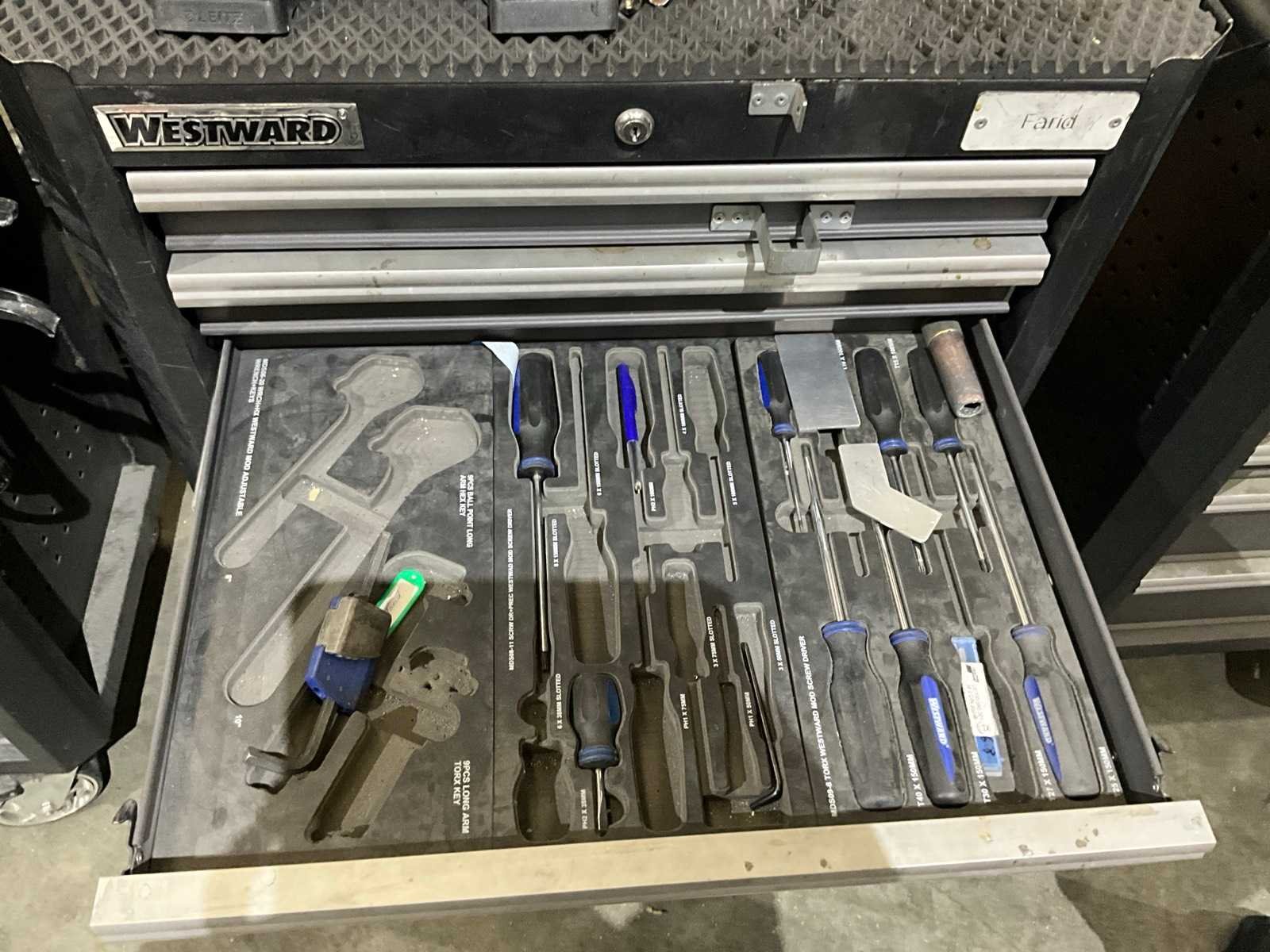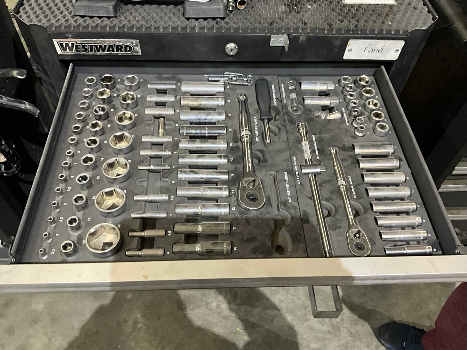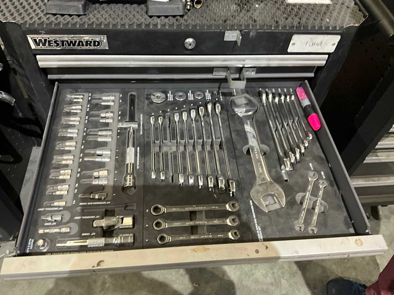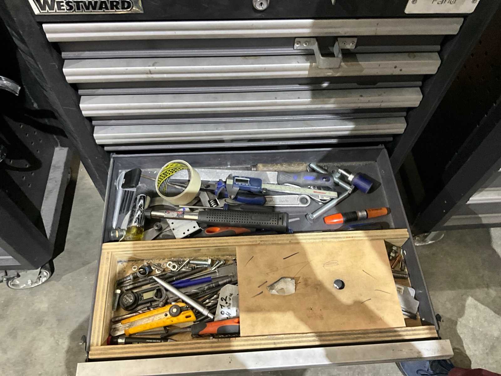Inhoudende partij divers handgereedschap waaronder: Dopsleutelsets, ring-/steeksleutels, schroevendraaiers, ratelsleutels, tangen, klemmen en hamers Nee Merk: Westward Model: 7-laden Lengte: 72cm Breedte: 46cm Hoogte: 100cm Materiaal: Metaal