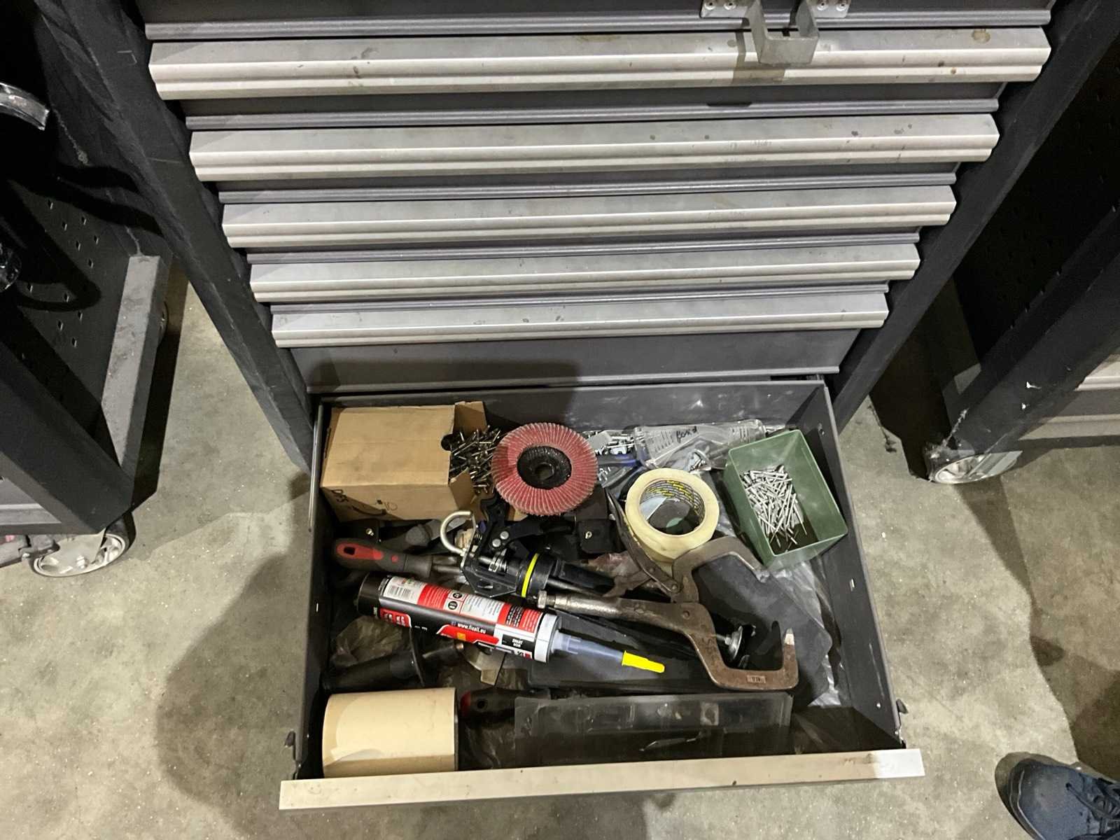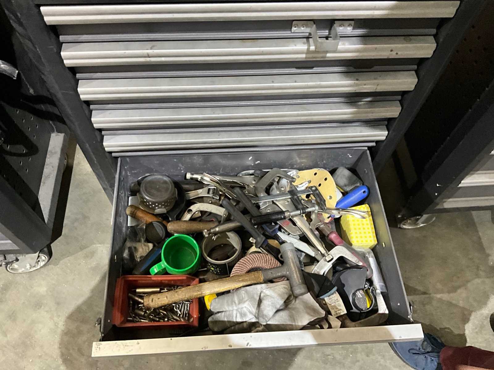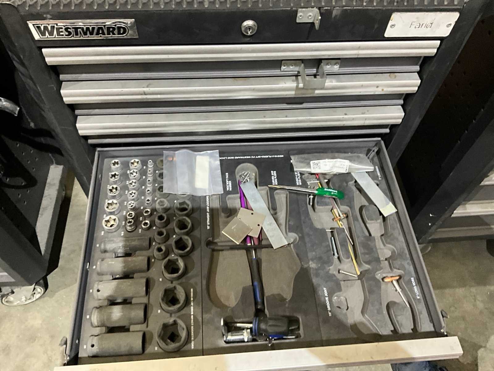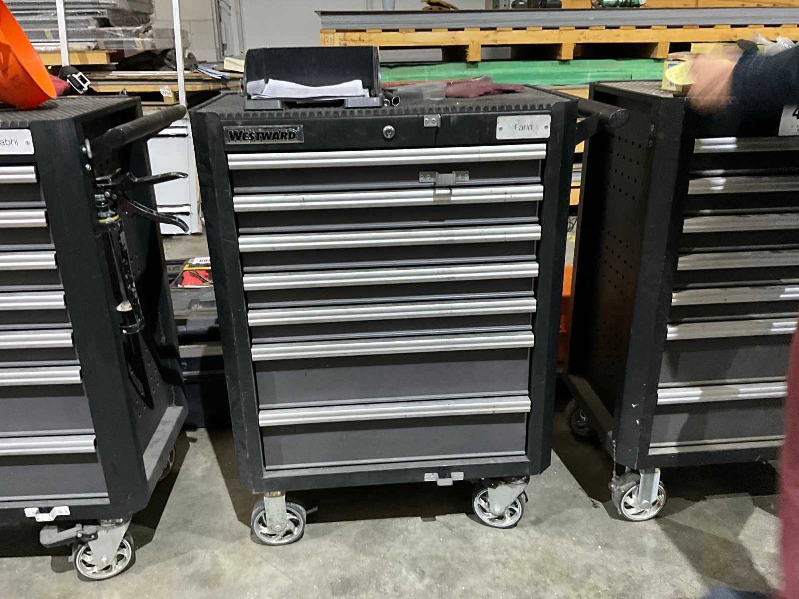 Inhoudende partij divers handgereedschap waaronder: Dopsleutelsets, ring-/steeksleutels, schroevendraaiers, ratelsleutels, tangen, klemmen en hamers Nee Merk: Westward Model: 7-laden Lengte: 72cm Breedte: 46cm Hoogte: 100cm Materiaal: Metaal
