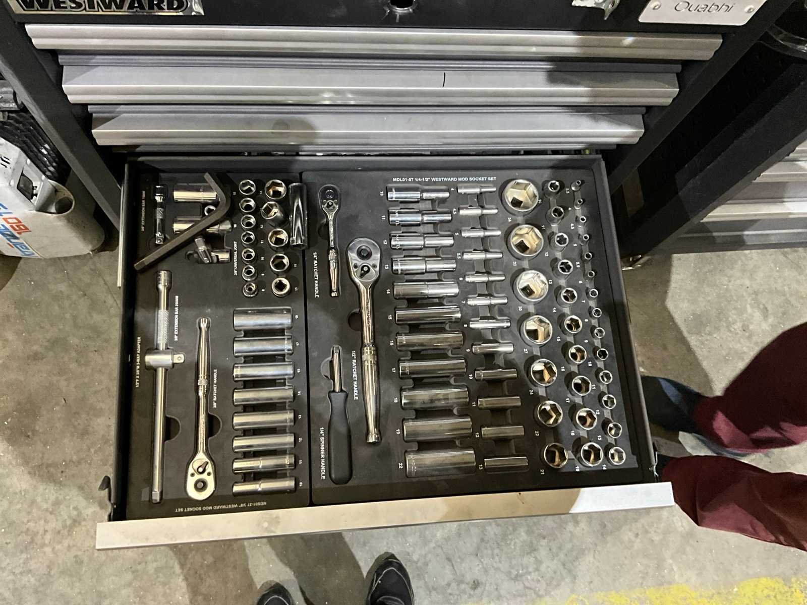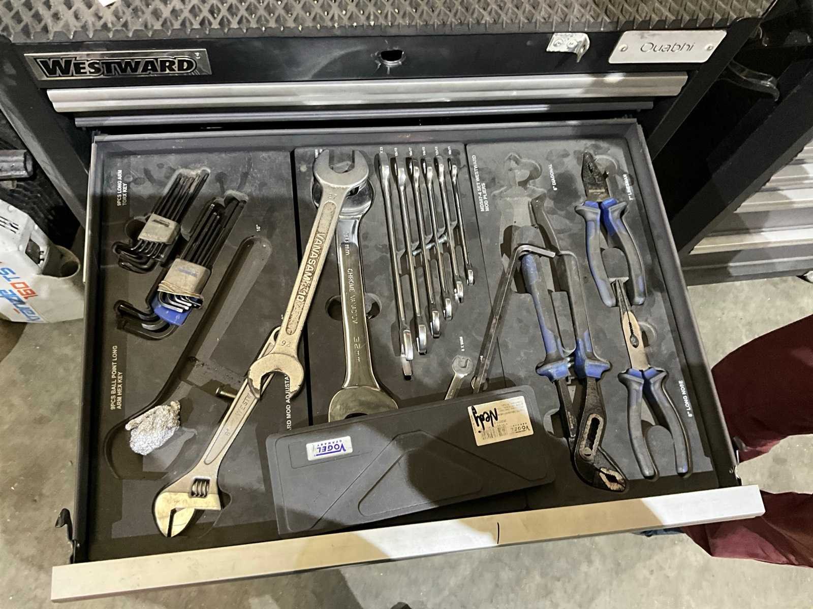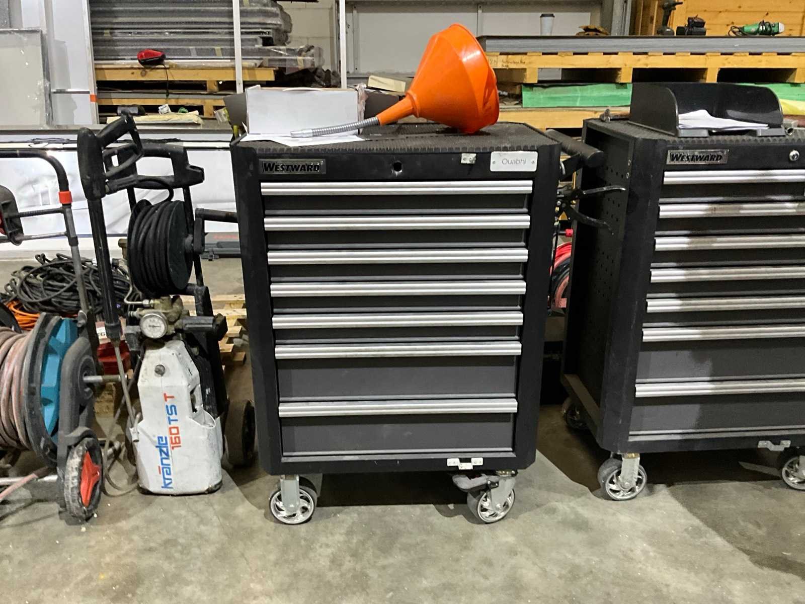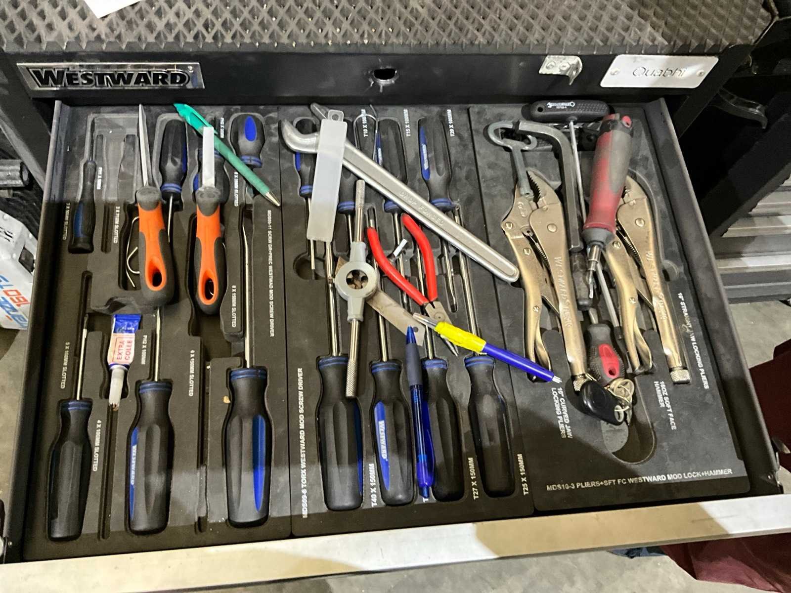 Inhoudende partij divers handgereedschap waaronder: Dopsleutelsets, ring-/steeksleutels, schroevendraaiers, ratelsleutels, tangen, klemmen en hamers Nee Merk: Westward Model: 7-laden Lengte: 72cm Breedte: 46cm Hoogte: 100cm Materiaal: Metaal