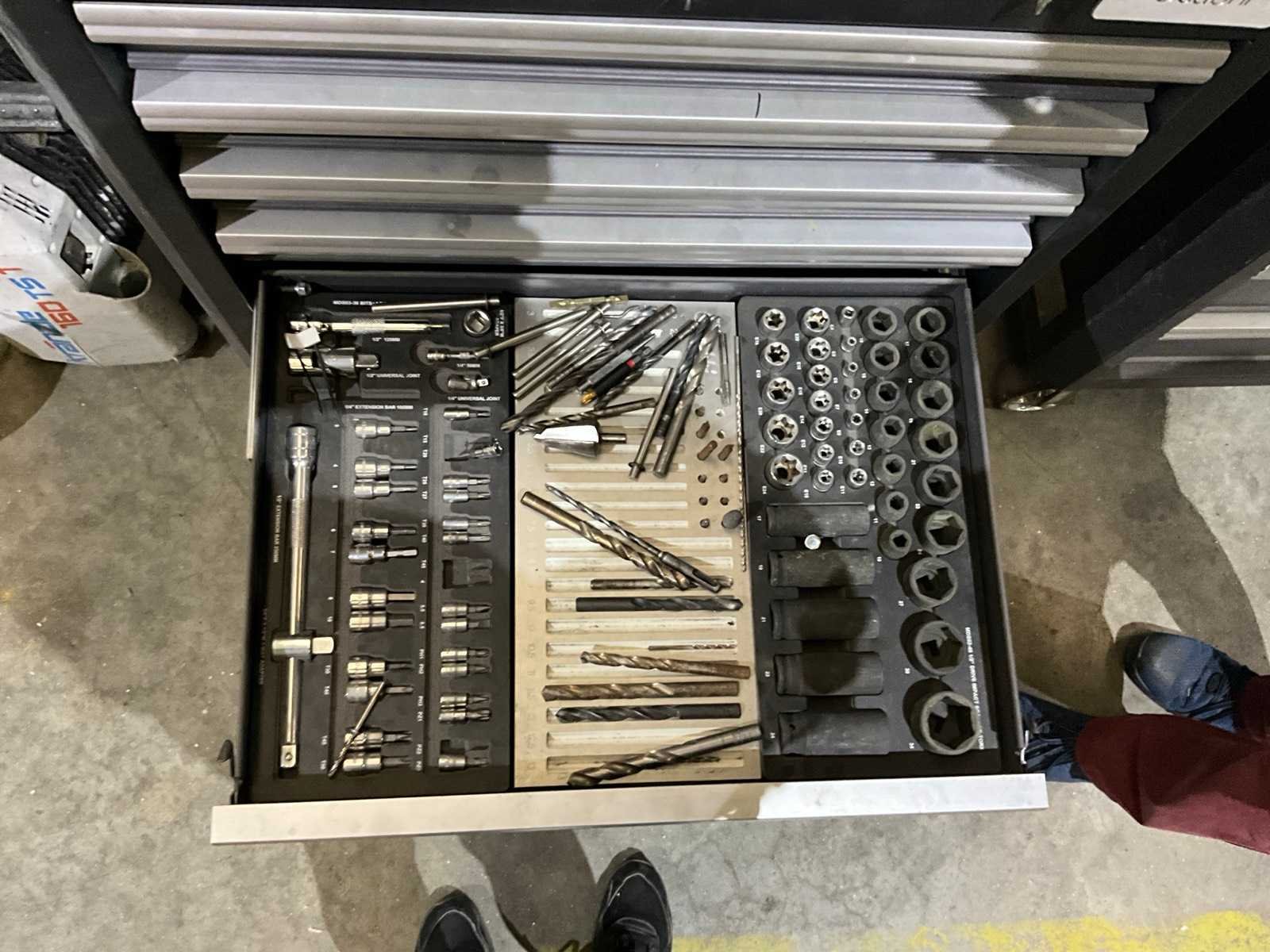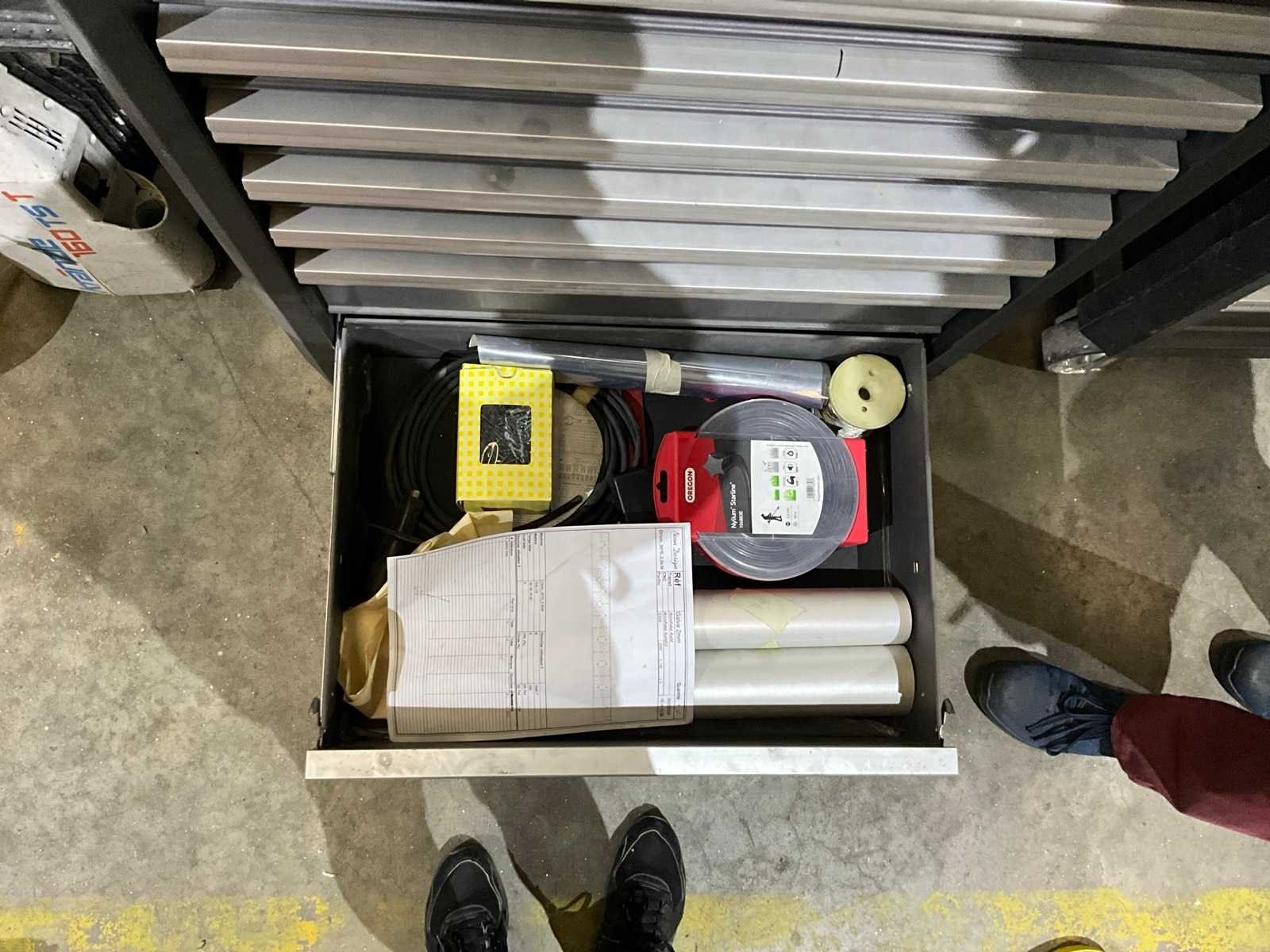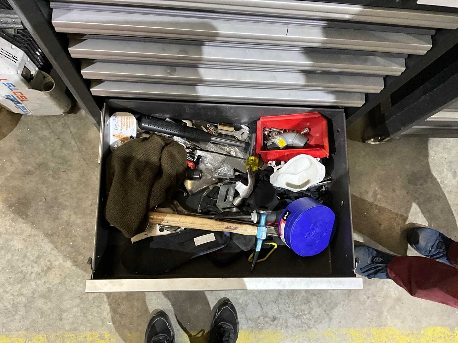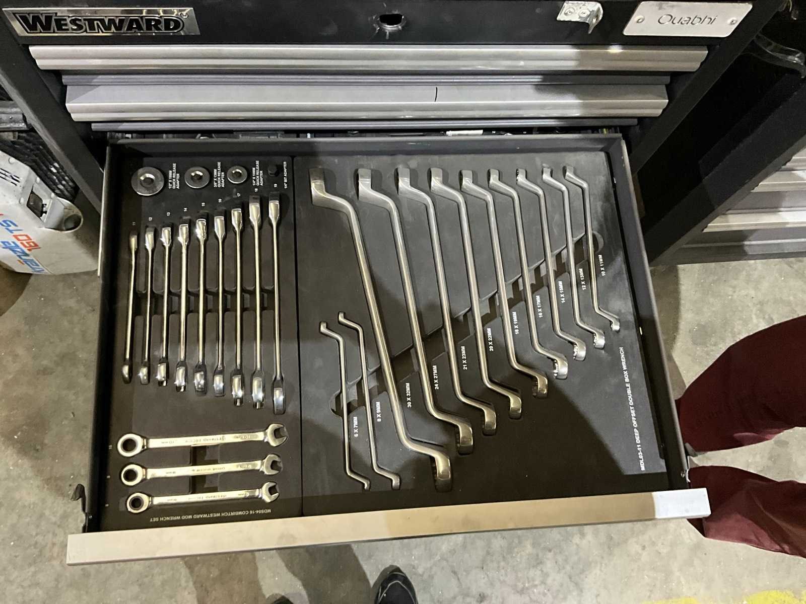 Inhoudende partij divers handgereedschap waaronder: Dopsleutelsets, ring-/steeksleutels, schroevendraaiers, ratelsleutels, tangen, klemmen en hamers Nee Merk: Westward Model: 7-laden Lengte: 72cm Breedte: 46cm Hoogte: 100cm Materiaal: Metaal