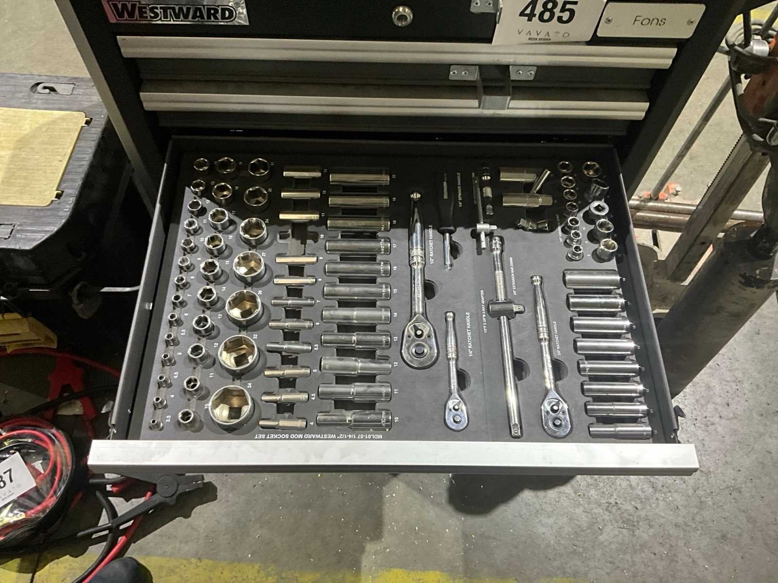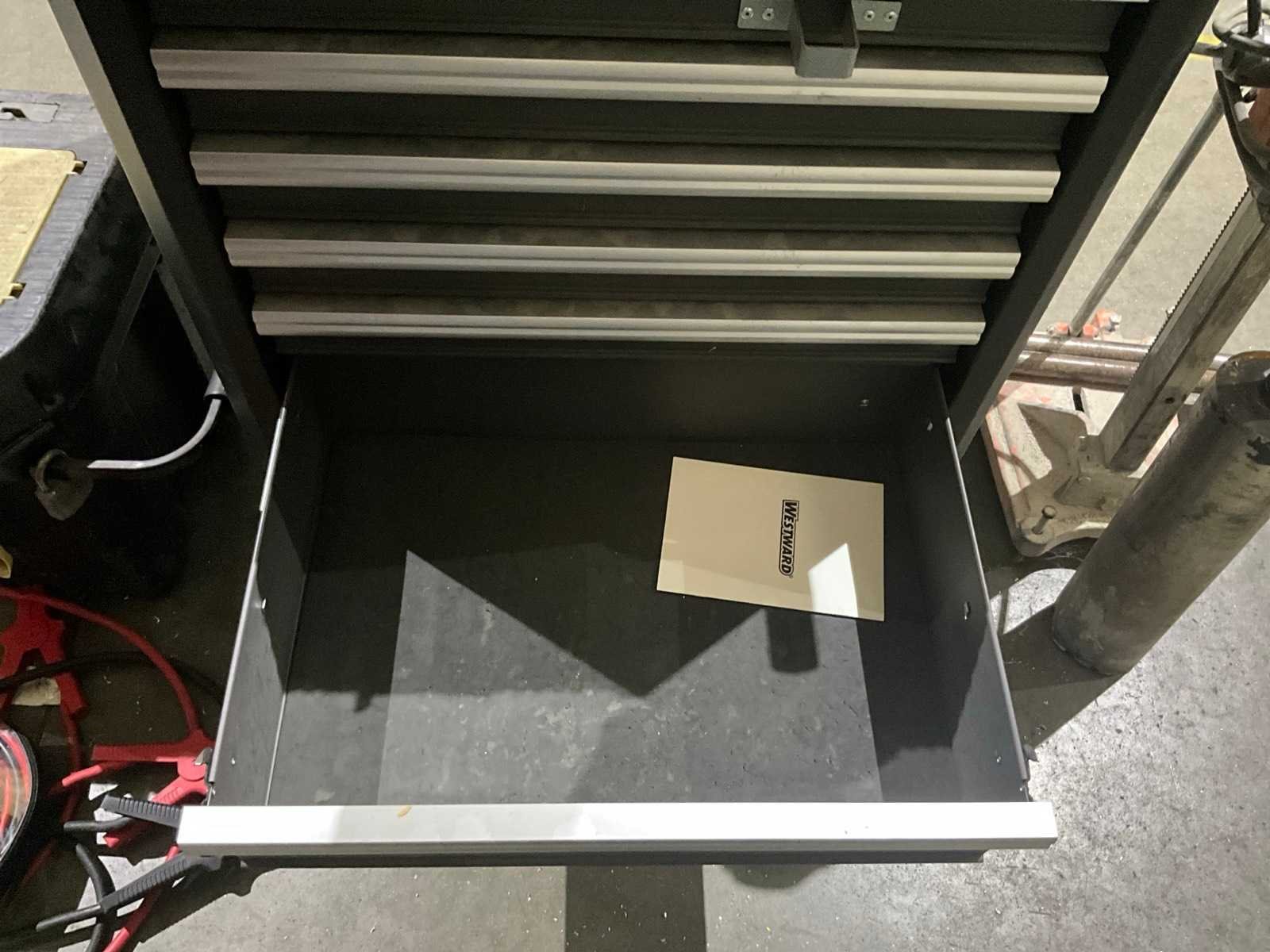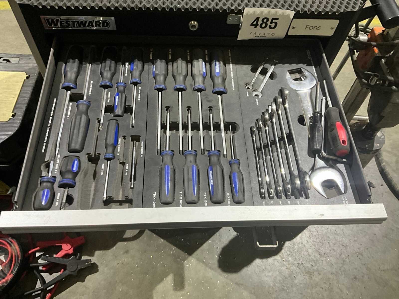Compleet met inhoud waaronder steek-/ringsleutel, dopsleutels, tangen,enzovoort Nee Merk: WESTWARD Model: 7-laden Lengte: 73cm Breedte: 47cm Hoogte: 100cm Materiaal: Metaal