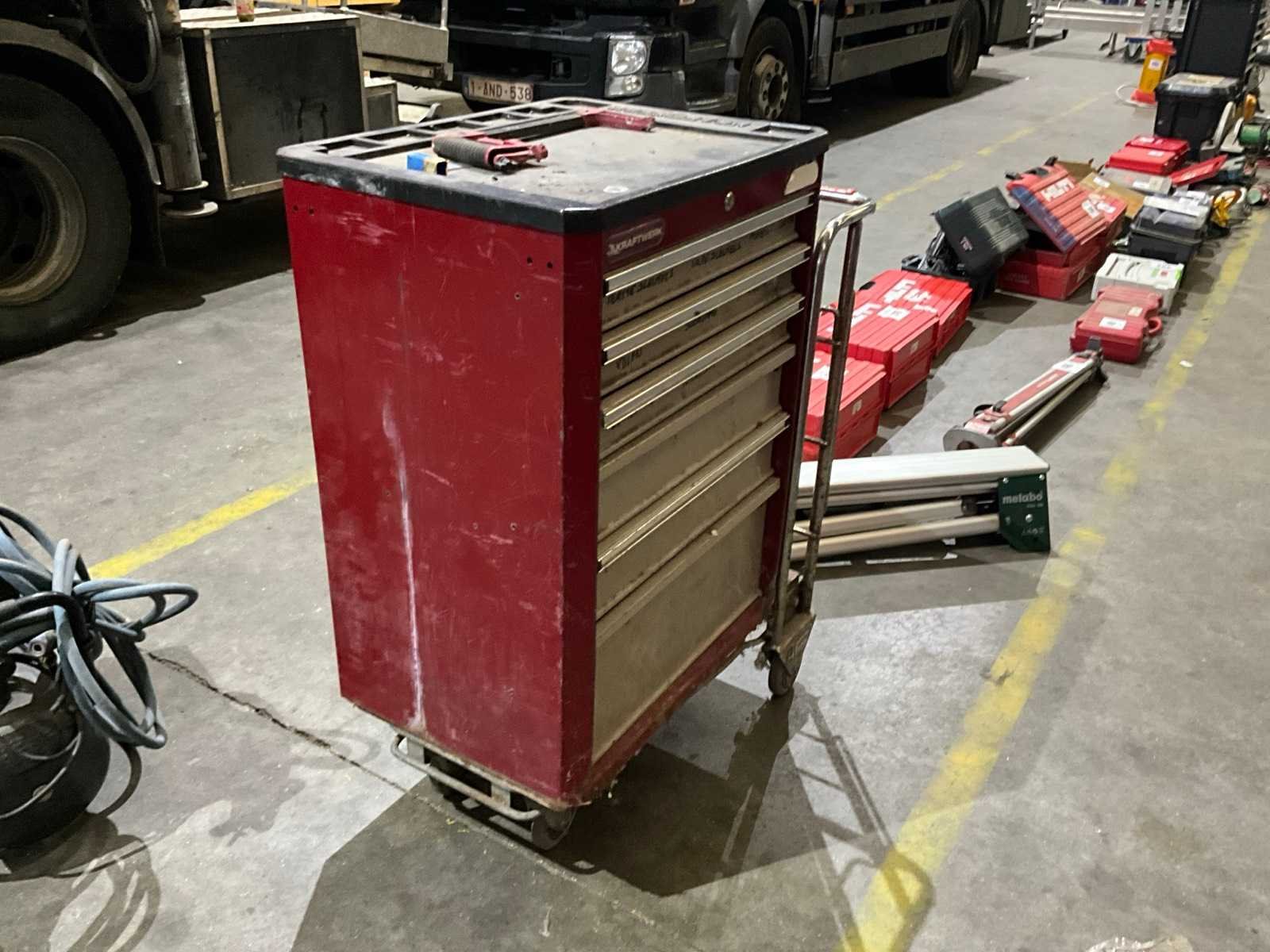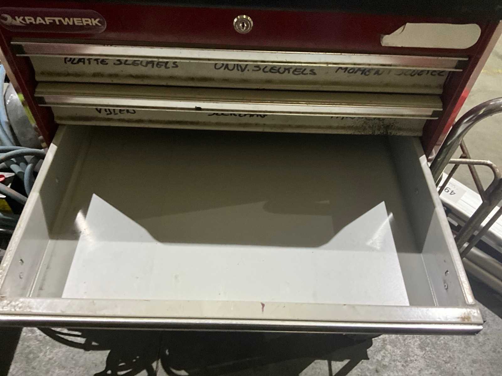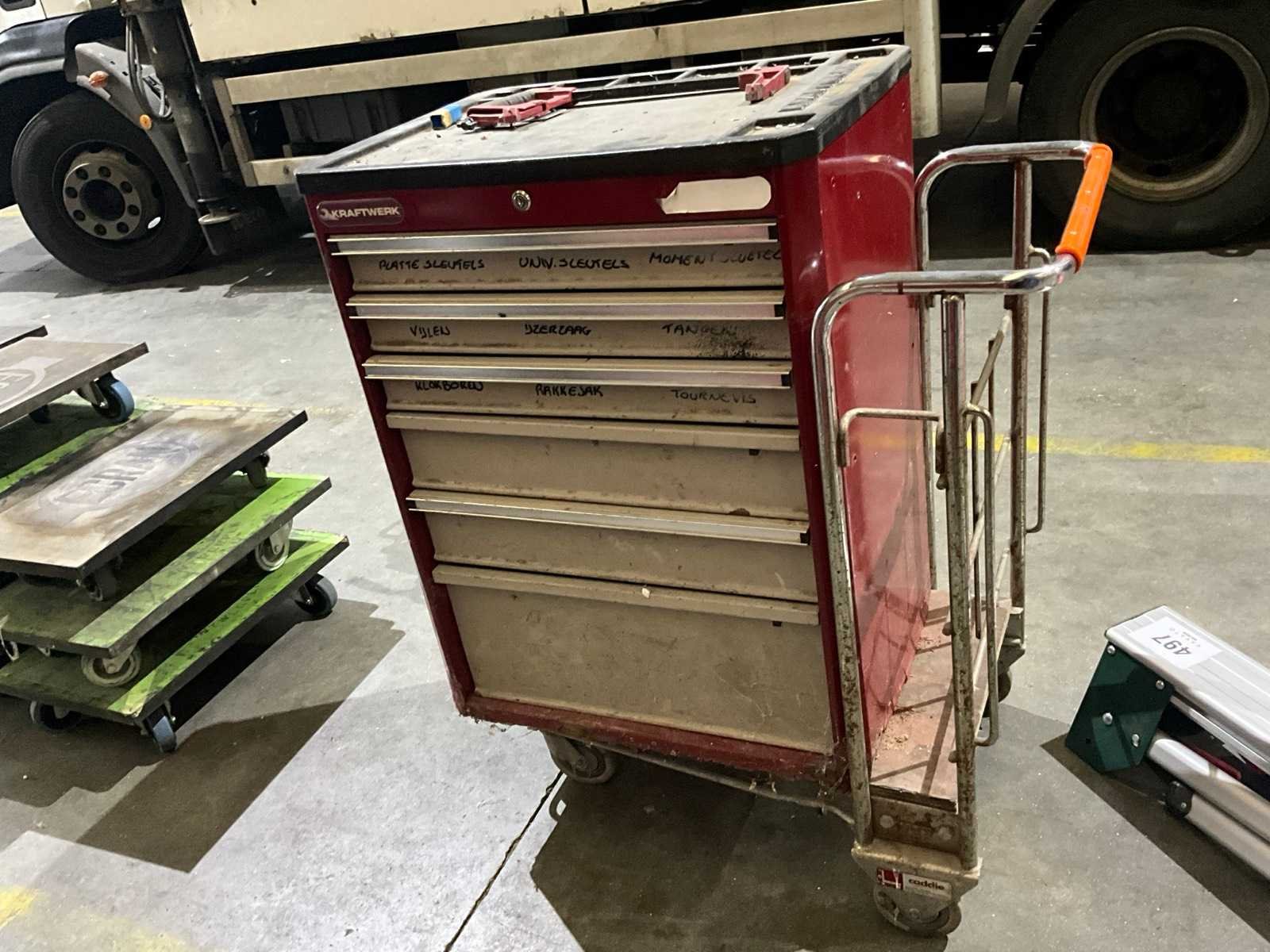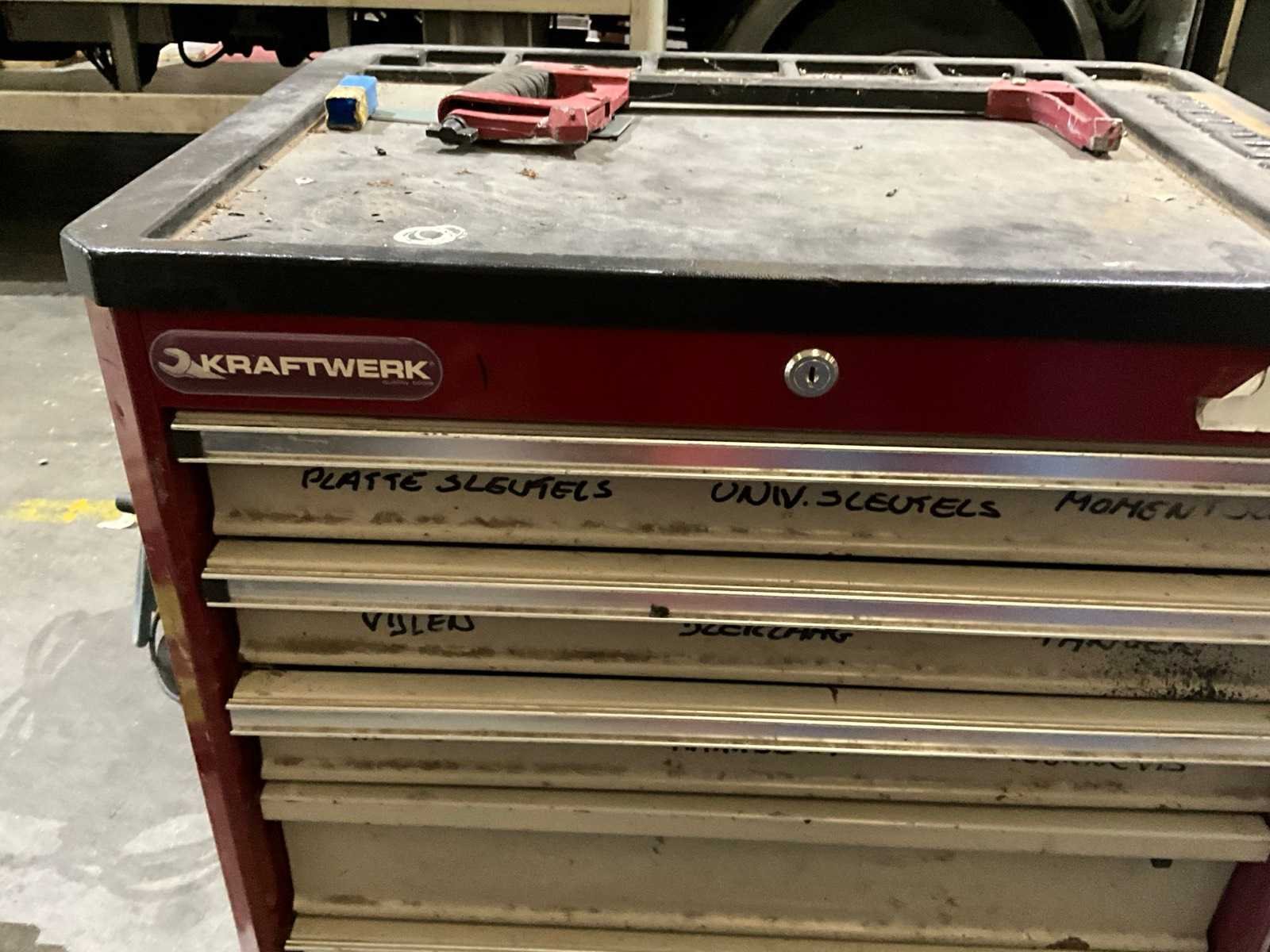 Op kar gemonteerd Compleet met inhoud waaronder enig steeksleutels en schroevendraaiers Nee Merk: KRAFTWERK Model: 6-laden Lengte: 88cm Breedte: 48cm Hoogte: 105cm Materiaal: Metaal
