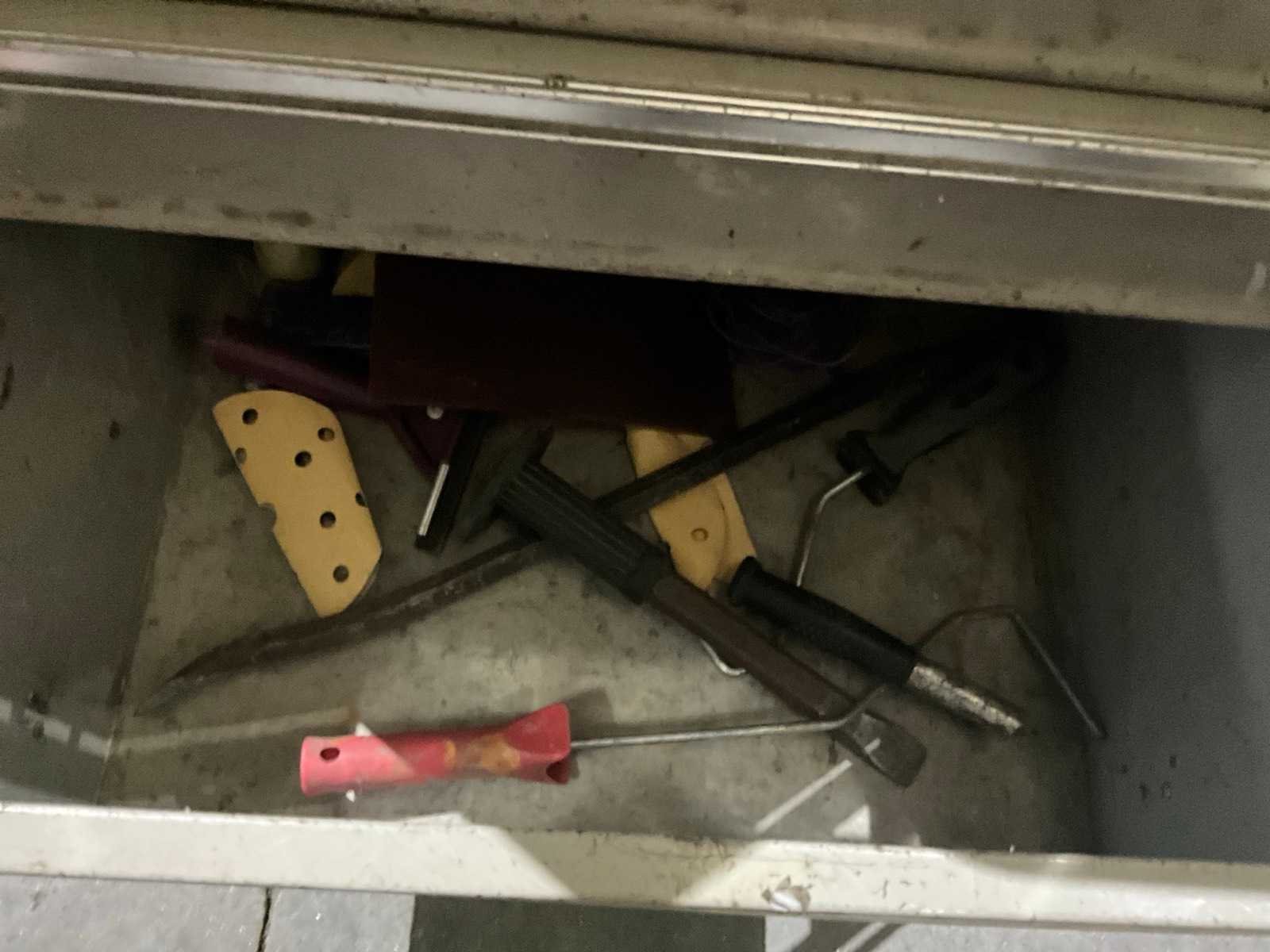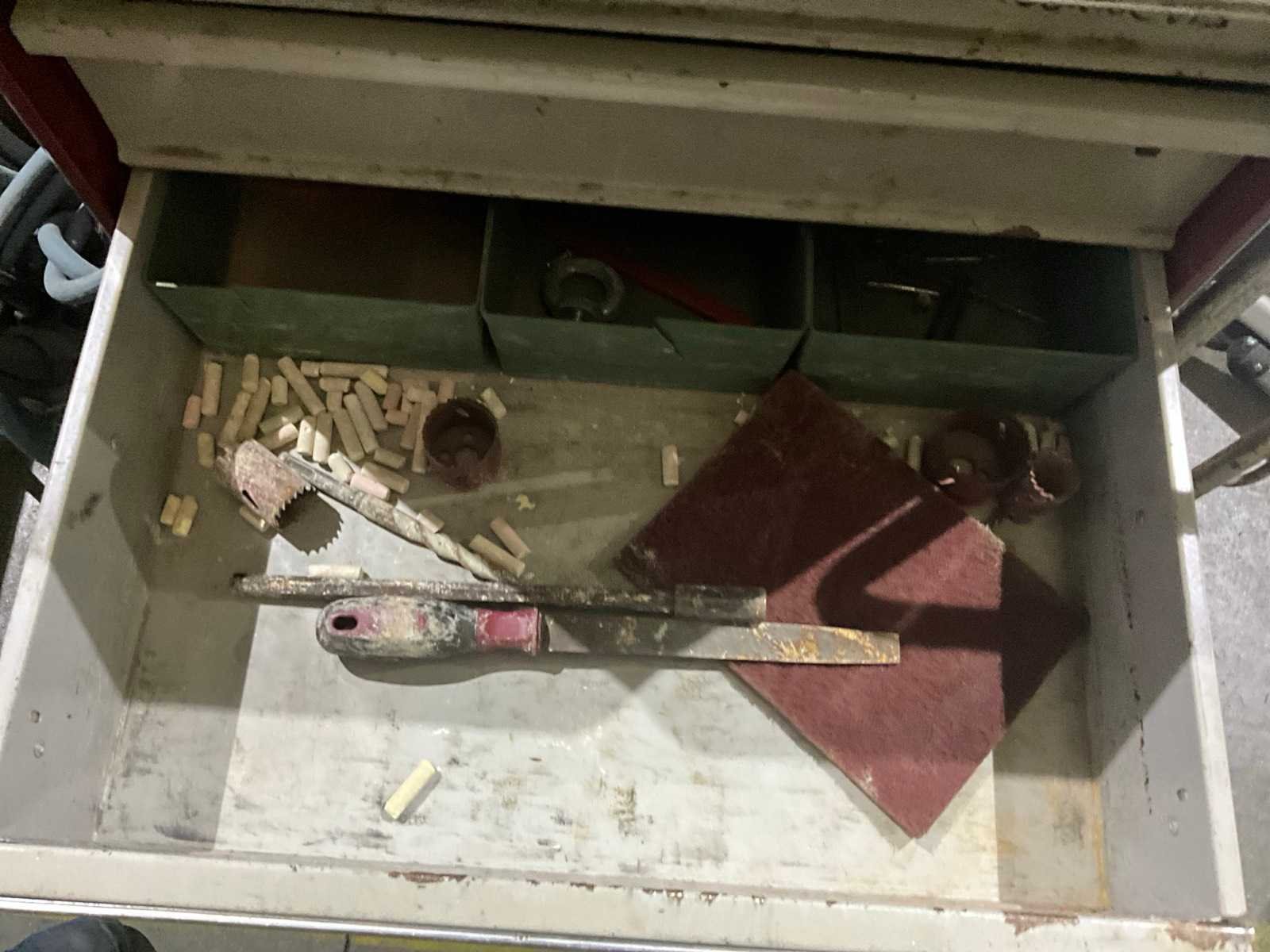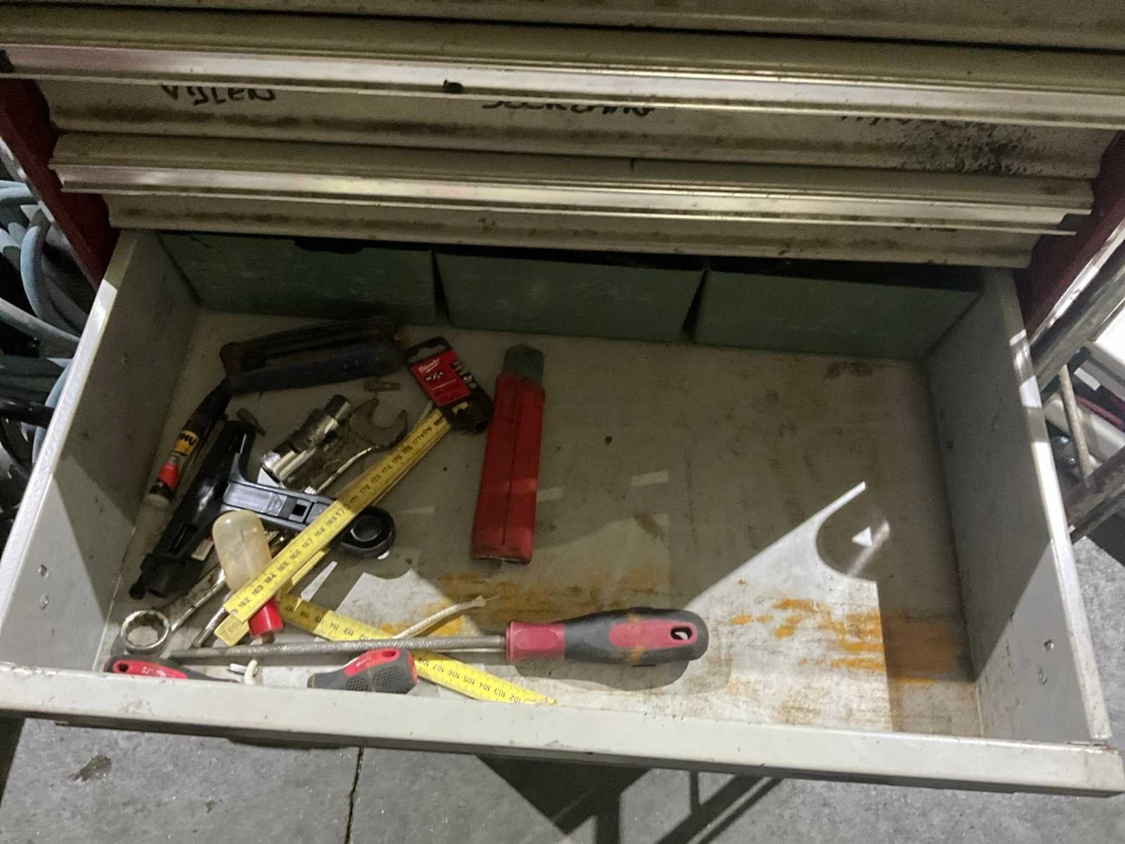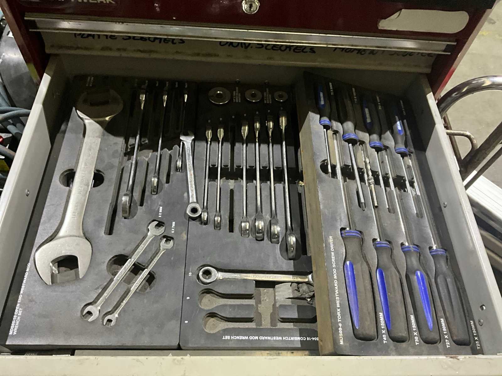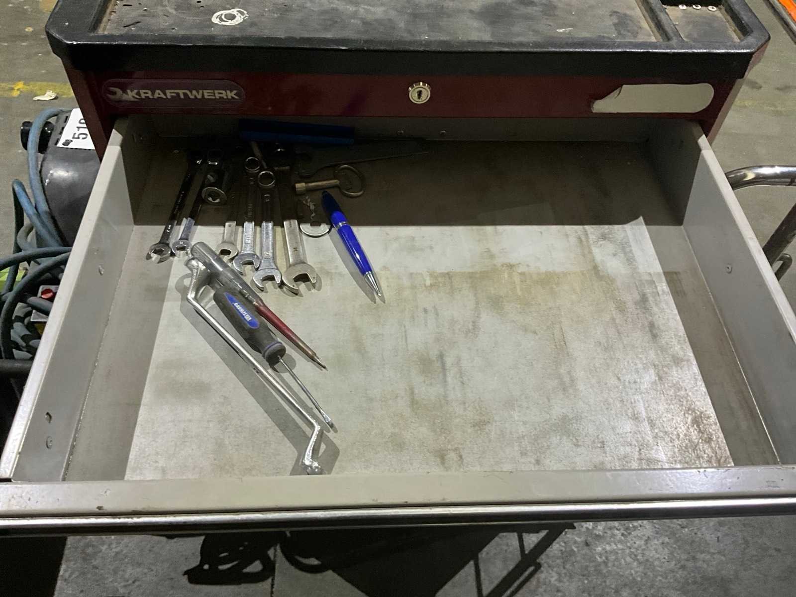 Op kar gemonteerd Compleet met inhoud waaronder enig steeksleutels en schroevendraaiers Nee Merk: KRAFTWERK Model: 6-laden Lengte: 88cm Breedte: 48cm Hoogte: 105cm Materiaal: Metaal