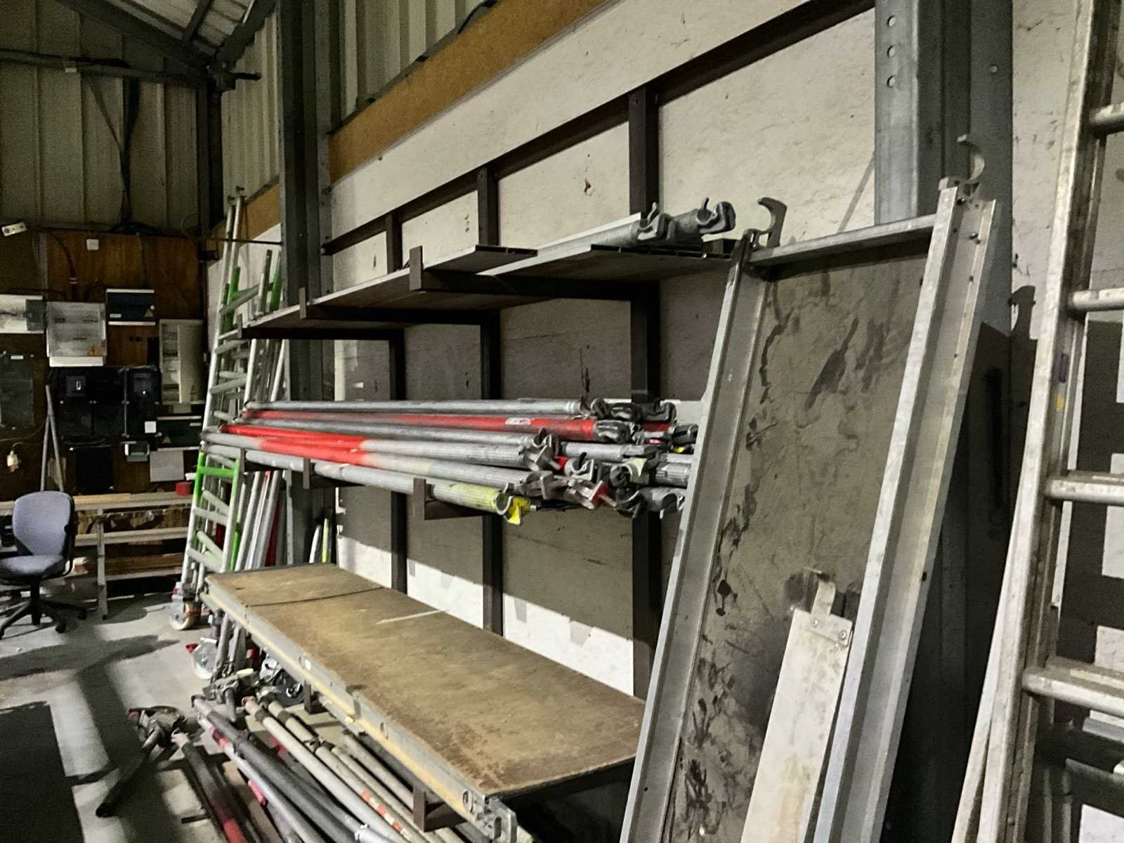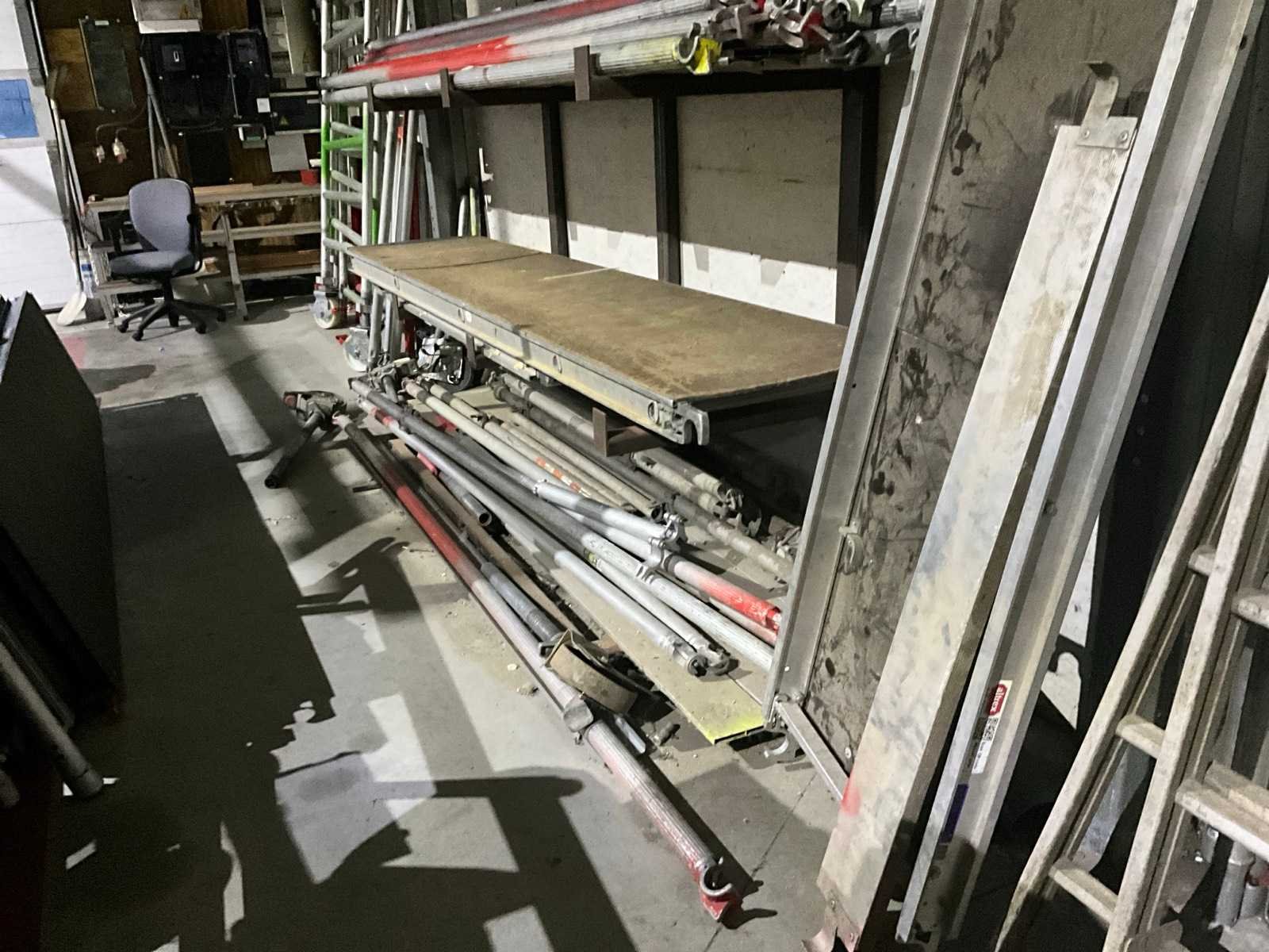 Waaronder 2 staanders voorzien van wielen elk 132 cm breed en 250 cm hoog, 8 diverse staanders elk van 132 cm breed induceren hoogtes van 115 tot 275 cm hoog, 5 diverse loopplanken waaronder van 280 tot 300 cm lang en 60 cm breed, 6 wielelementen, en divers toebehoren waaronder diagonalen, steunelementen en diverse wielelementen in houtenpaletringbox waaronder ALTREX Nee